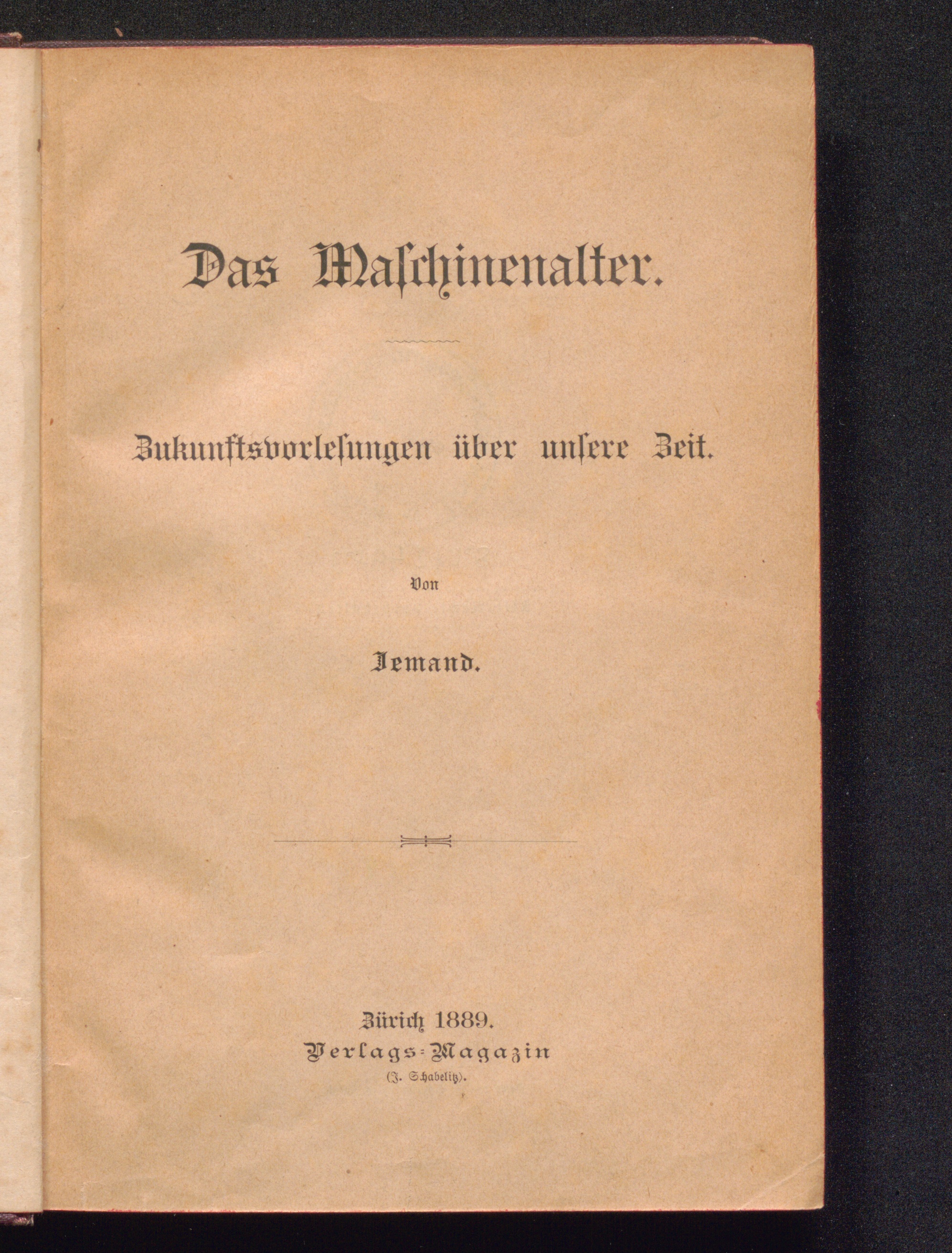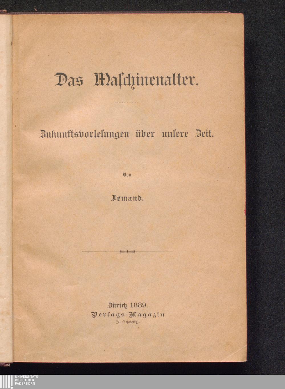 Das Maschinenalter : Zukunftsvorlesungen über unsere Zeit / von Jemand