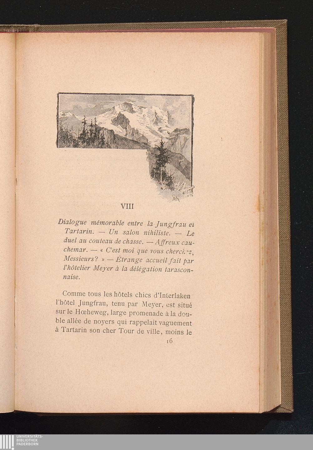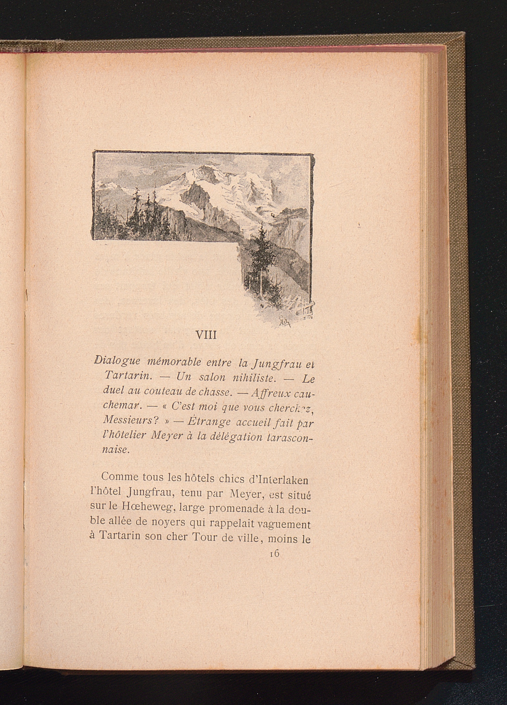 VIII Dialogue mémorable entre la Jungfrau et Tartarin. - Un salon nihiliste. - Le duel au couteau de chasse. - Affreux cauchemar. - "C'est, moi que vous cherchez, messieurs?" - Étrange accueil fait par l'hôtelier Meyer à la délégation tarasconnaise.