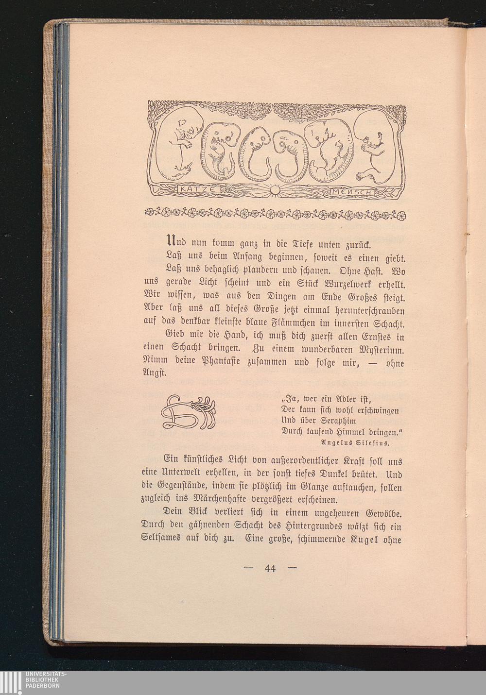 Ein Mysterium. - Hinab in die Tiefe! - Die geheimnisvolle Kugel. - In der Eizelle. - Die Begegnung der Samenzelle und der Eizelle. - Seeigel und Mensch. - Das Ergebnis der Verschmelzung. - Was man unter „Zelle" versteht. - Philosophie der Zeugung. - Die Enträtselung des Zeugungsvorgangs in der modernen Forschung. - Grundthatsachen des menschlichen Lebens. - Der Tod. - Die Zeugung als Form der Unsterblichkeit. - Die beiden Prinzipien der Unsterblichkeit. - Individuelle Unsterblichkeit. - Unsterblichkeit ...