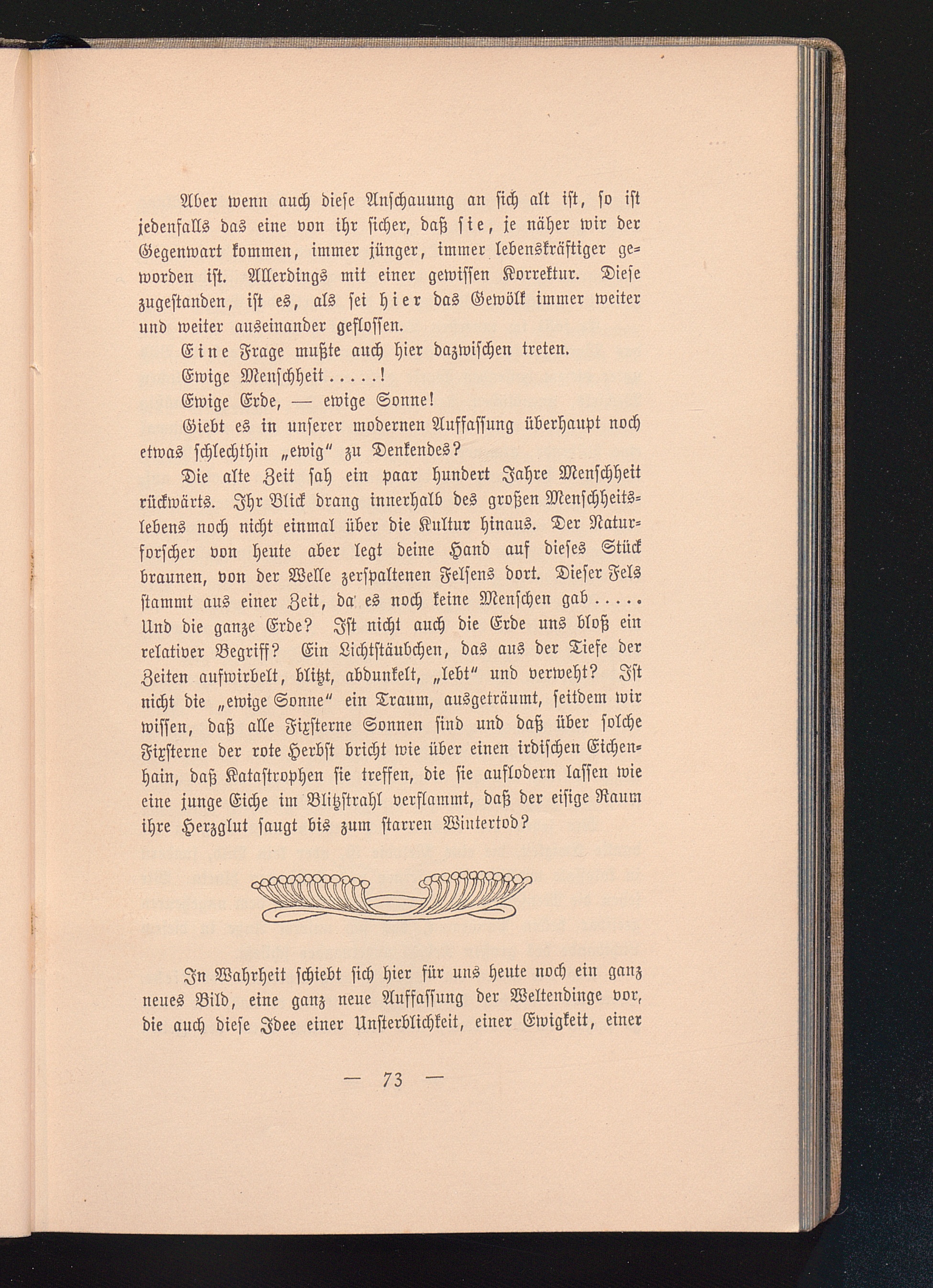 Urzeugung. - Ist die Liebe „entstanden"? - Der Geburtsakt der Liebe. - Die Sage von der Geburt der Aphrodite und die Affenabstammung. - Das Wunder der Schöpfung. - Das Anorganische und das Lebendige. - Der Kohlenstoff. - Das Leben als Grundeigenschaft der Materie. - Der Mensch als Ur=Bazillus einer neuen Zeit. - Geist und Stoff. - Der Begriff des Individuums. - Der Wassertropfen in der Höhle. - Erotische und mechanische Anziehung. - Die „Wahlverwandtschaften". - Der Atome Hassen und Liebe. - Die Liebe ...