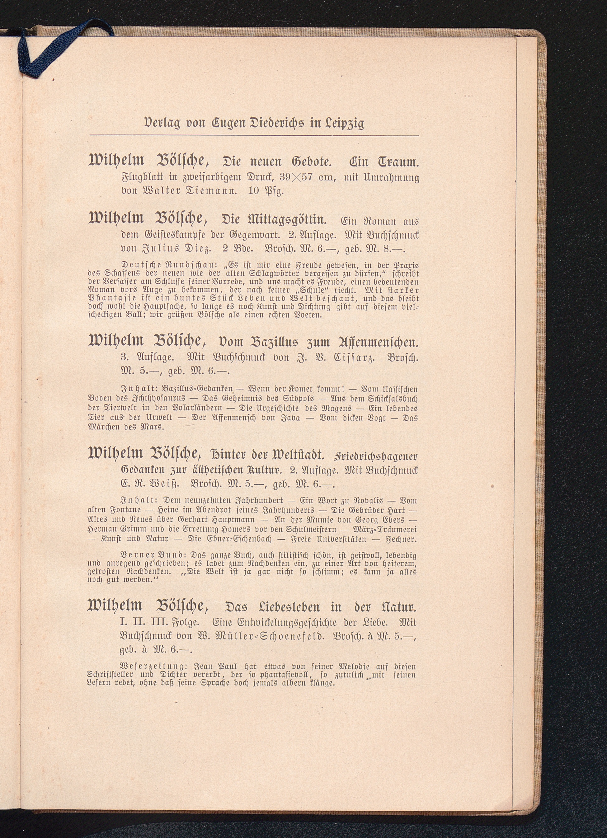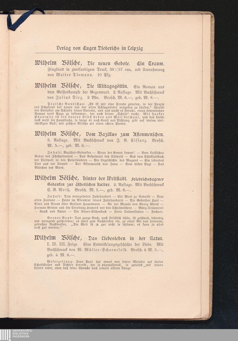 Der Begriff der Entwickelung. - Das Werden in der Liebe. - Das Märchen der modernen Naturforschung. - Die Meilenmillion. - Das Sternbild des Kentauren. - Die Zeitmillion. - Von Cheops zur Eiszeit. - Urzeit der Erde. - Ein neuer Himmel und eine neue Erde. - Die neue Liebe. - Im Stuttgarter Museum. - Das Liebesspiel der Ichthyosaurier. - Die Liebe der Mammute. - Das Megatherium. - Die Riesenschildkröte. - Das Rückenmark des Atlantosaurus. - Vom Ur=Vogel und seiner Liebe. - Der letzte Strand. ...