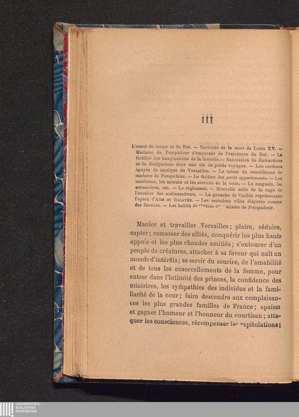 VIII L'ambition d'immortalité de la favorite. - Ses rapports avec Voltaire, Rousseau, Crébillon père, Buffon, Montesquieu, Marmontel. - L'Encyclopédie apportée à un souper du Roi à Trianon. - Création d'une manufacture nationale de porcelaines. - Essais à Mennecy, à Villeroy, à Chantilly. - Transport de la fabrique de Vincennes à Servres . - Le rose pompadour inventé par Xhrouet. - Madame de Pompadour se fait vendeuse et marchande aux expositions du château de Versailles. - Foundation de l'École ...
