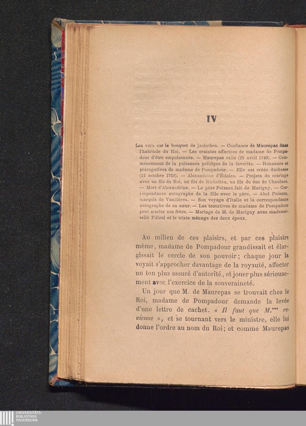 IV Les vers sur le bouquet de jacinthes. - Confiance de Maurepas dans l'habitude du Roi. - Les craintes affectées de madame de Pompadour d'etre empoisonnée. - Maurepas exilé (25 avril 1749). - Commencement de la puissance politique de la favorite. - Honneurs et prérogatives de madame de Pompadour. - Elle est créée duchesse (12 octobre 1752). - Alexandrine d'Etioles. - Projets de mariage avec un fils du Roi, un fils de Richelieu, un fils du duc de Chaulnes. - Mort d'Alexandrine. - Le père Poisson fait ...