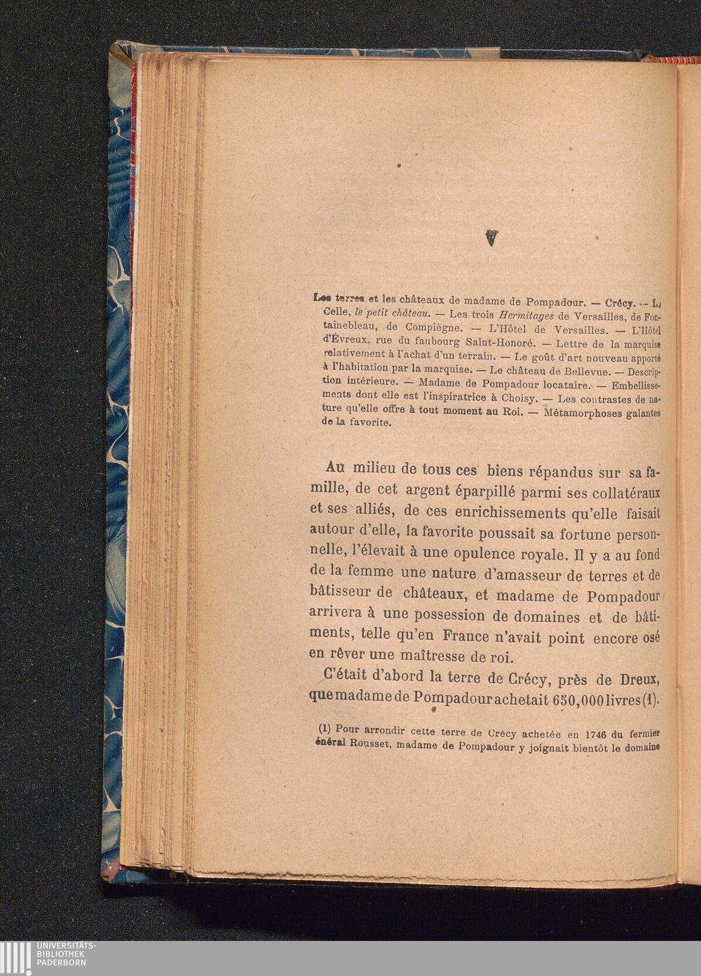 V Les terres et les châteax de madame de Pompadour. - Crécy. - La Celle, le petit château. - Les trois Hermitages de Versailles, de Fontainebleau, de Compiègne. - L'hôtel de Versailles. - L'hôtel d'Évreux, rue du faubourg Saint-Honoré. - Lettre de la marquise relativement à l'achat d'un terrain. - Le goût d'art nouveau apporté à l'habitation par la marquise. - Le château de Bellevue. - Description intérieure. - Madame de Pompadour locataire. - Embellissements dont elle est l'inspiratrice á Choisy ...