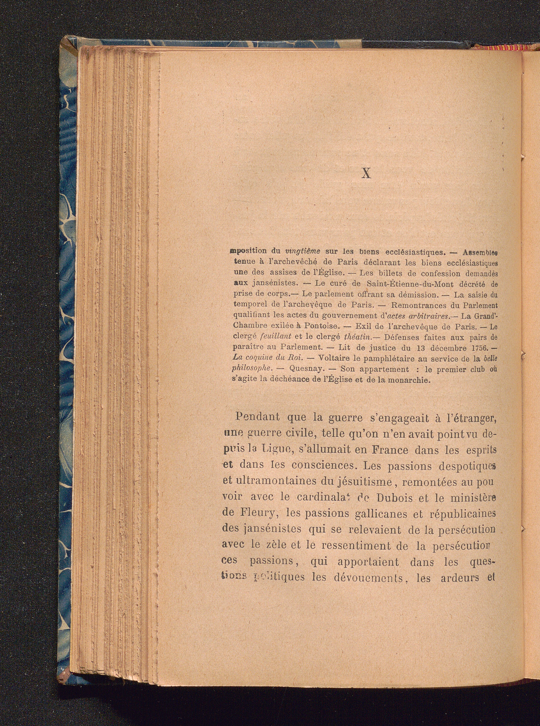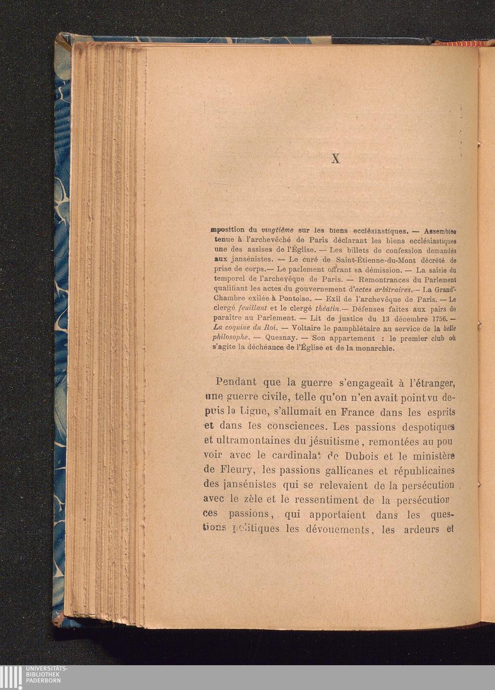 X Imposition du vingtième sur les biens ecclésiastiques. - Assemblée tenue à larchevêché de Paris déclarant les biens ecclésiastiques une des assises de l'Église. - Les billets de confession demandés aux Jansénistes. - Le curé de Saint-Étienne-du-Mont décrété de prise de corps. - Le parlement offrant sa démission. - La saisie du temporel de l'archevêque de Paris. - Remontrances du Parlament qualifiant les actes du gouvernement d'actes arbitraires. - La Grand' Chambre exilée à Pontoise. - Exil de ...