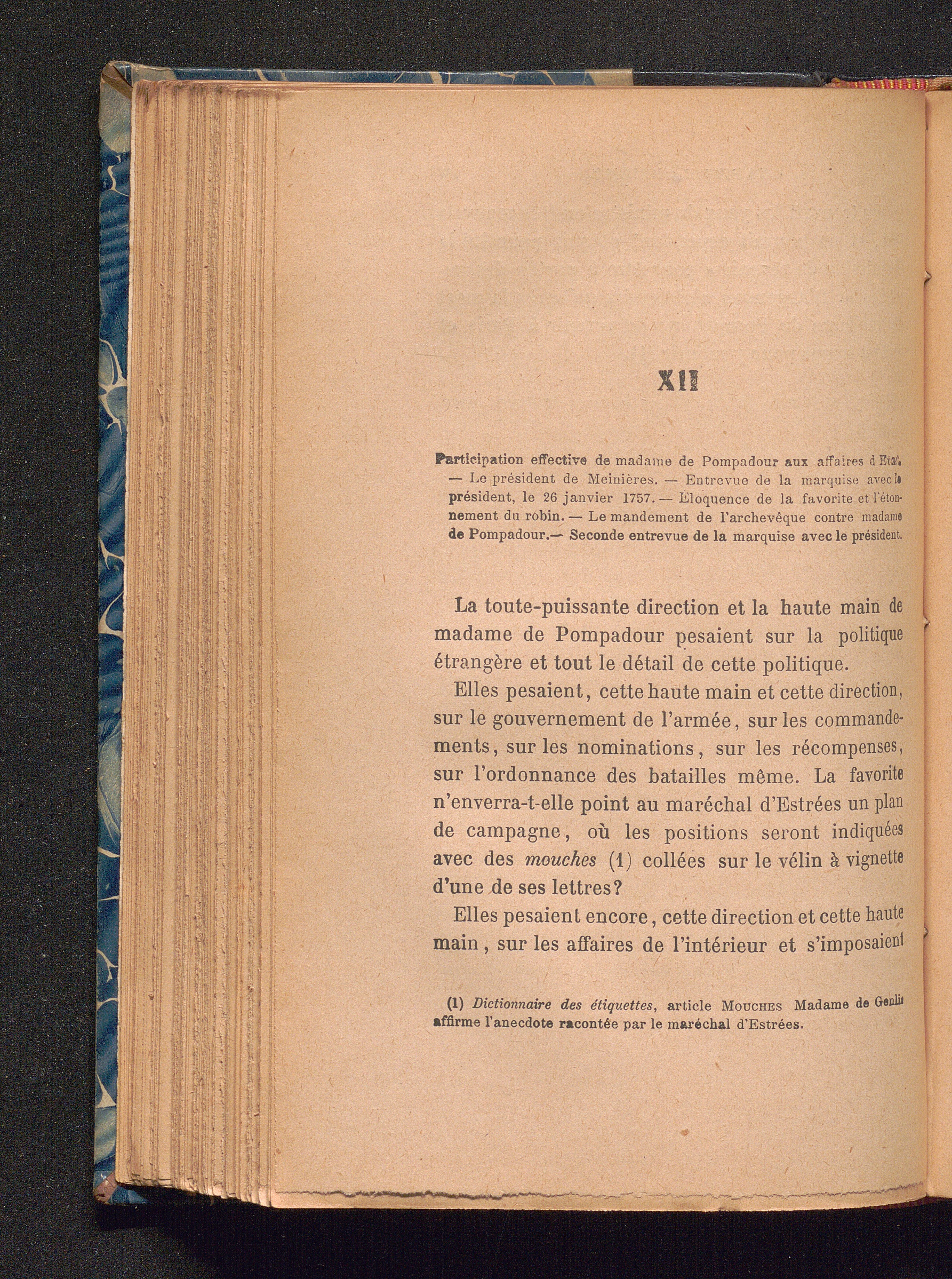 XII Participation effective de madame de Pompadour aux affaires d'Etat. - Le président de Meinières. - Entrevue de la marquise avec le président, du 26 janvier 1757. - Éloquence de la favorite et l'étonnement du robin. - Le mandement de l'archevêque contre madame de Pompadour. - Seconde entrevue de la marquise avec le président.