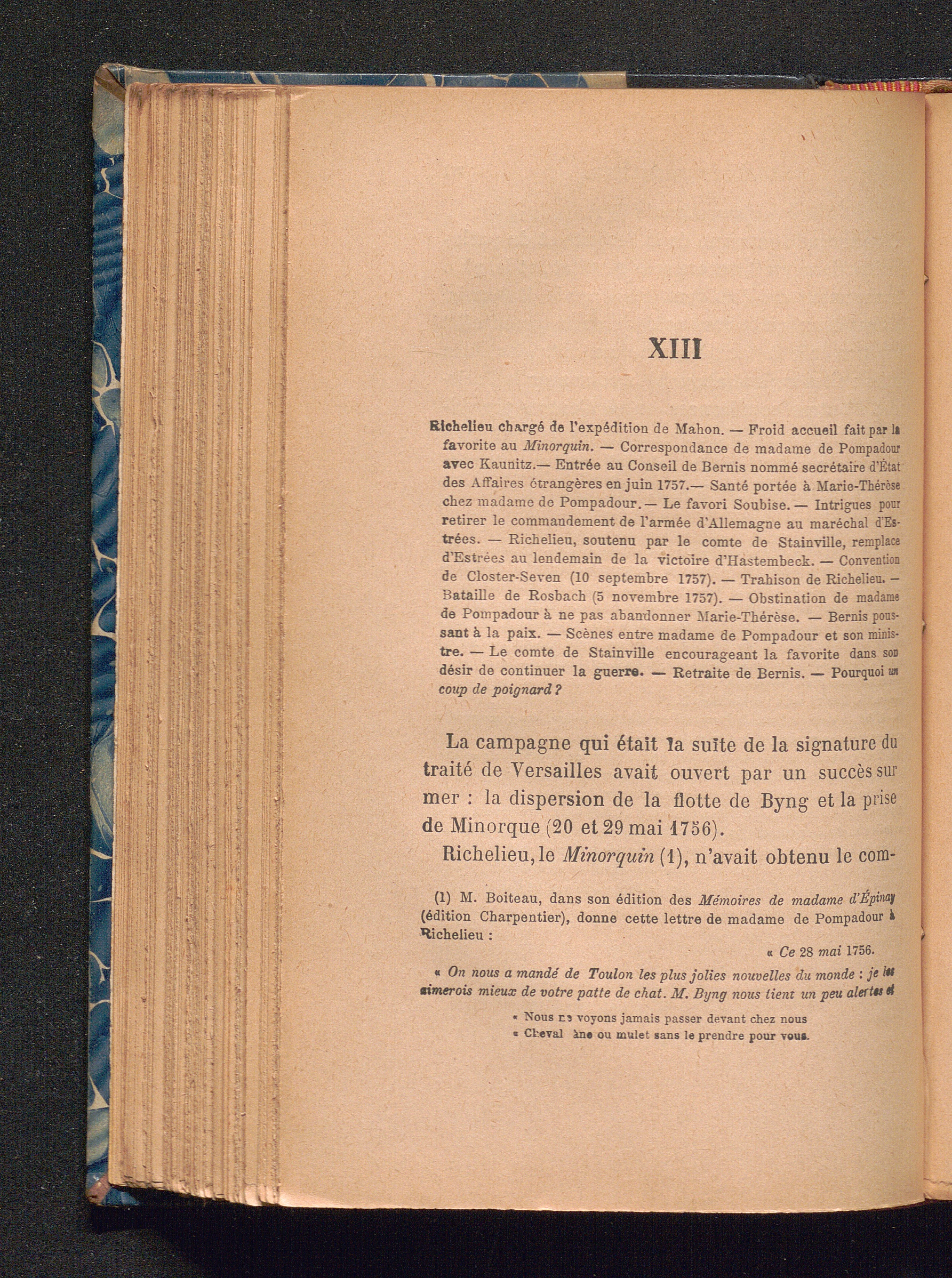 XIII Richelieu chargé de l'expédition de Mahon. - Froid accueil fait par la favorite au Minorquin. - Correspondance de madame de Pompadour avec Kaunitz. - Entrée au Conseil de Bernis, nommé secrétaire d'État des Affaires étrangères en juin 1757. - Santé portée à Marie-Thérèse chez madame de Pompadour. - Le favori Soubise. - Intrigues pour retirer le commandement de l'armée de'Allemagne au maréchal d'Estrées. - Richelieu, soutenu par le comte de Stainville, remplace d'Estrées au lendemain de la victoire ...