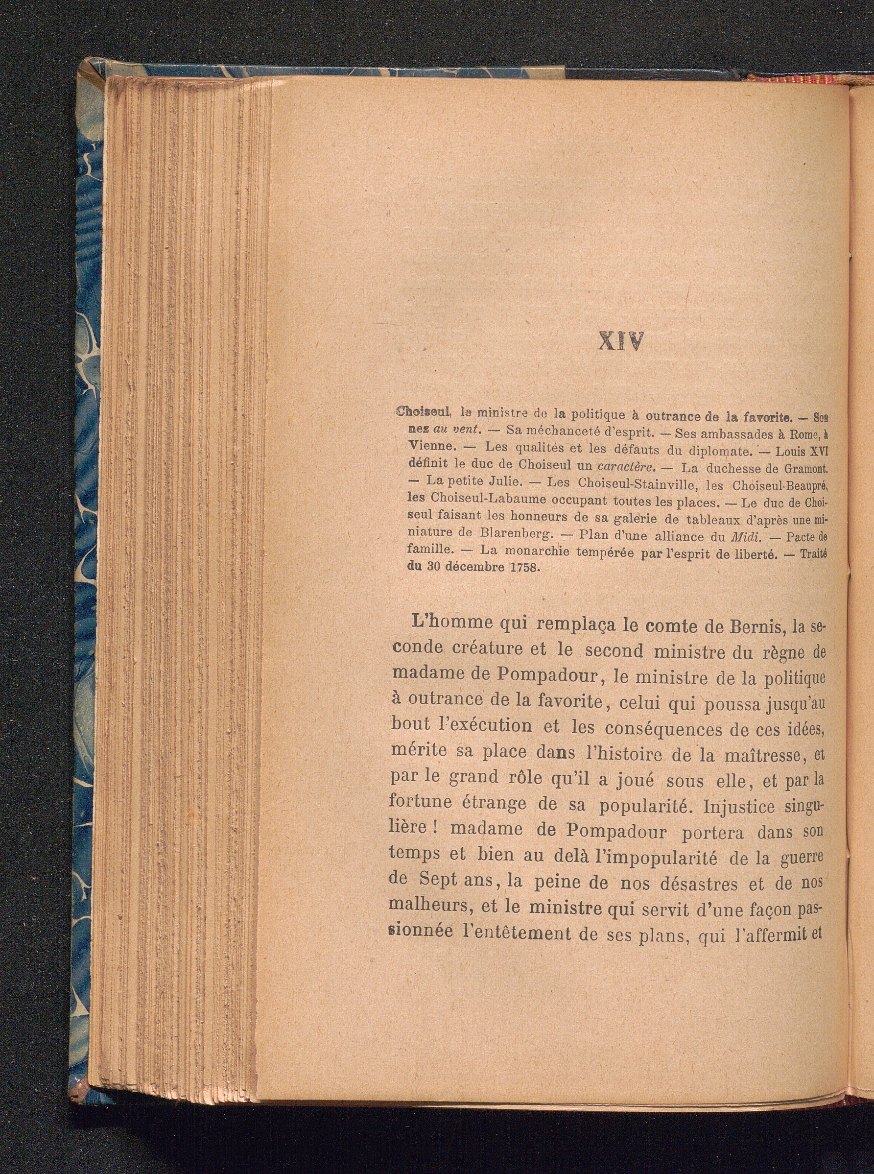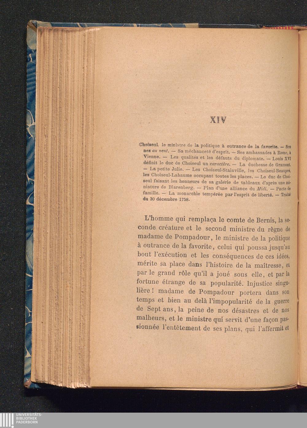 XIV Choiseul , le ministre de la politique à outrance de la favorite. - Son nez au vent. - Sa méchanceté d'esprit. - Ses ambassades à Rome, à Vienne. - Les qualités et les défauts du diplomate. - Louis XVI définit le duc de Choiseul un caractère. - La duchesse de Grammont. - La petite Julie. - Les Choiseul-Stainville, les Choiseul-Beaupré, les Choiseul-Labaume occupant toutes les places. - Le duc de Choiseul faisant les honneurs de sa galerie de tableaux d'après une miniature de Blarenberg. - Plan ...