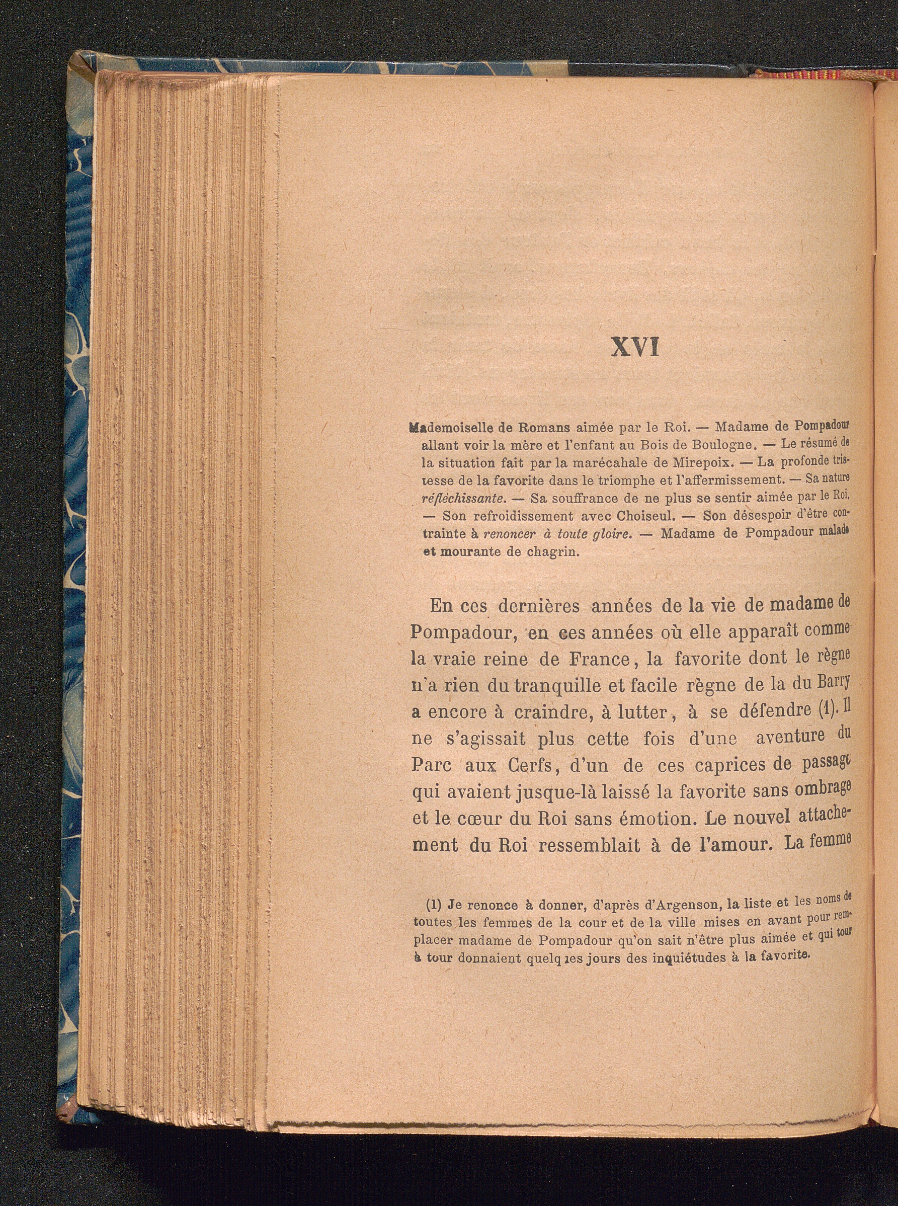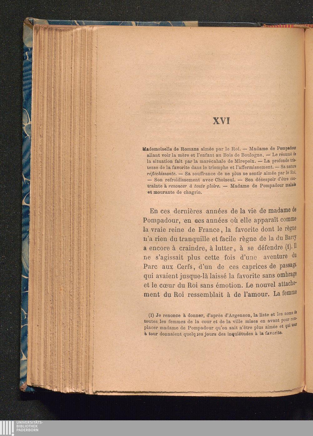 XVI Mademoiselle de Romans aimée par le Roi. - Madame de Pompadour allant voir la mère et l'enfant au Bois de Boulogne. - Le résumé de la situation fait par le maréchal de Mirepoix. - La profonde tristesse de la favorite dans le triomphe et l'affermissement. - Sa nature réfléchissante. - Sa souffrance de ne plus se sentir aimée par le Roi. - Son refroidissement avec Choiseul. - Son désespoir d'être contrainte à renoncer à toute gloire. - Madame de Pompadour malade et mourant de chagrin.