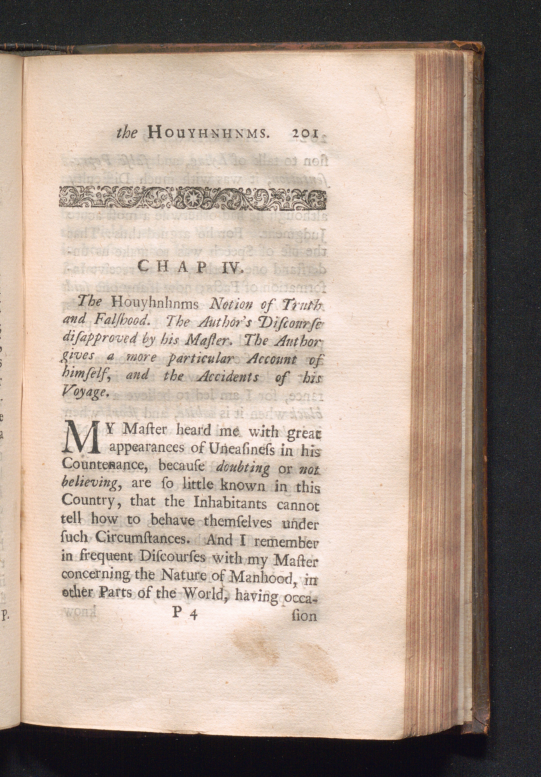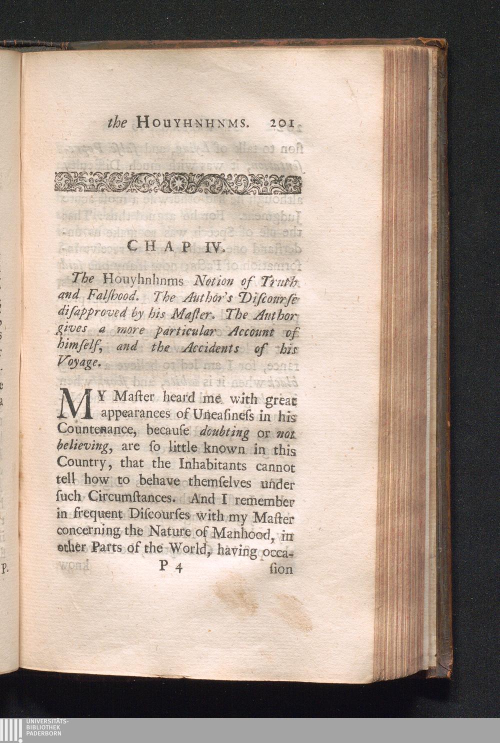 Chap. IV. The Houyhnhnms Notion of Truth and Falshood. The Author's Discourse disapproved[...]