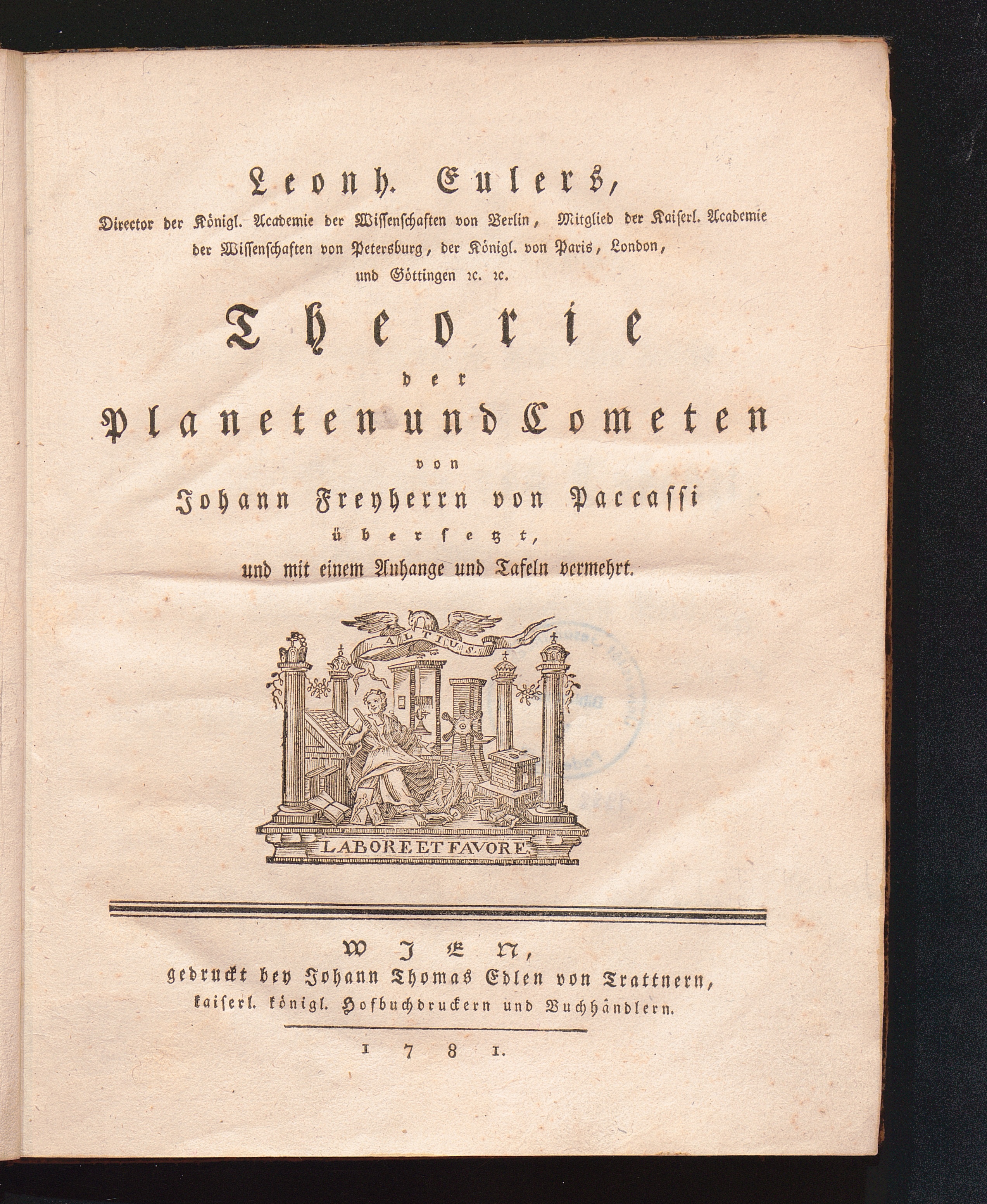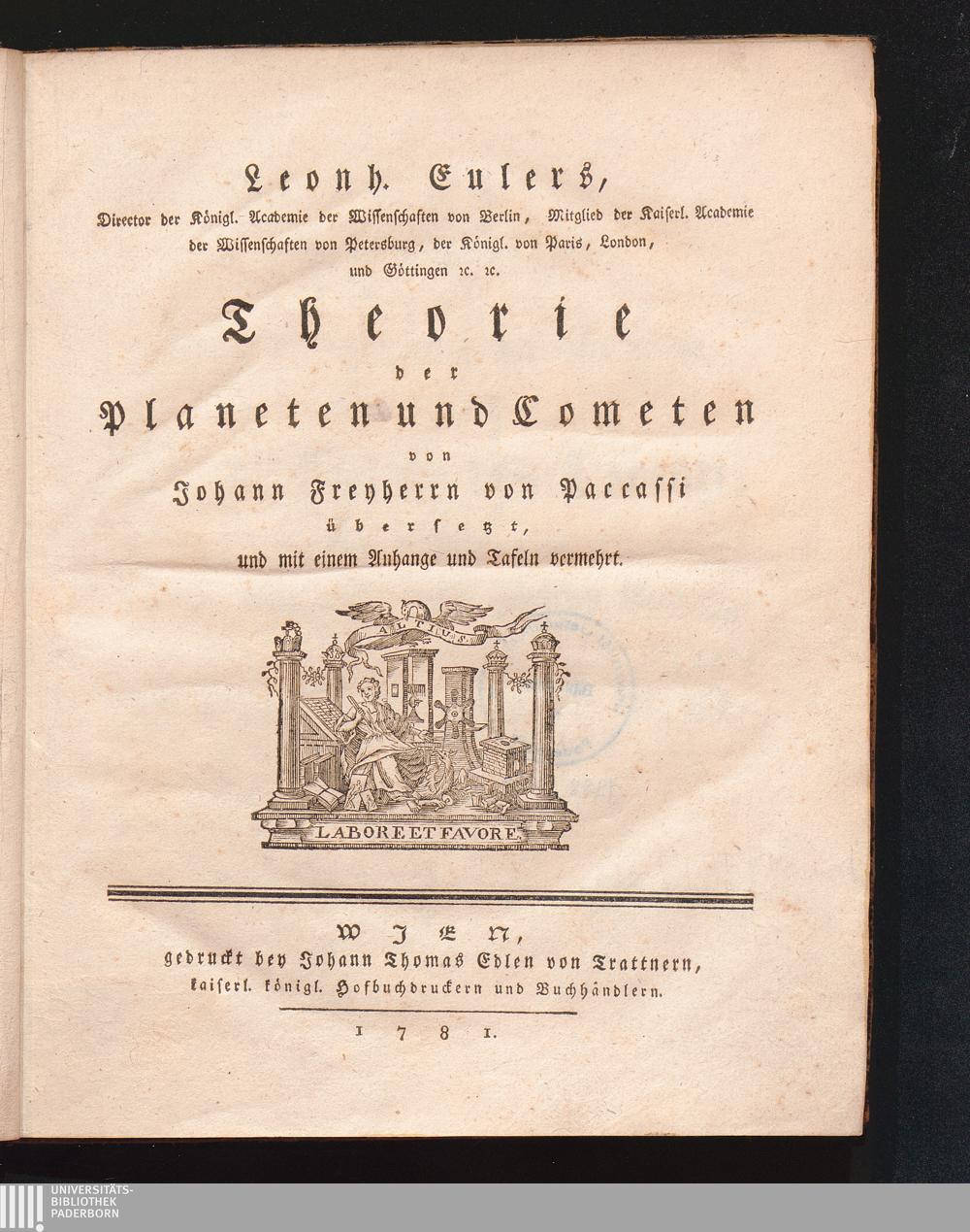 Leonh. Eulers, ... Theorie der Planeten und Cometen / von Johann Freyherrn von Paccassi übersetzt, und mit einem Anhang und Tafeln vermehrt