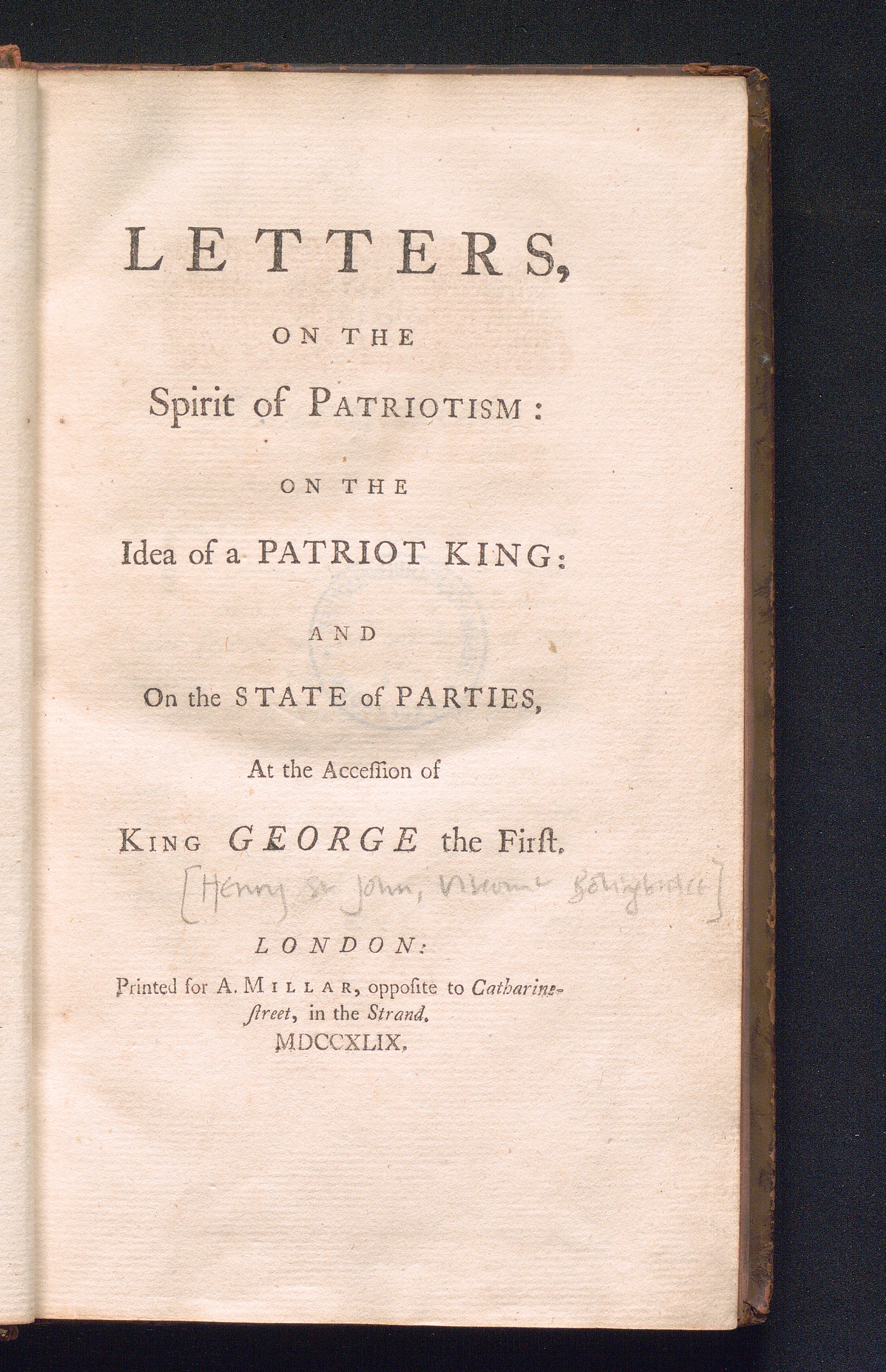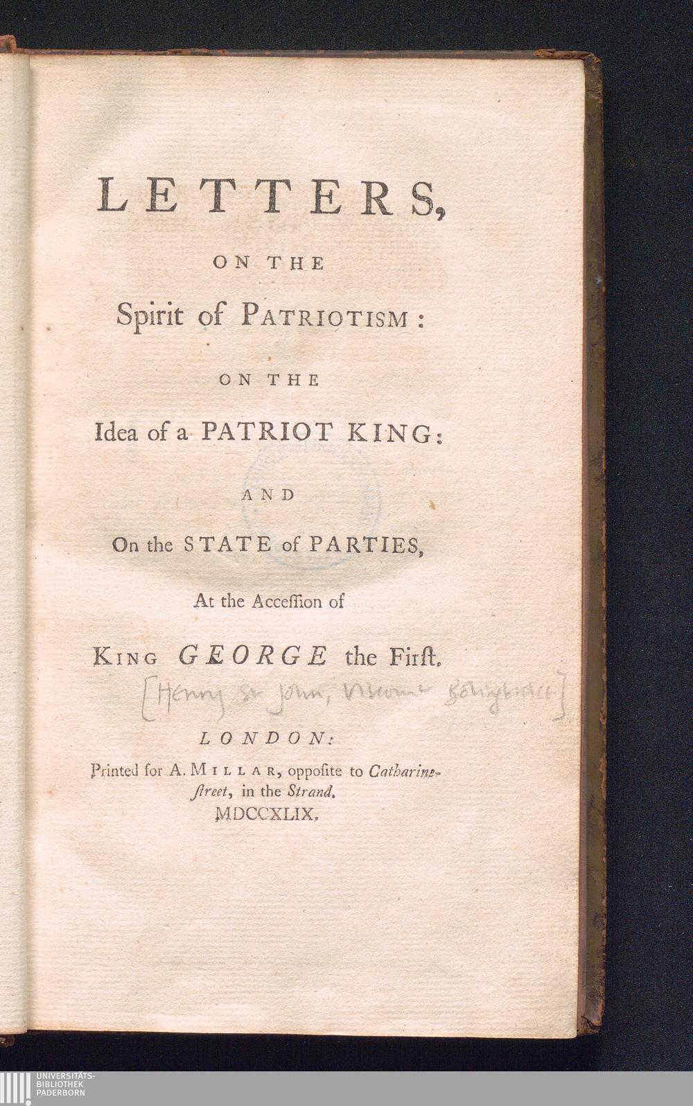 Letters,|| On The|| Spirit of Patriotism:|| On The|| Idea of a Patriot King:|| And|| On the State of Parties,|| At the Accession of|| King George the First / [Henry St. John Bolingbroke]