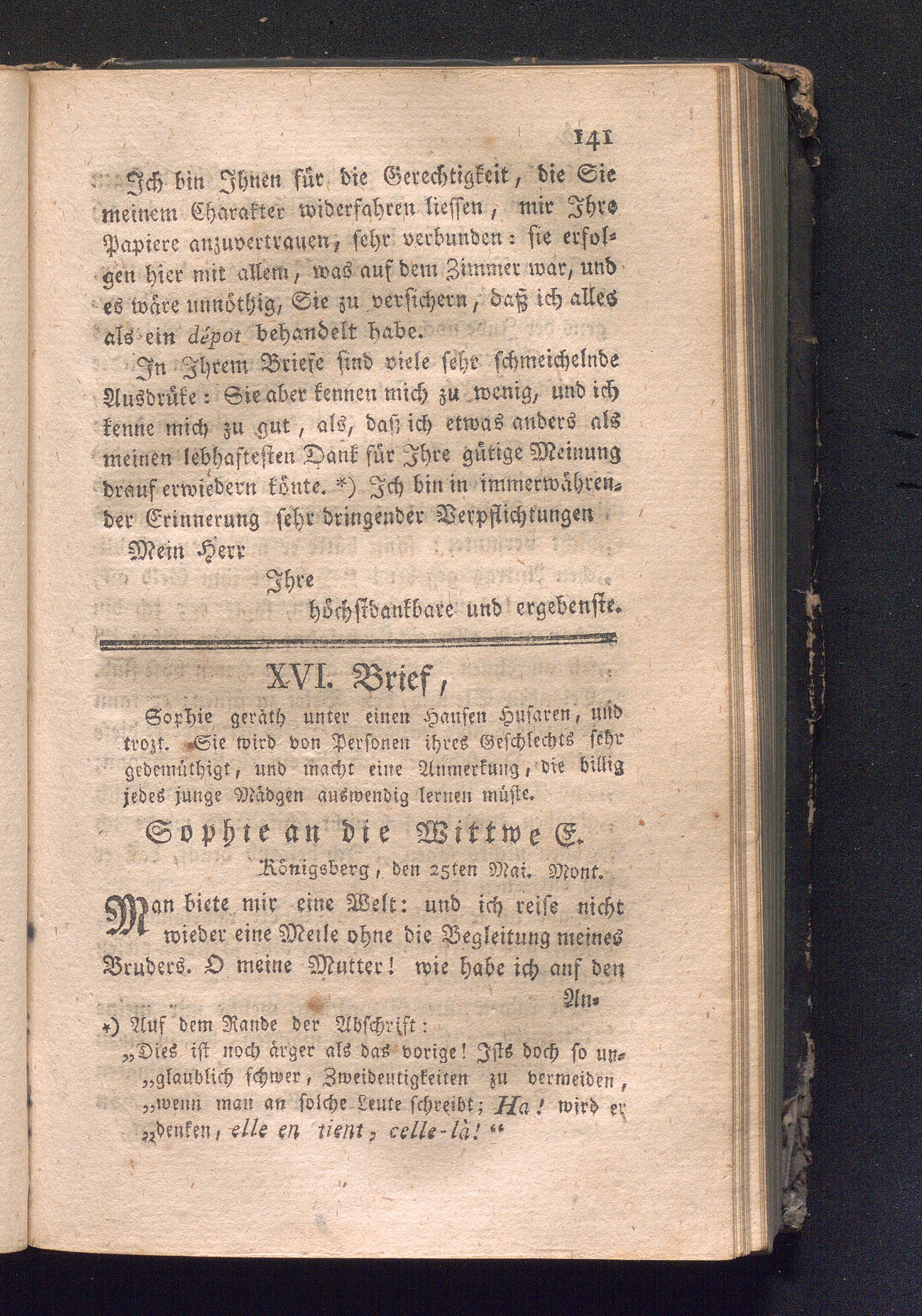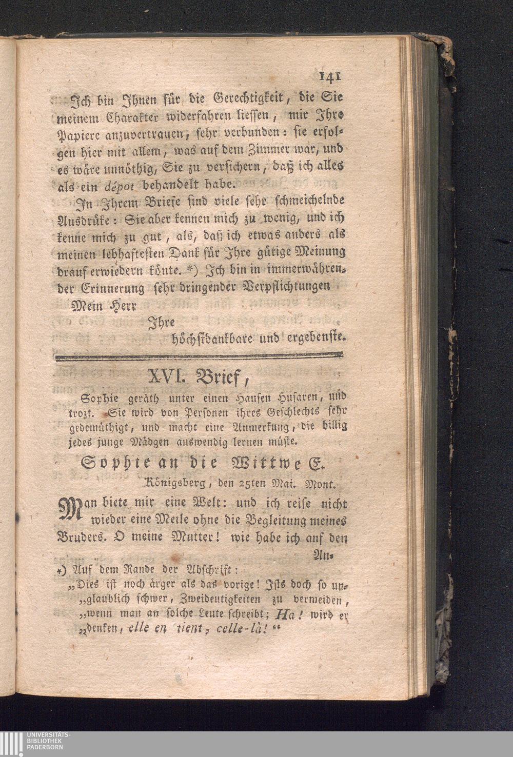 XVI. Brief. Sophie geräth unter einen Haufen Husaren, und trozt. Sie wird von Personen[...]