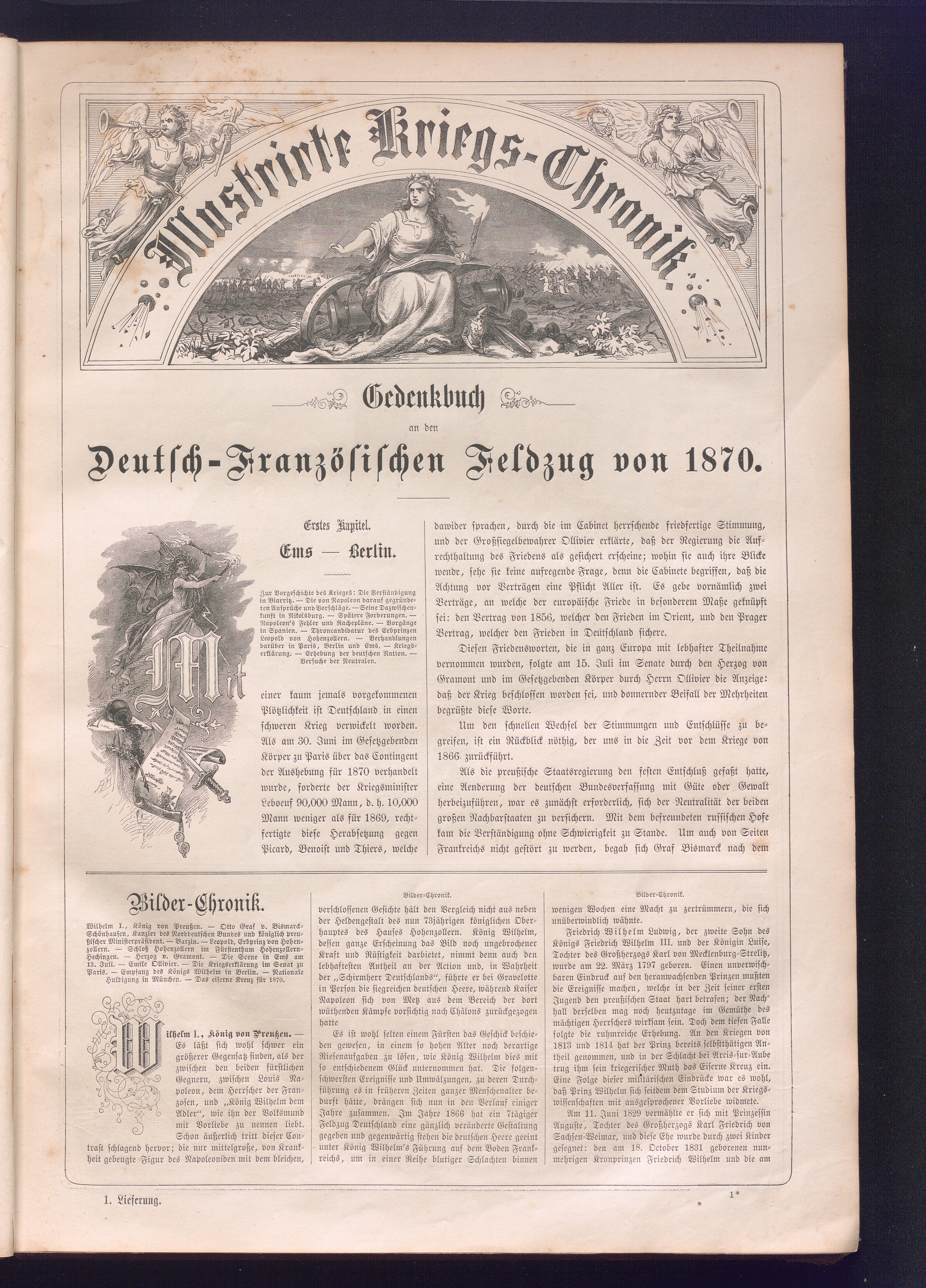 Illustrirte Kriegs-Chronik : Gedenkbuch an den Deutsch-Französischen Feldzug von 1870 - 1871 / Geschrieben vom Verfasser der Illustrirten Kriegs-Chronik von 1866 ; Initialen, Porträts, Kriegsbilder, Militär- und Marinebilder, Städteansichten, Karten und Pläne gezeichnet von den artistischen Mitarbeitern der Illustrirten Zeitung. [Hrsg. von Johann Jakob Weber] [Allegorisches Titelbild von C. Scheuren ; Titelblatt Friedr. Baumgarten]