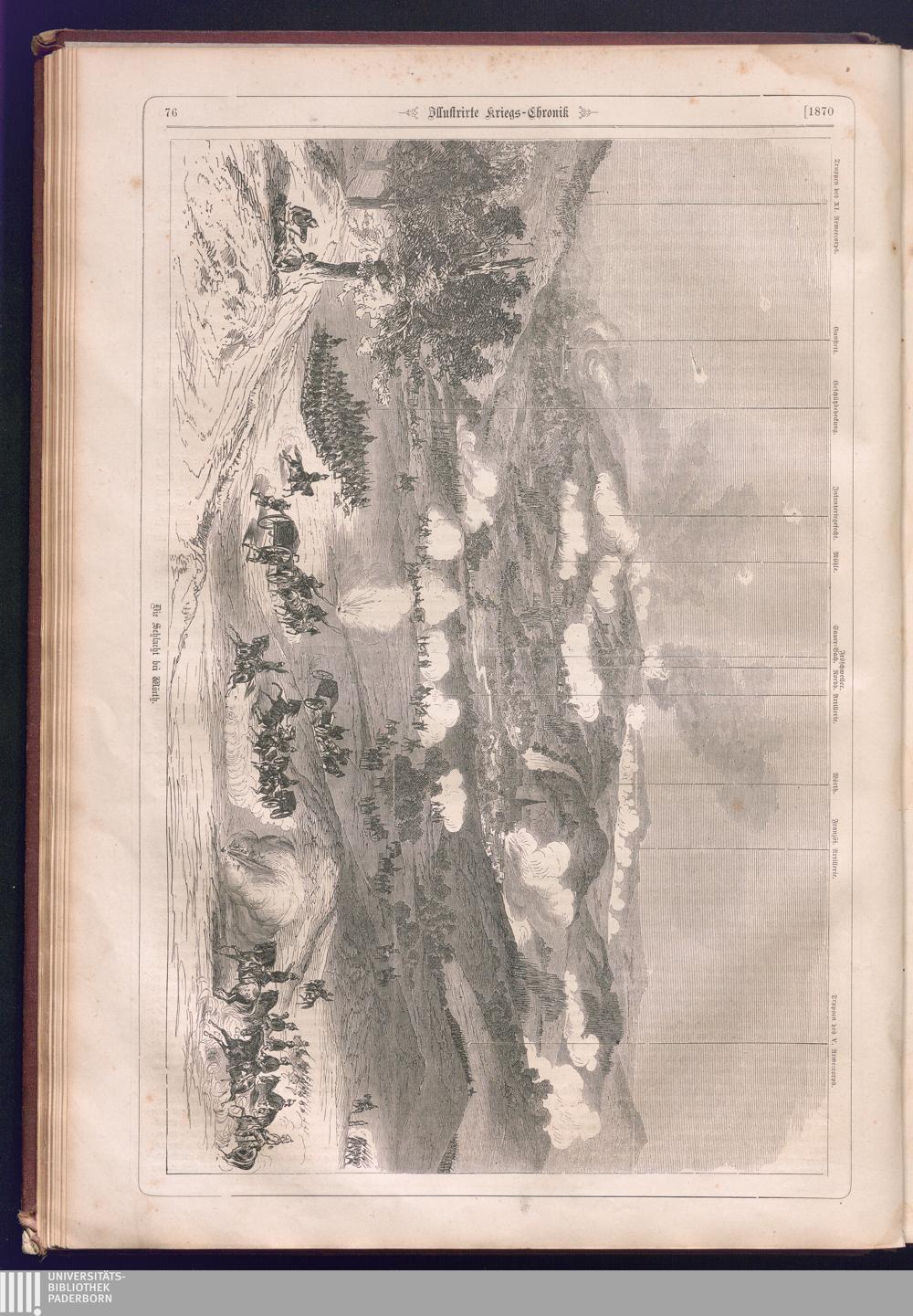 Illustrirte Kriegs-Chronik : Gedenkbuch an den Deutsch-Französischen Feldzug von 1870 - 1871 / Geschrieben vom Verfasser der Illustrirten Kriegs-Chronik von 1866 ; Initialen, Porträts, Kriegsbilder, Militär- und Marinebilder, Städteansichten, Karten und Pläne gezeichnet von den artistischen Mitarbeitern der Illustrirten Zeitung. [Hrsg. von Johann Jakob Weber] [Allegorisches Titelbild von C. Scheuren ; Titelblatt Friedr. Baumgarten]