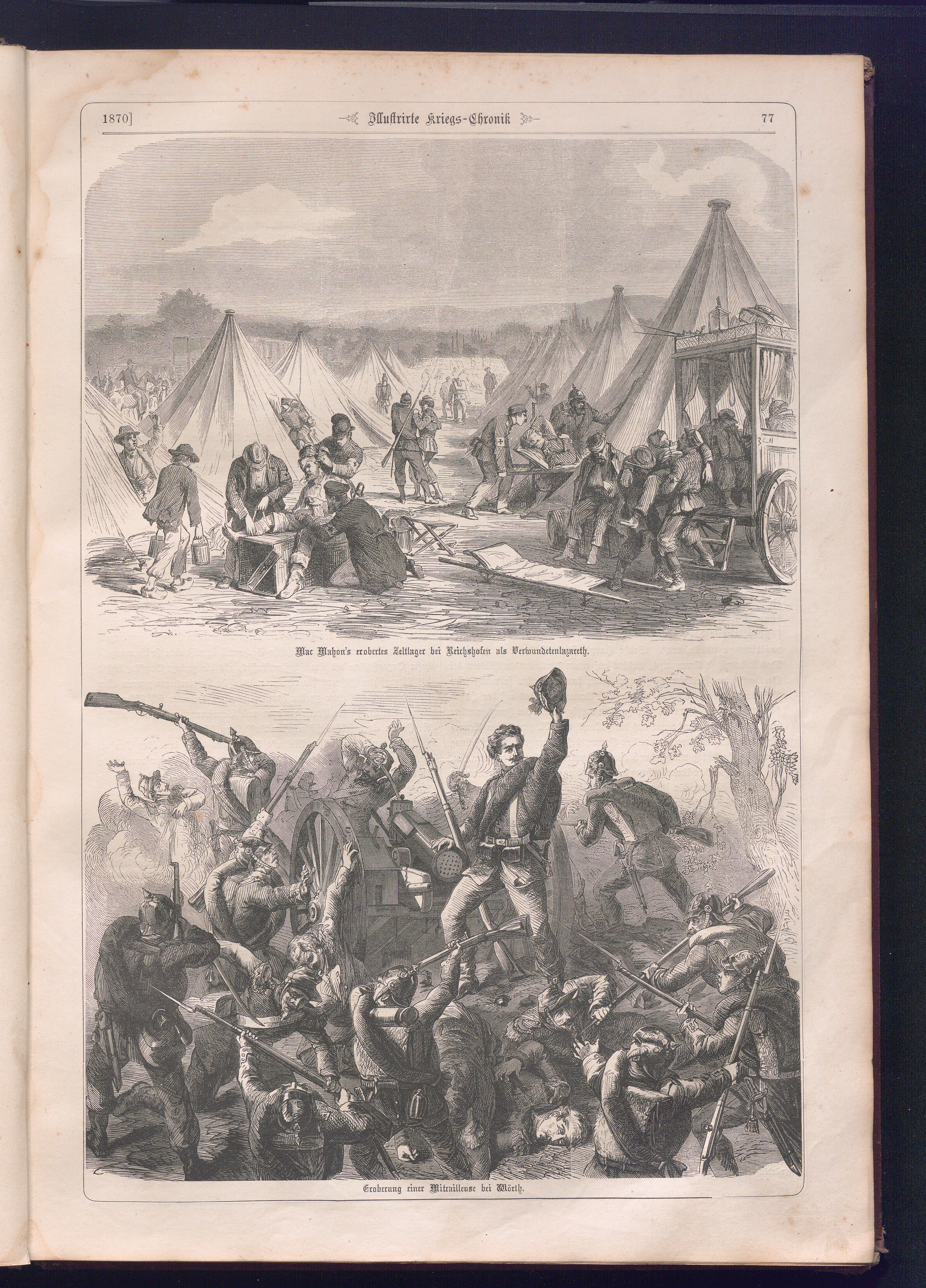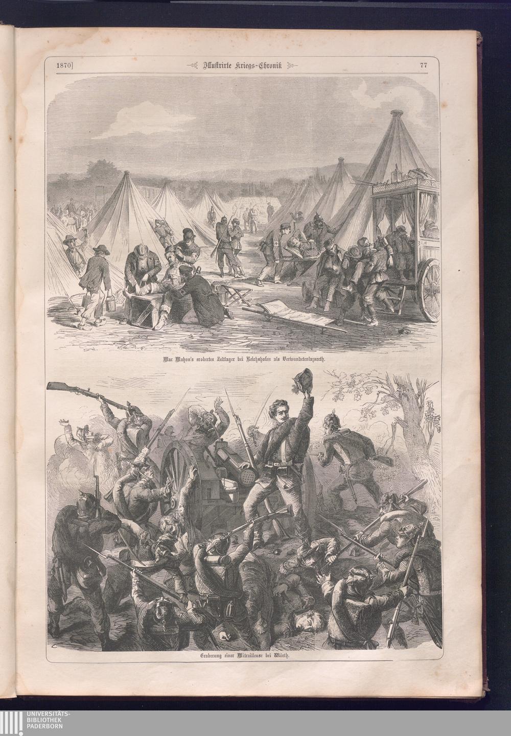 Illustrirte Kriegs-Chronik : Gedenkbuch an den Deutsch-Französischen Feldzug von 1870 - 1871 / Geschrieben vom Verfasser der Illustrirten Kriegs-Chronik von 1866 ; Initialen, Porträts, Kriegsbilder, Militär- und Marinebilder, Städteansichten, Karten und Pläne gezeichnet von den artistischen Mitarbeitern der Illustrirten Zeitung. [Hrsg. von Johann Jakob Weber] [Allegorisches Titelbild von C. Scheuren ; Titelblatt Friedr. Baumgarten]