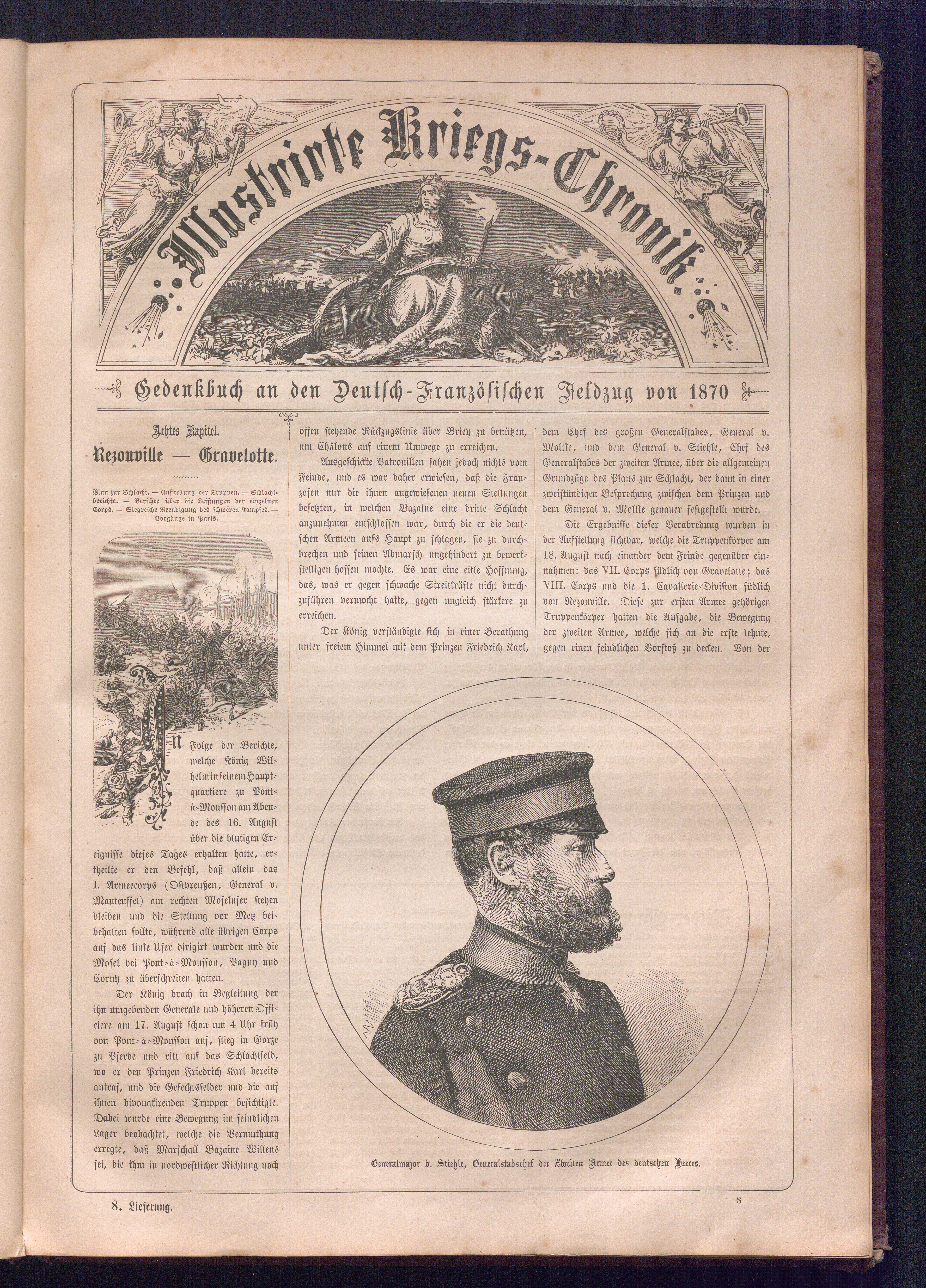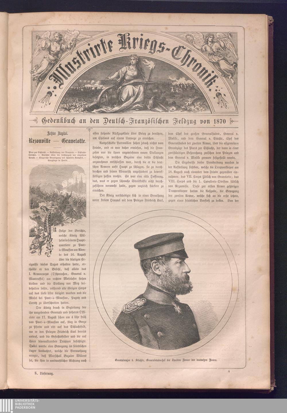 Illustrirte Kriegs-Chronik : Gedenkbuch an den Deutsch-Französischen Feldzug von 1870 - 1871 / Geschrieben vom Verfasser der Illustrirten Kriegs-Chronik von 1866 ; Initialen, Porträts, Kriegsbilder, Militär- und Marinebilder, Städteansichten, Karten und Pläne gezeichnet von den artistischen Mitarbeitern der Illustrirten Zeitung. [Hrsg. von Johann Jakob Weber] [Allegorisches Titelbild von C. Scheuren ; Titelblatt Friedr. Baumgarten]