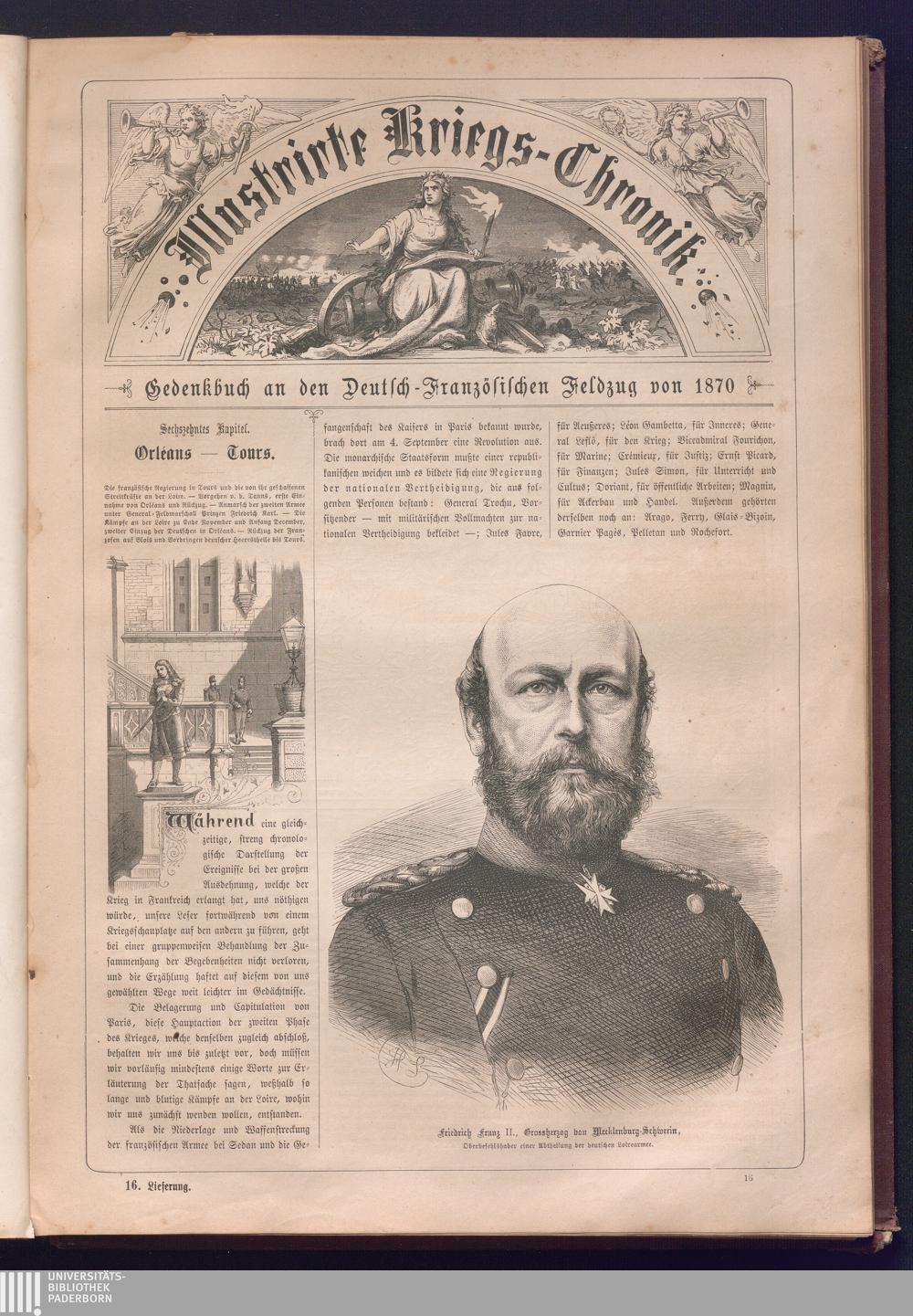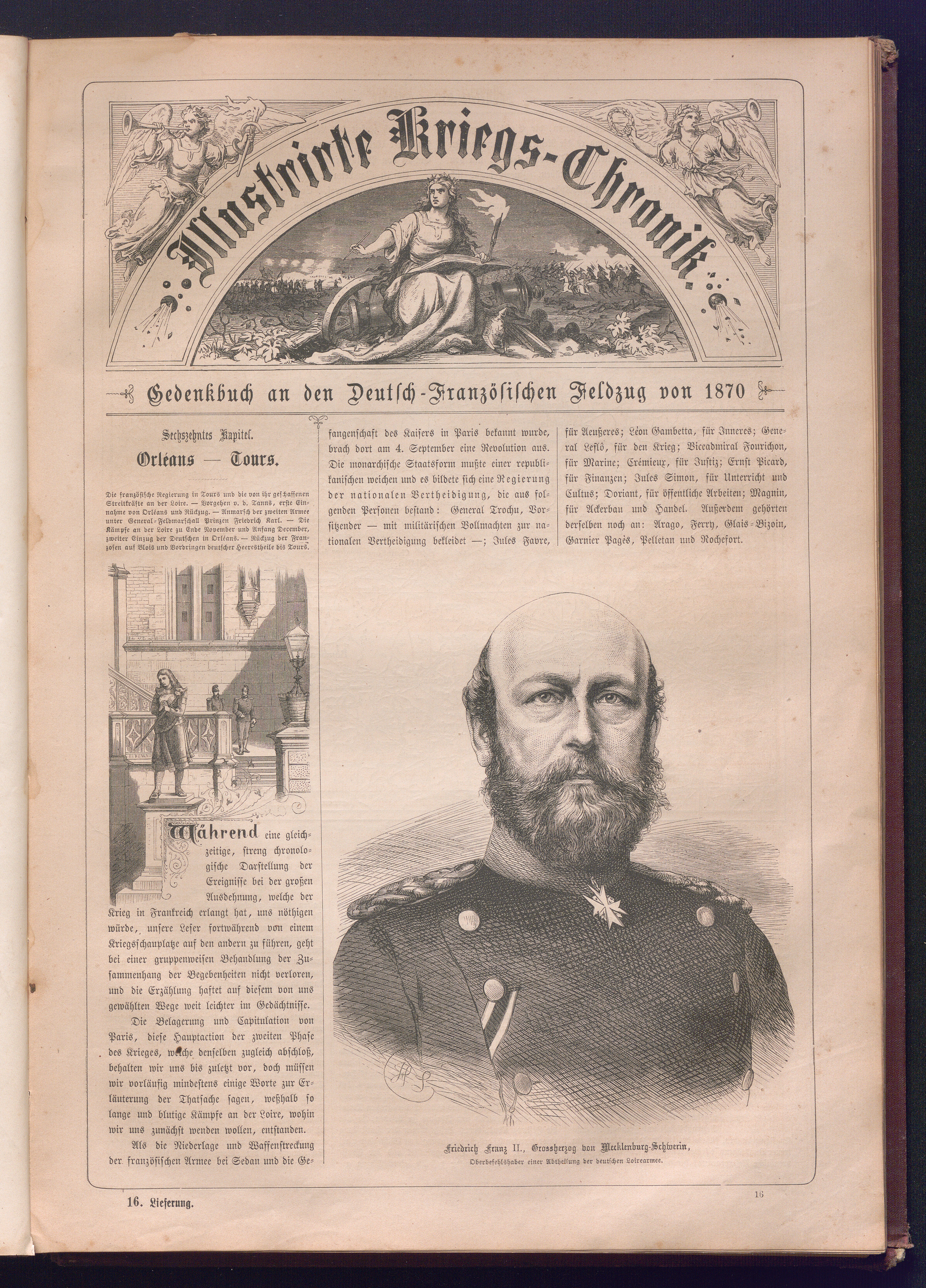 Illustrirte Kriegs-Chronik : Gedenkbuch an den Deutsch-Französischen Feldzug von 1870 - 1871 / Geschrieben vom Verfasser der Illustrirten Kriegs-Chronik von 1866 ; Initialen, Porträts, Kriegsbilder, Militär- und Marinebilder, Städteansichten, Karten und Pläne gezeichnet von den artistischen Mitarbeitern der Illustrirten Zeitung. [Hrsg. von Johann Jakob Weber] [Allegorisches Titelbild von C. Scheuren ; Titelblatt Friedr. Baumgarten]