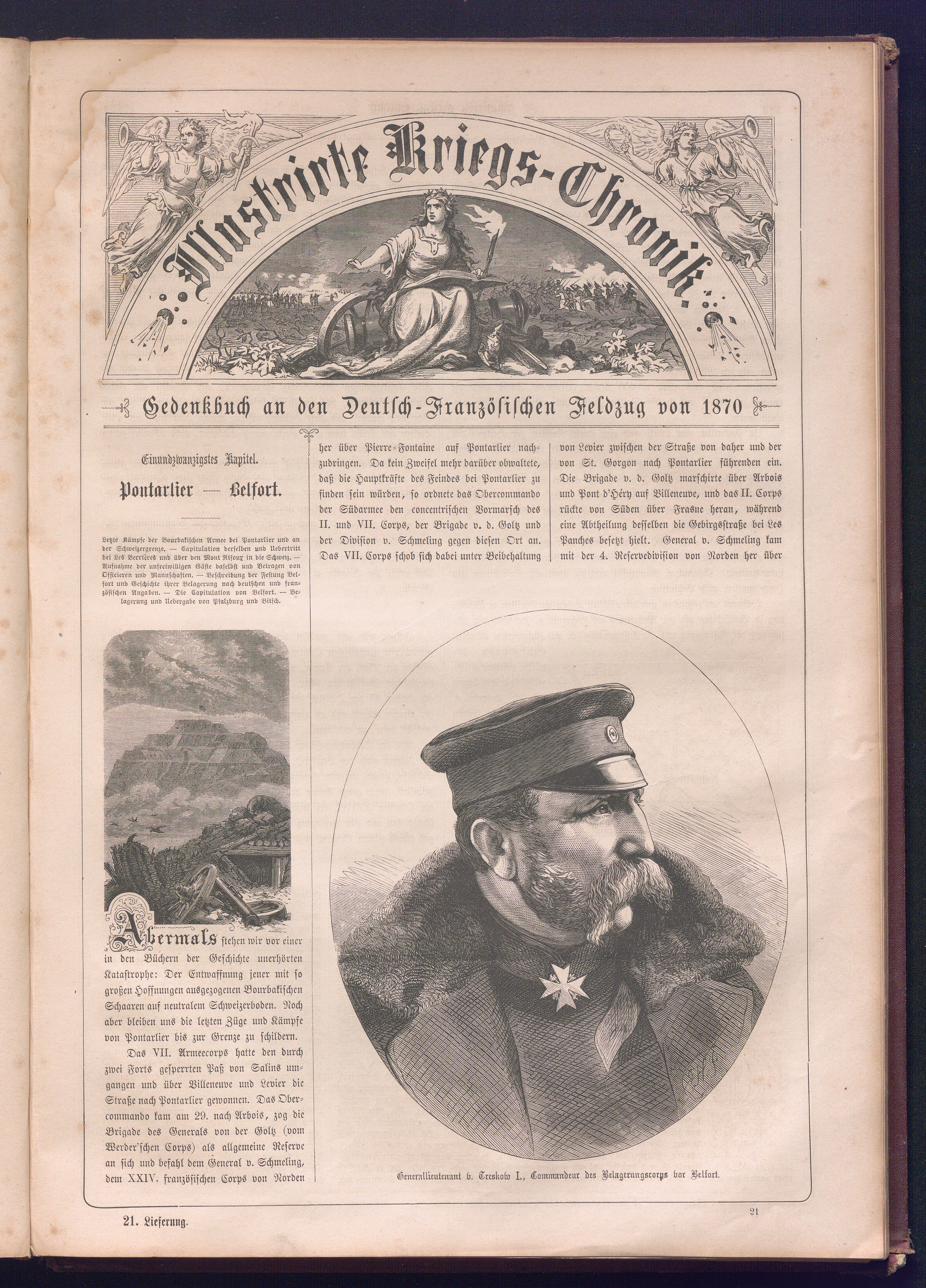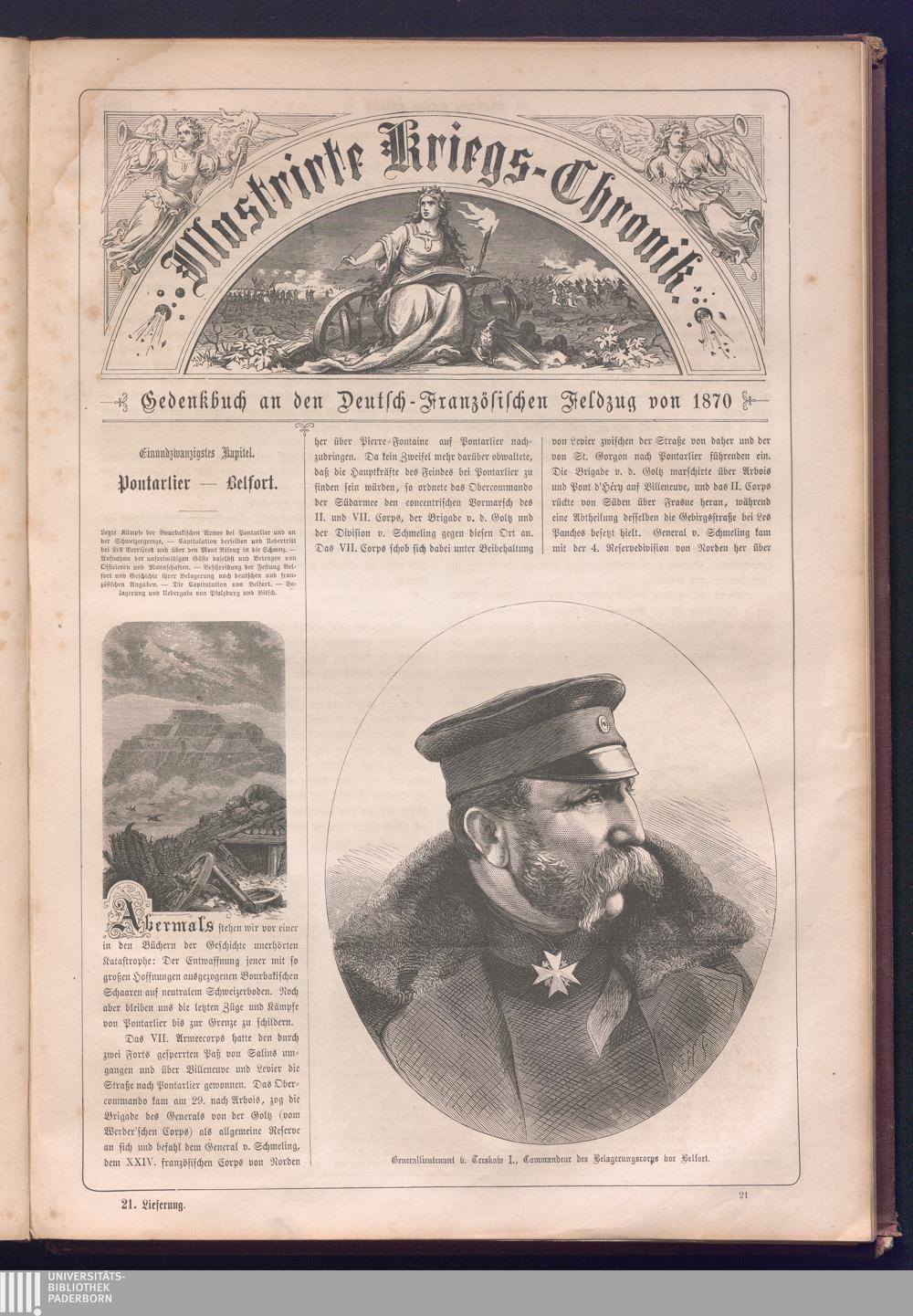 Illustrirte Kriegs-Chronik : Gedenkbuch an den Deutsch-Französischen Feldzug von 1870 - 1871 / Geschrieben vom Verfasser der Illustrirten Kriegs-Chronik von 1866 ; Initialen, Porträts, Kriegsbilder, Militär- und Marinebilder, Städteansichten, Karten und Pläne gezeichnet von den artistischen Mitarbeitern der Illustrirten Zeitung. [Hrsg. von Johann Jakob Weber] [Allegorisches Titelbild von C. Scheuren ; Titelblatt Friedr. Baumgarten]