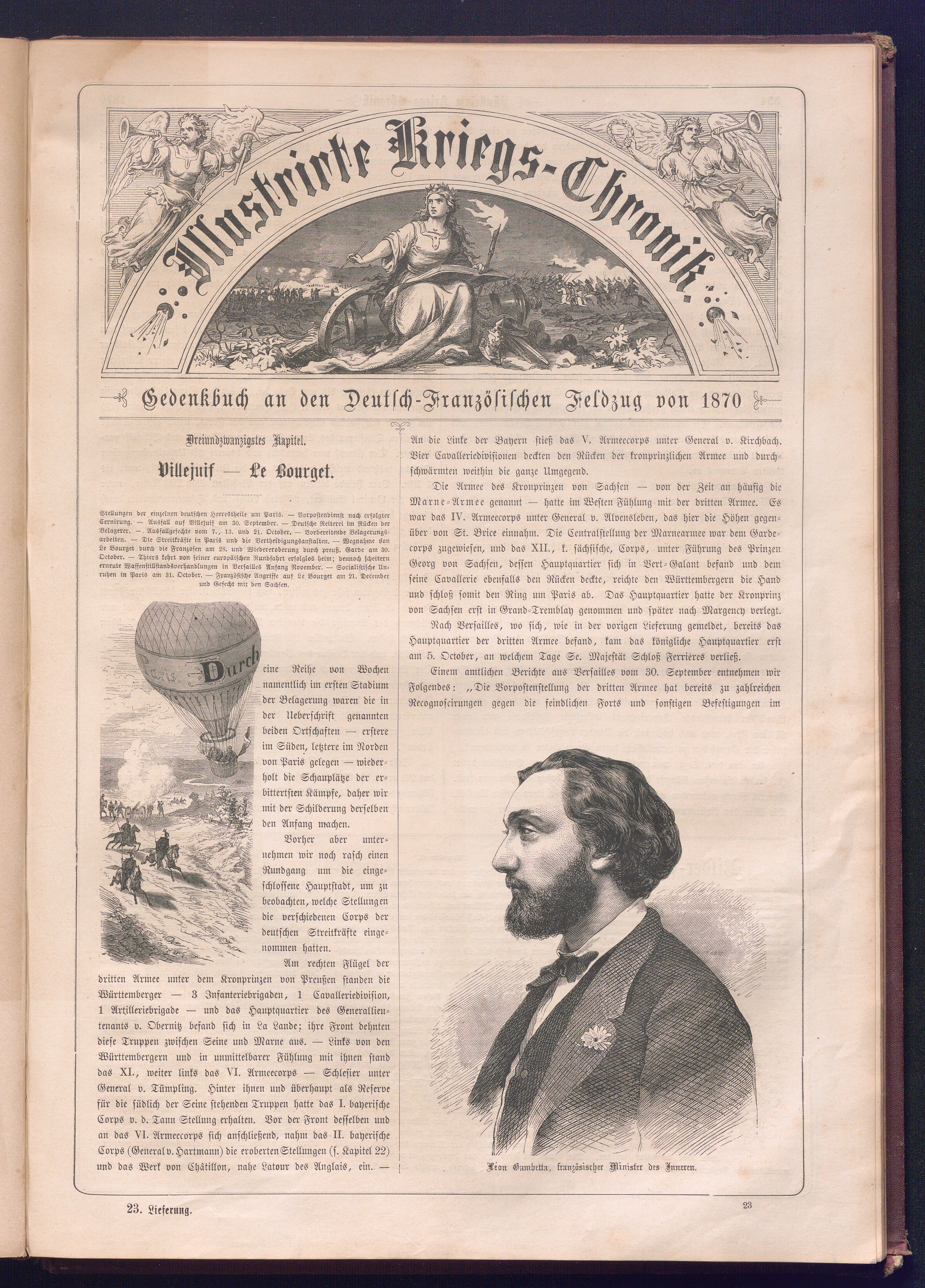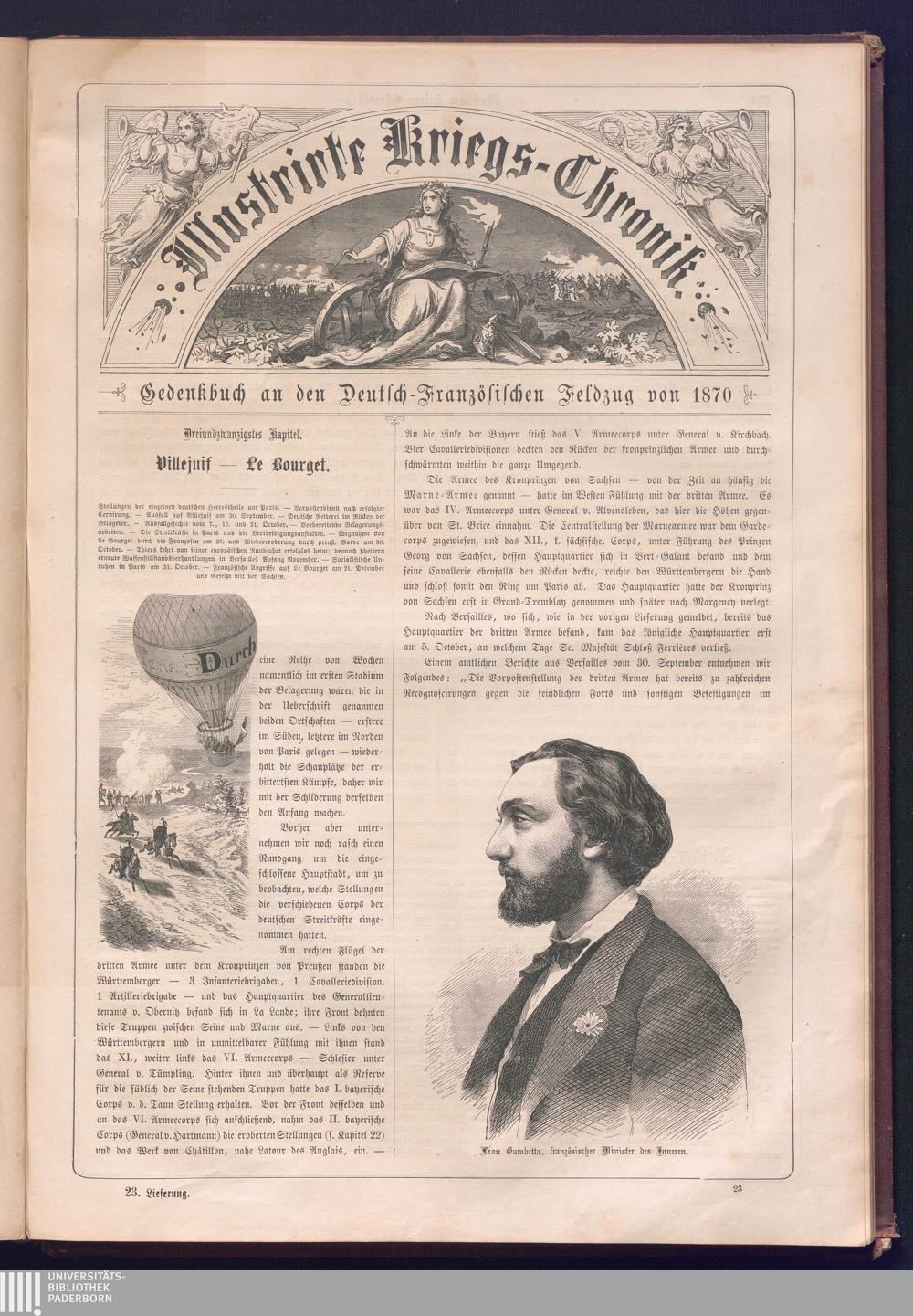 Illustrirte Kriegs-Chronik : Gedenkbuch an den Deutsch-Französischen Feldzug von 1870 - 1871 / Geschrieben vom Verfasser der Illustrirten Kriegs-Chronik von 1866 ; Initialen, Porträts, Kriegsbilder, Militär- und Marinebilder, Städteansichten, Karten und Pläne gezeichnet von den artistischen Mitarbeitern der Illustrirten Zeitung. [Hrsg. von Johann Jakob Weber] [Allegorisches Titelbild von C. Scheuren ; Titelblatt Friedr. Baumgarten]