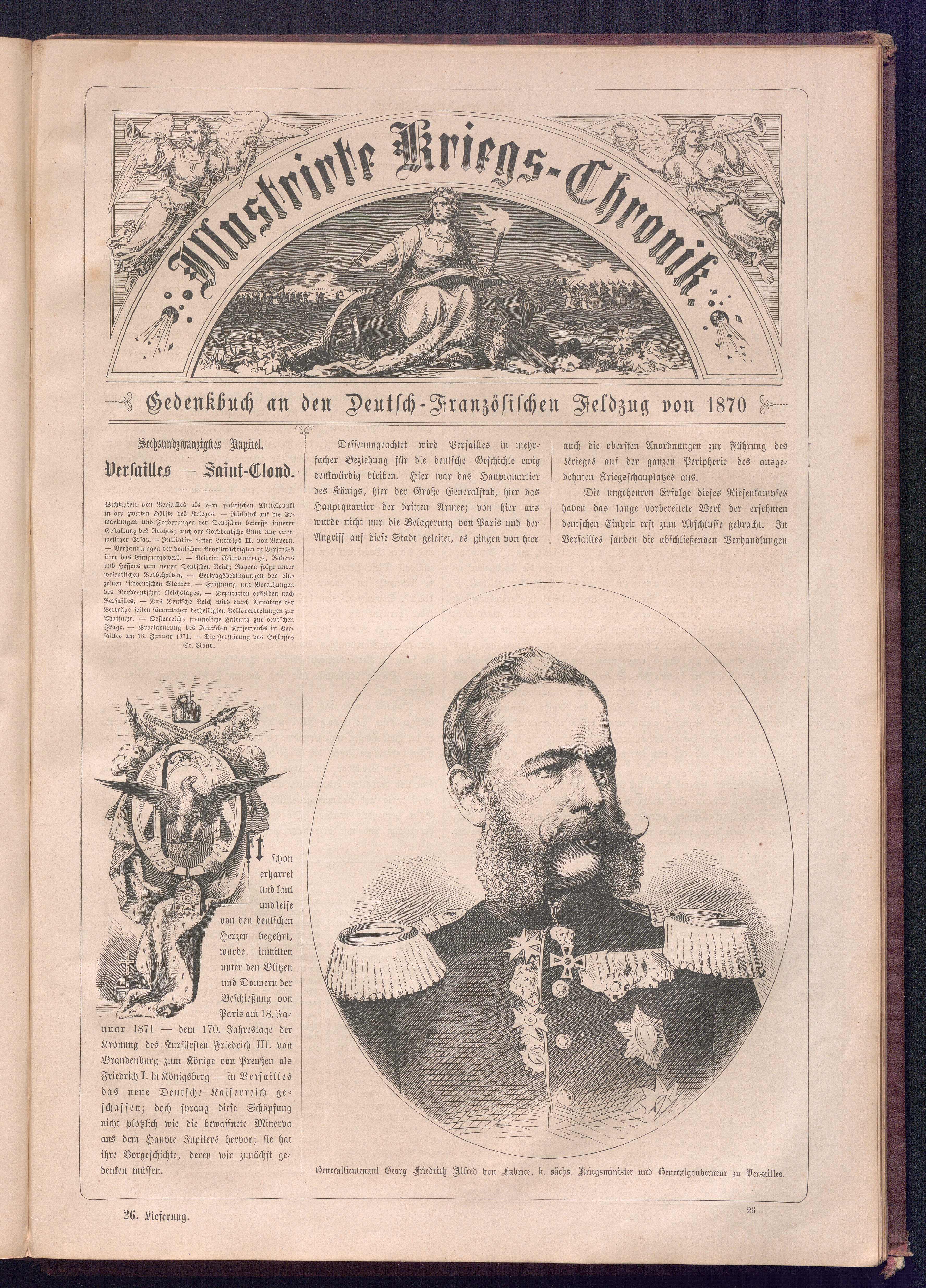 Illustrirte Kriegs-Chronik : Gedenkbuch an den Deutsch-Französischen Feldzug von 1870 - 1871 / Geschrieben vom Verfasser der Illustrirten Kriegs-Chronik von 1866 ; Initialen, Porträts, Kriegsbilder, Militär- und Marinebilder, Städteansichten, Karten und Pläne gezeichnet von den artistischen Mitarbeitern der Illustrirten Zeitung. [Hrsg. von Johann Jakob Weber] [Allegorisches Titelbild von C. Scheuren ; Titelblatt Friedr. Baumgarten]