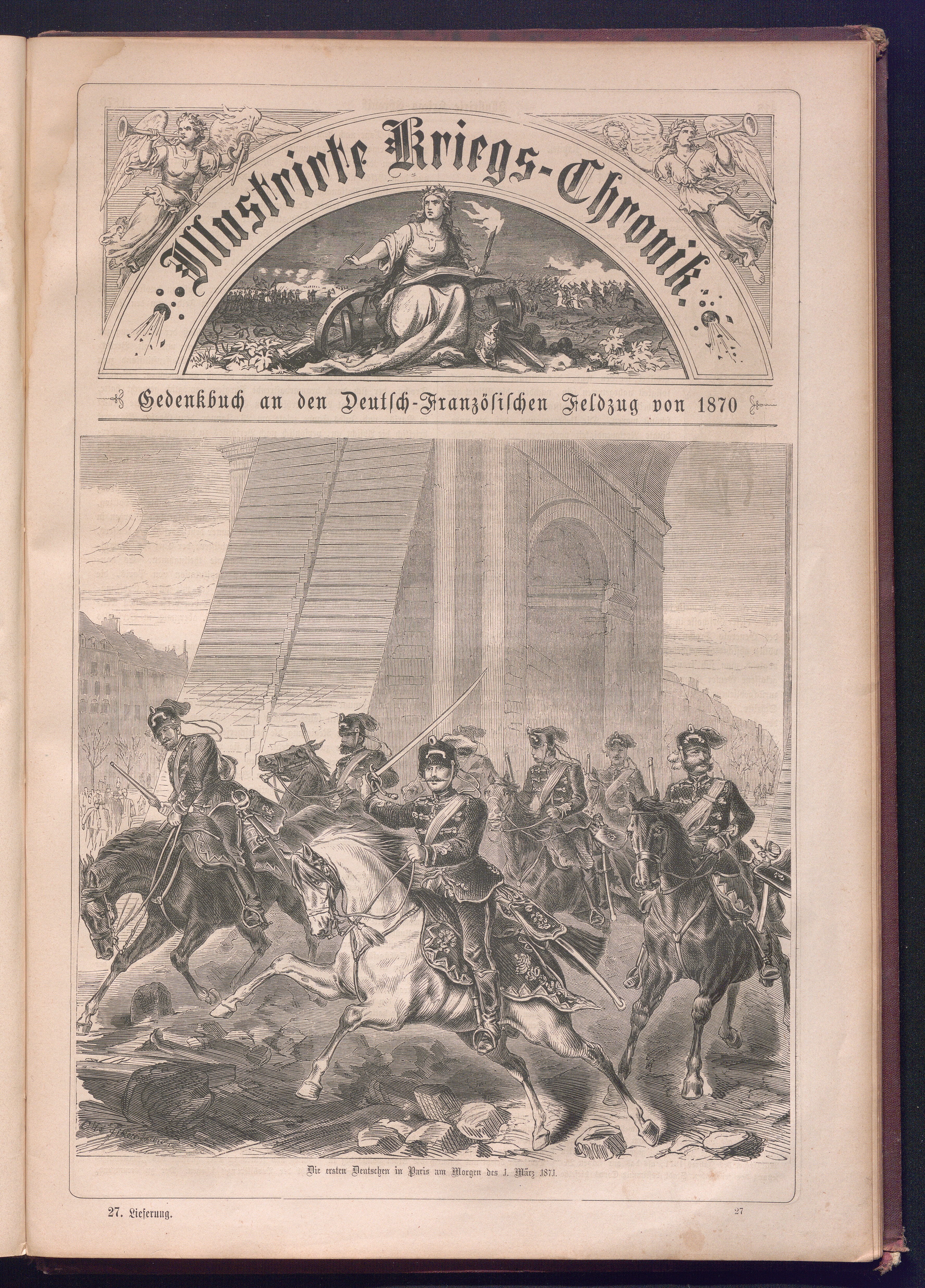 Illustrirte Kriegs-Chronik : Gedenkbuch an den Deutsch-Französischen Feldzug von 1870 - 1871 / Geschrieben vom Verfasser der Illustrirten Kriegs-Chronik von 1866 ; Initialen, Porträts, Kriegsbilder, Militär- und Marinebilder, Städteansichten, Karten und Pläne gezeichnet von den artistischen Mitarbeitern der Illustrirten Zeitung. [Hrsg. von Johann Jakob Weber] [Allegorisches Titelbild von C. Scheuren ; Titelblatt Friedr. Baumgarten]