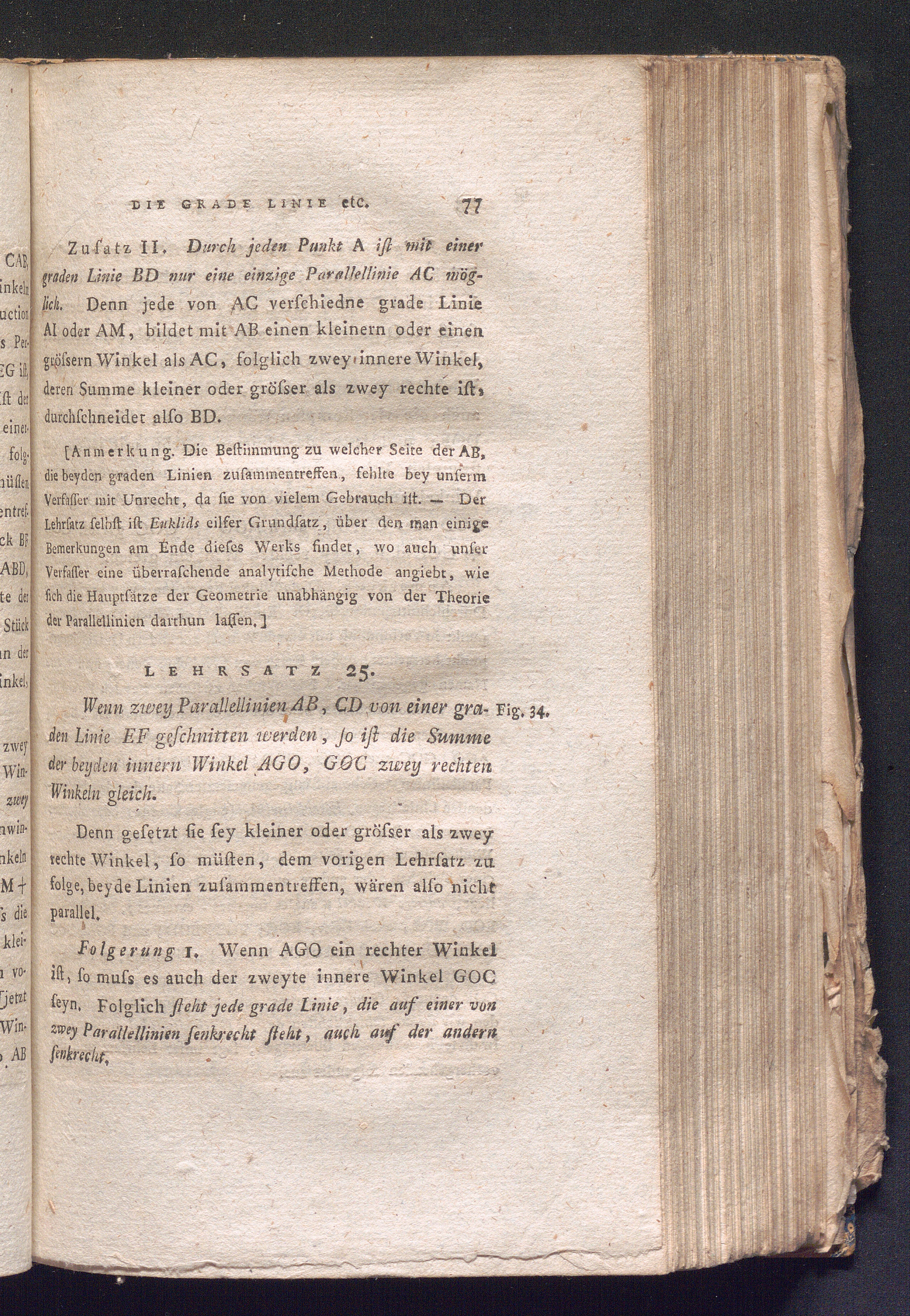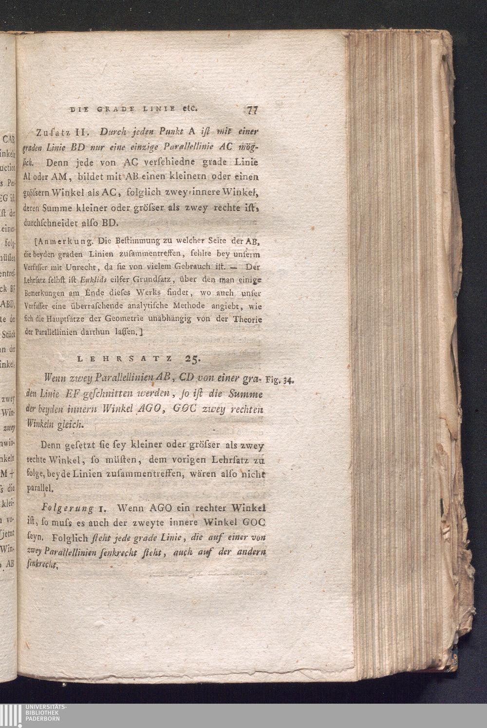 Lehrsatz 25. Wenn zwey Parallellinien AB, CD von einer graden Linie EF geschnitten[...]