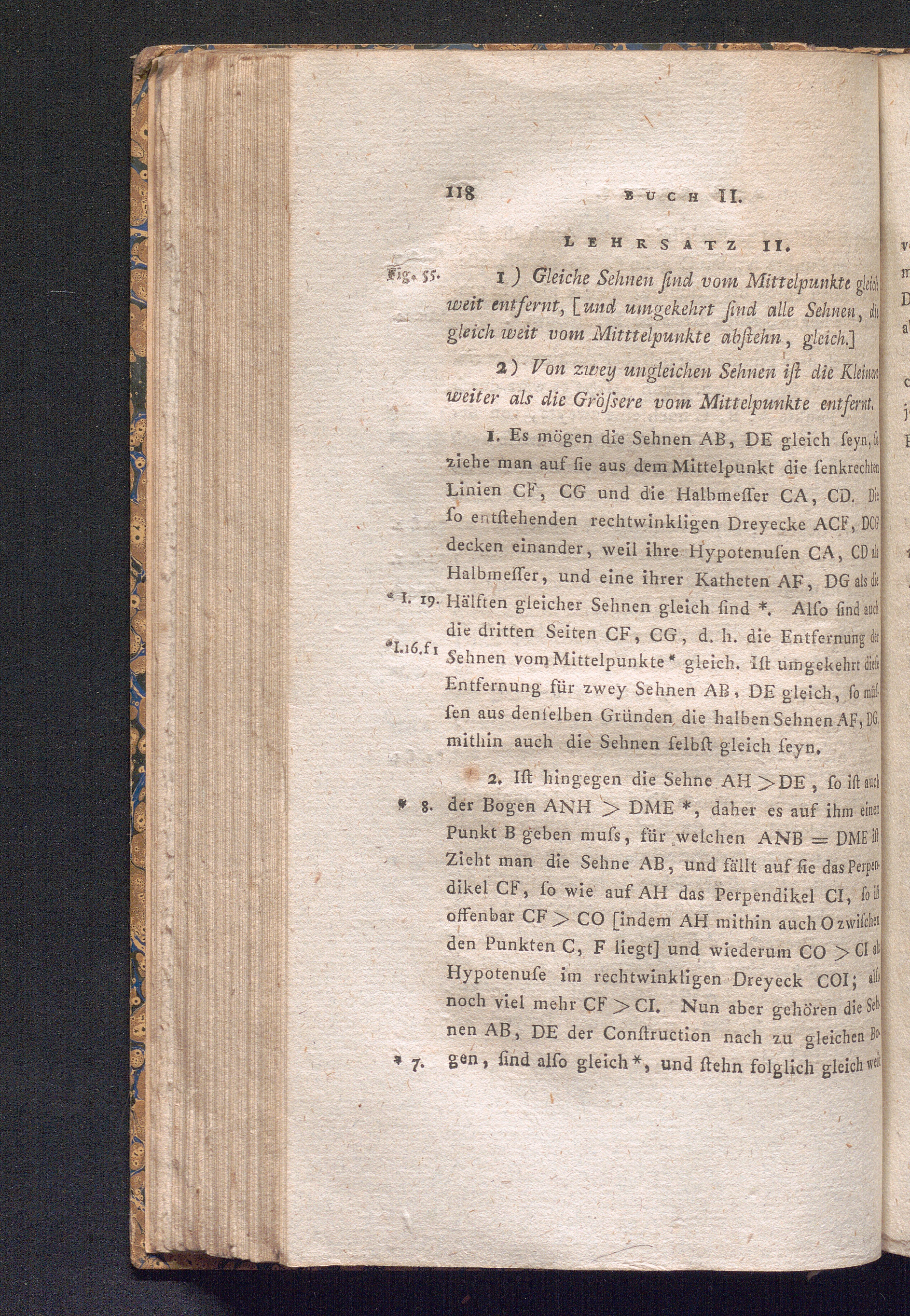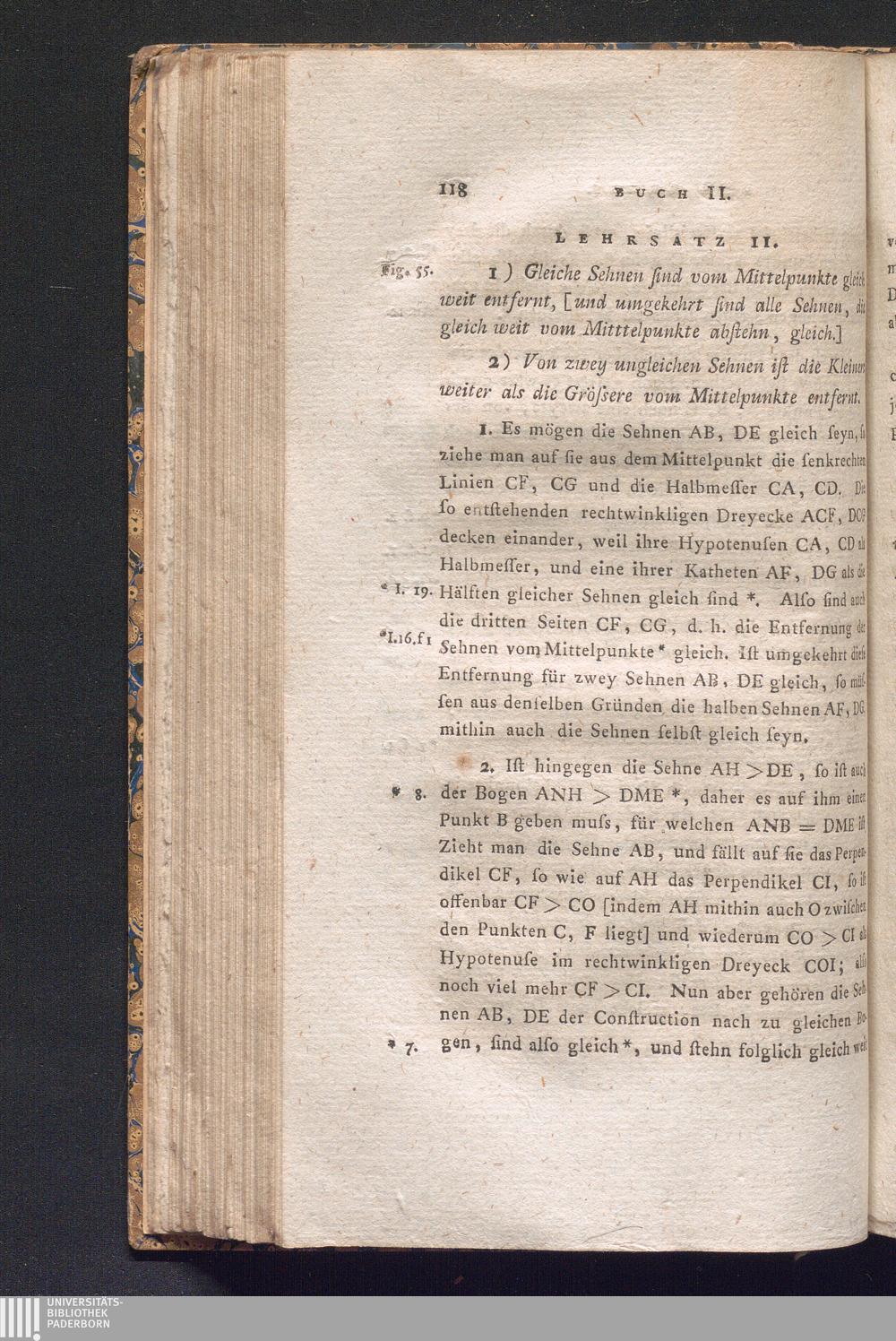 Lehrsatz 11. 1) Gleiche Sehnen sind vom Mittelpunkt gleich weit entfernt, [und umgekehrt[...]