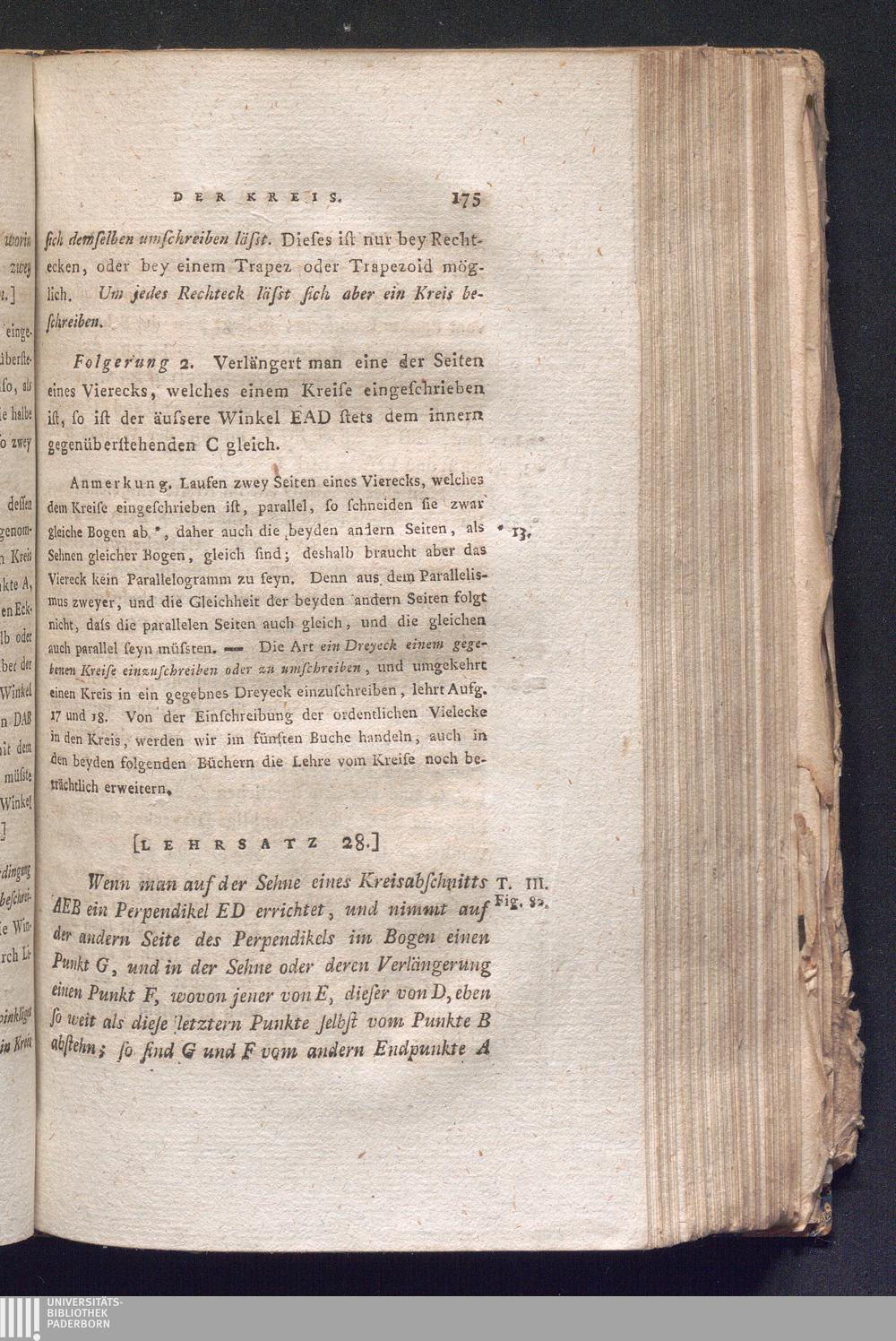 [Lehrsatz 28.] Wenn man auf der Sehne eines Kreisabschnitts AEB ein Perpendikel ED[...]