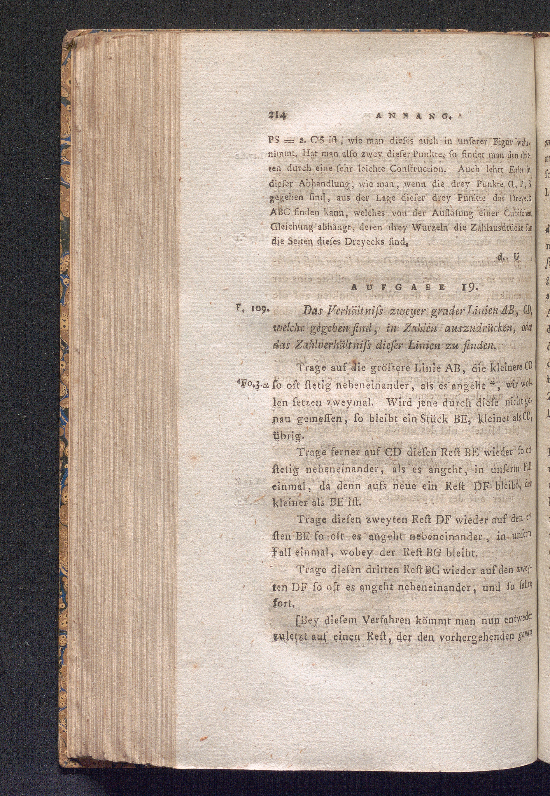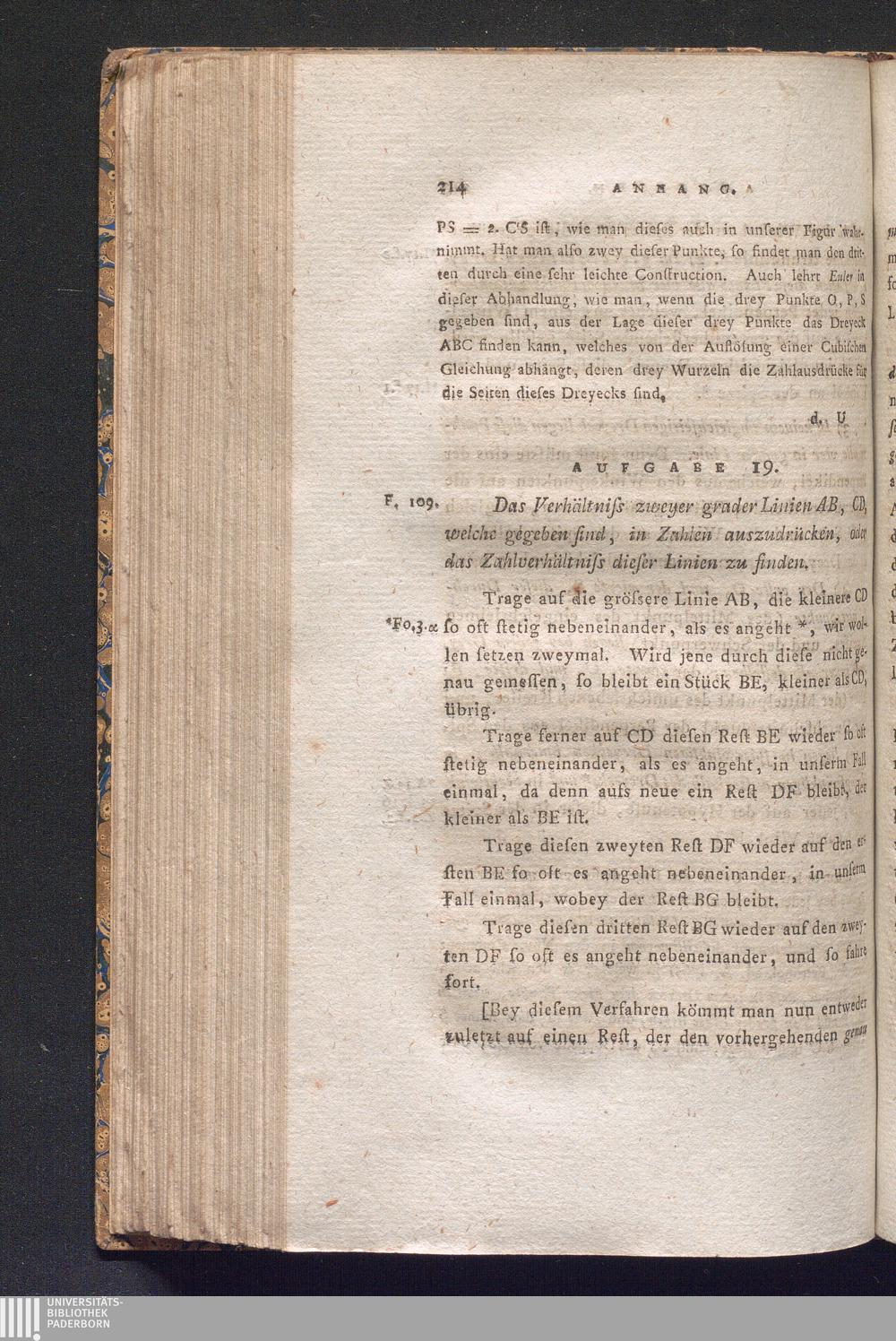 Aufgabe 19. Das Verhältnis zweyer grader Linien AB, CD, welche gegeben sind, in Zahlen[...]