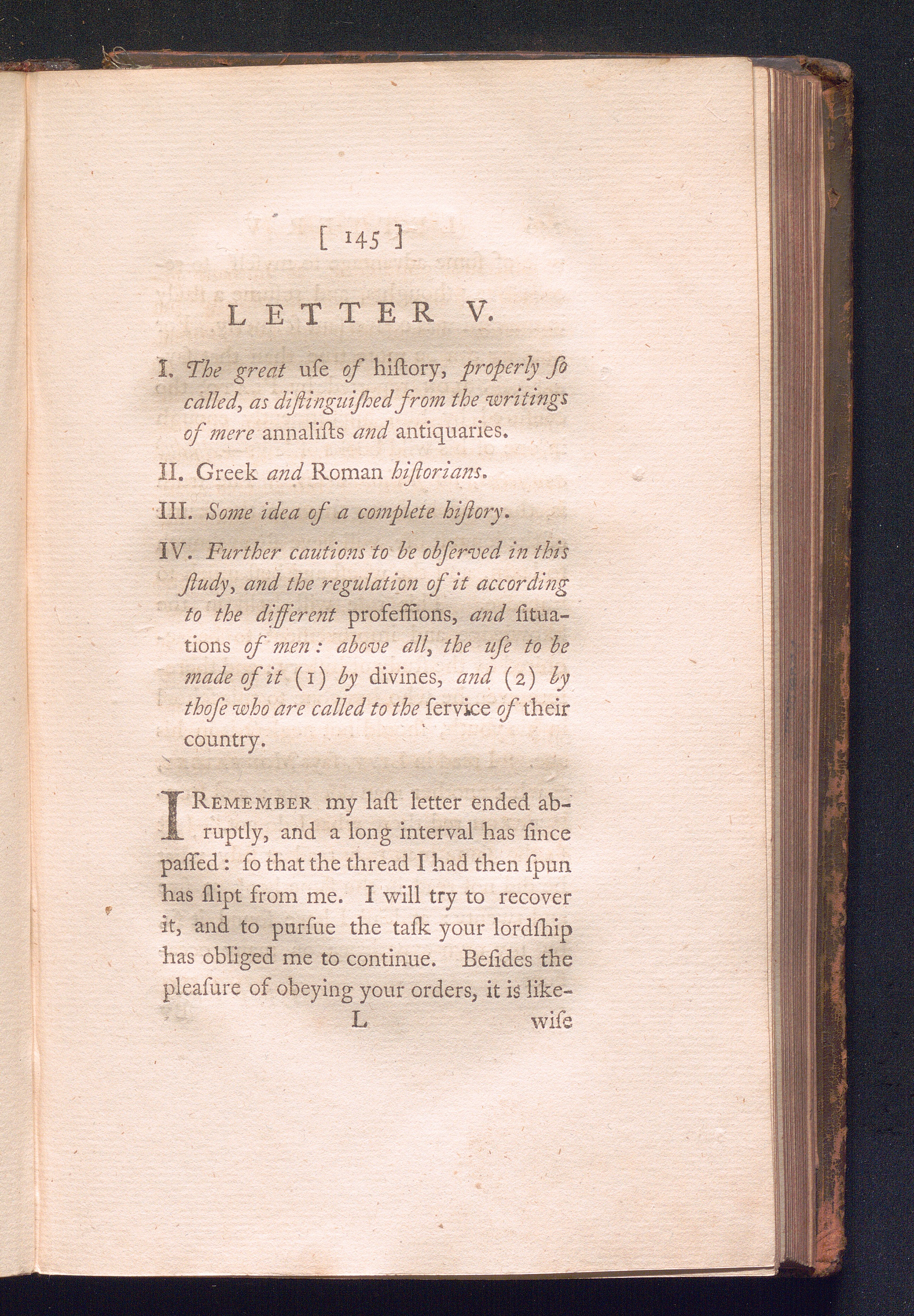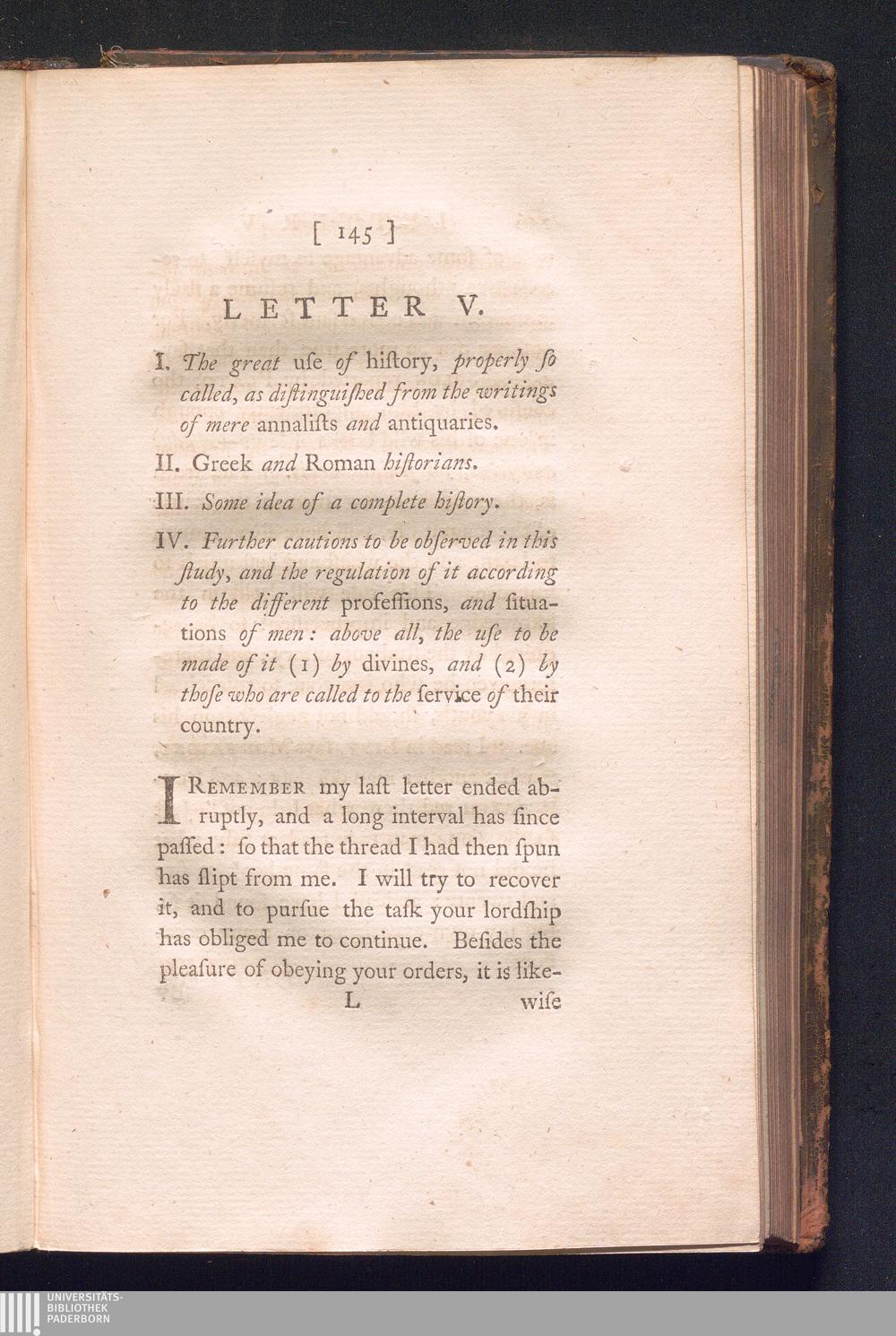 Letter V. 1. The great use of history, properly so called, as distinguished from the writings of mere annalists and antiquaries. 2. Greek and roman historians. 3. Some idea of a complete history. 4. Further cautions to be observed in this study, and the regulation of it according to the different professions, and situations of men: above all, the use to be made of it (1) by divines, and (2) by those who are called to the service of their country.