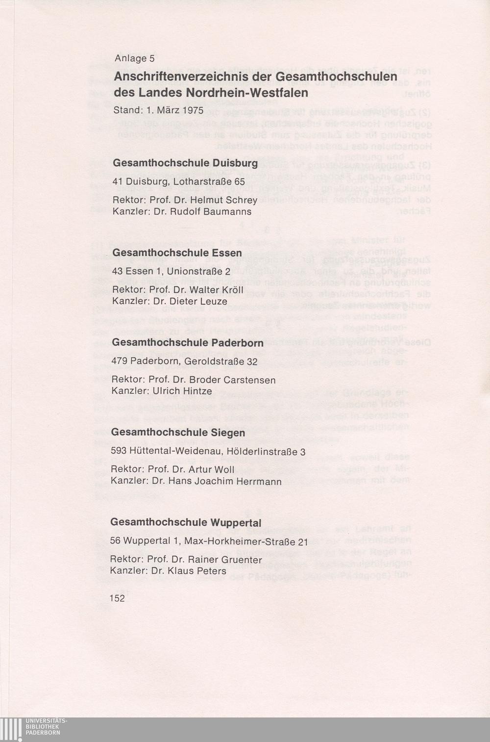Anlage 5: Anschriftenverzeichnis der Gesamthochschulen des Landes Nordrhein-Westfalen[...]