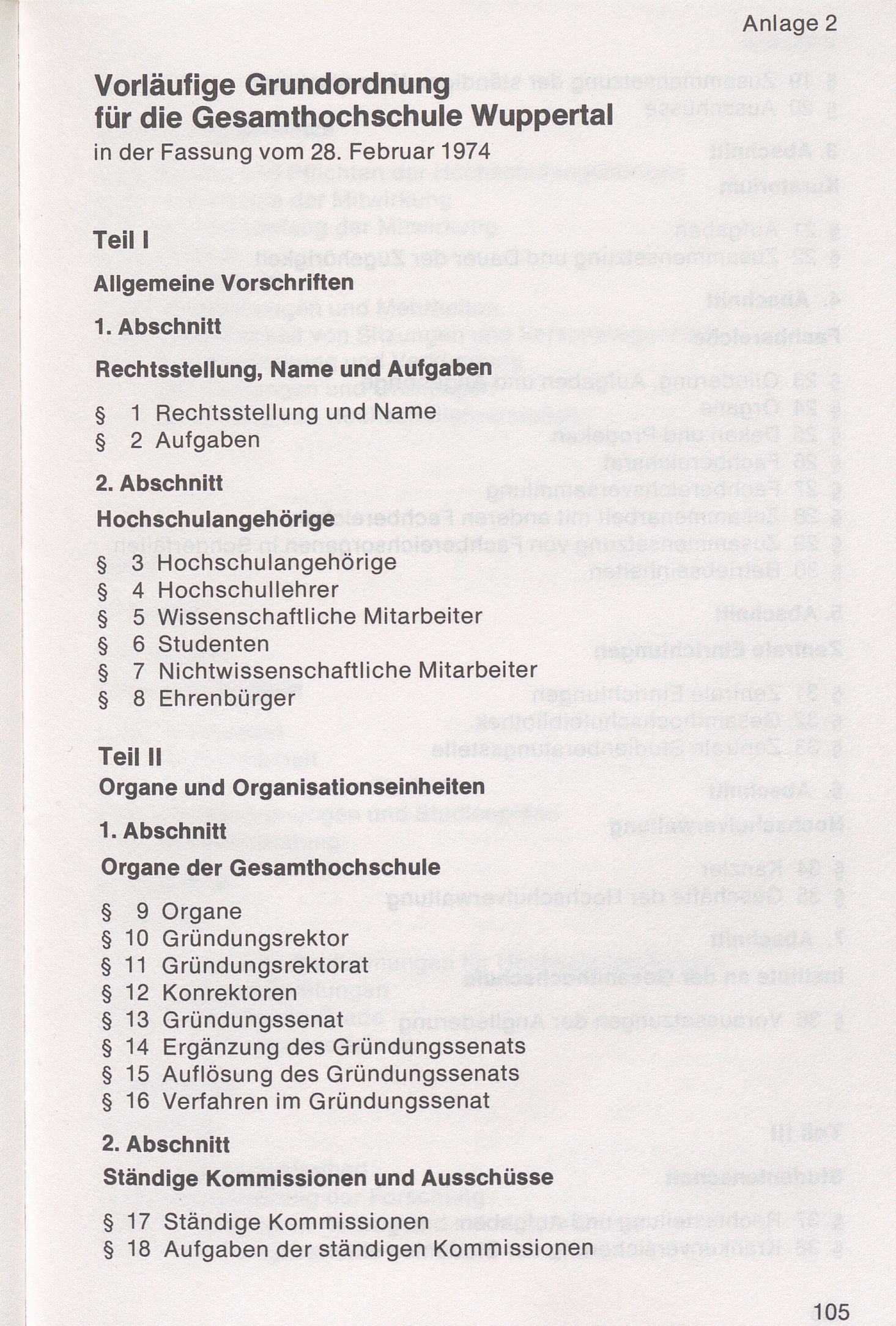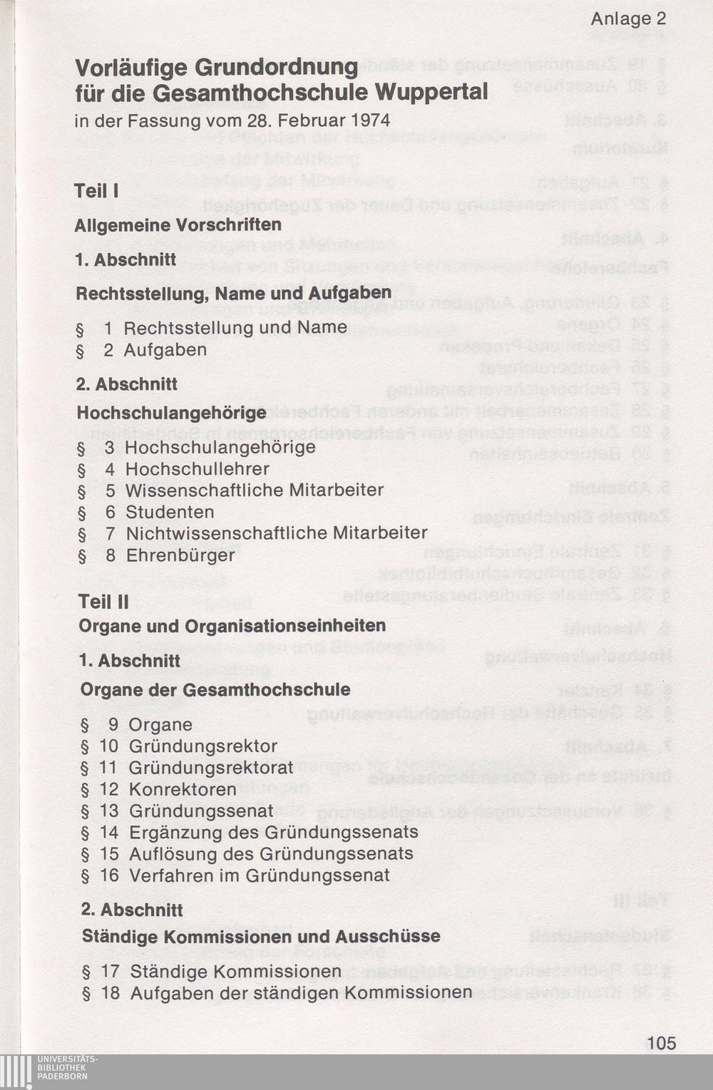 Anlage 2: Vorläufige Grundordnung für die Gesamthochschule Wuppertal in der Fassung[...]