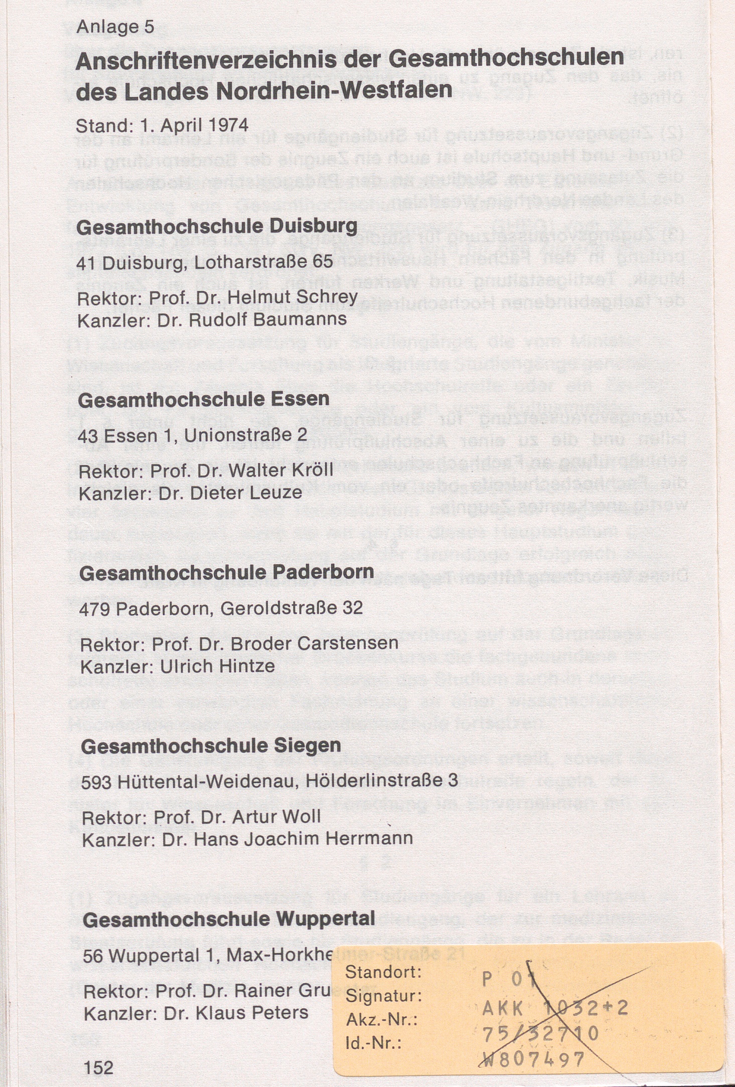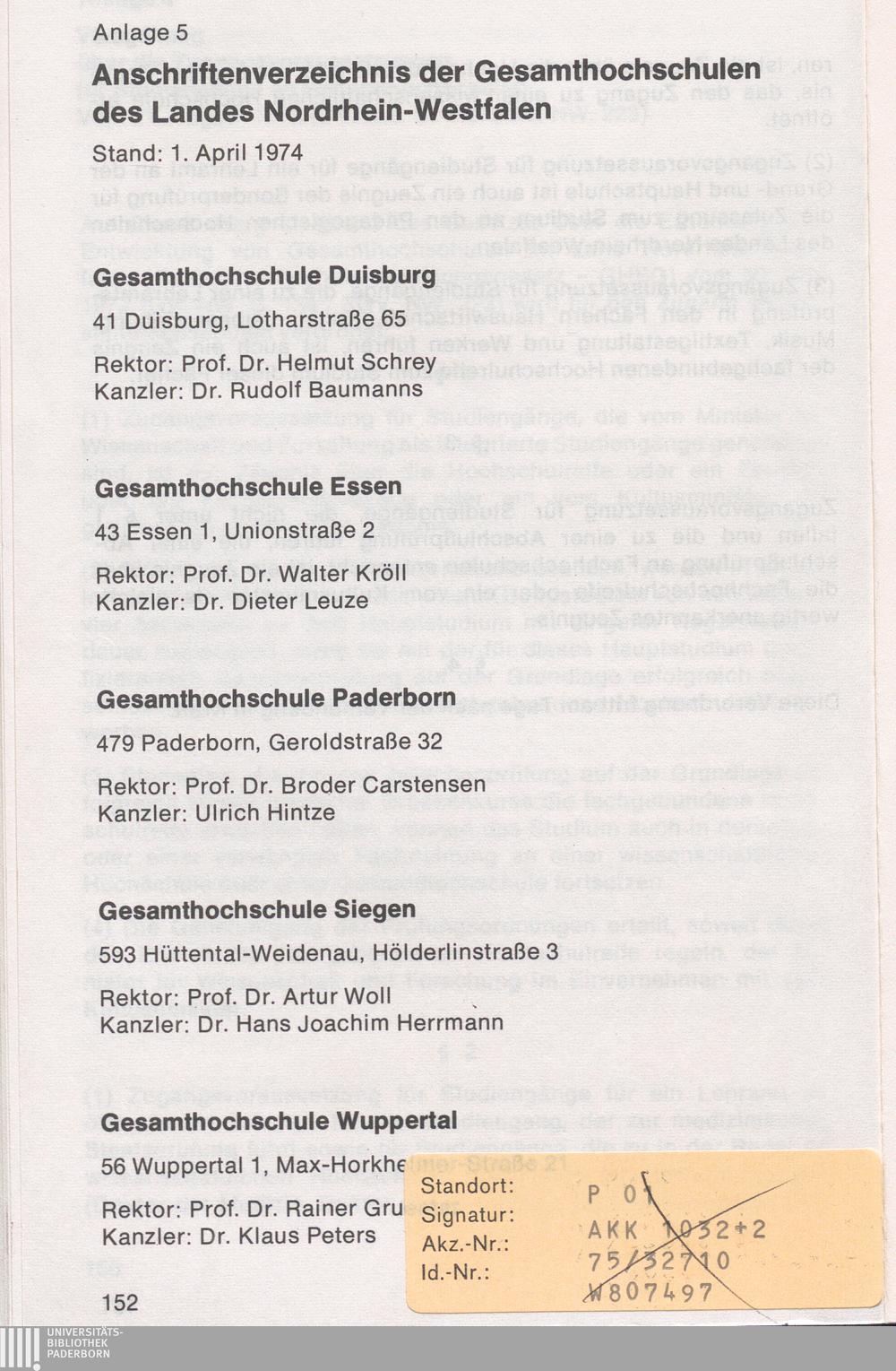 Anlage 5: Anschriftenverzeichnis der Gesamthochschulen des Landes Nordrhein-Westfalen.[...]