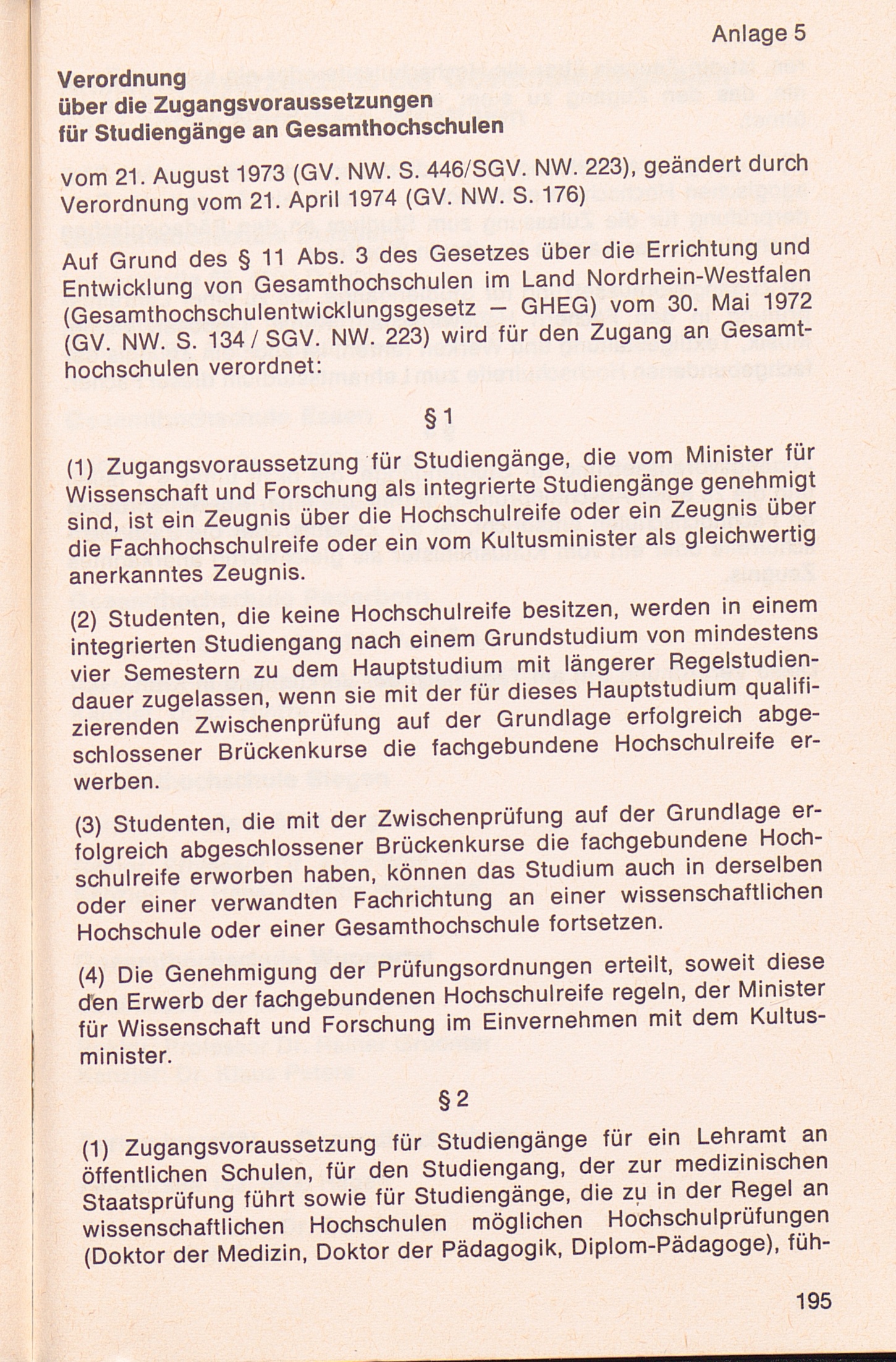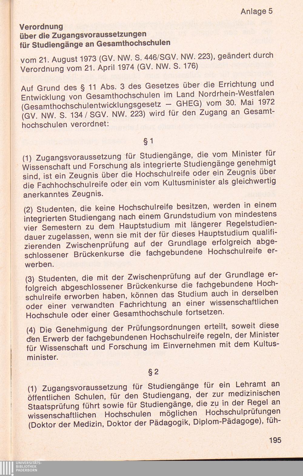 Anlage 5: Verordnung über die Zugangsvoraussetzungen für Studiengänge an Gesamthochschulen[...]