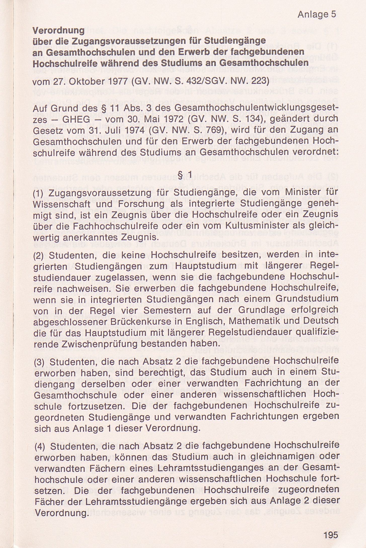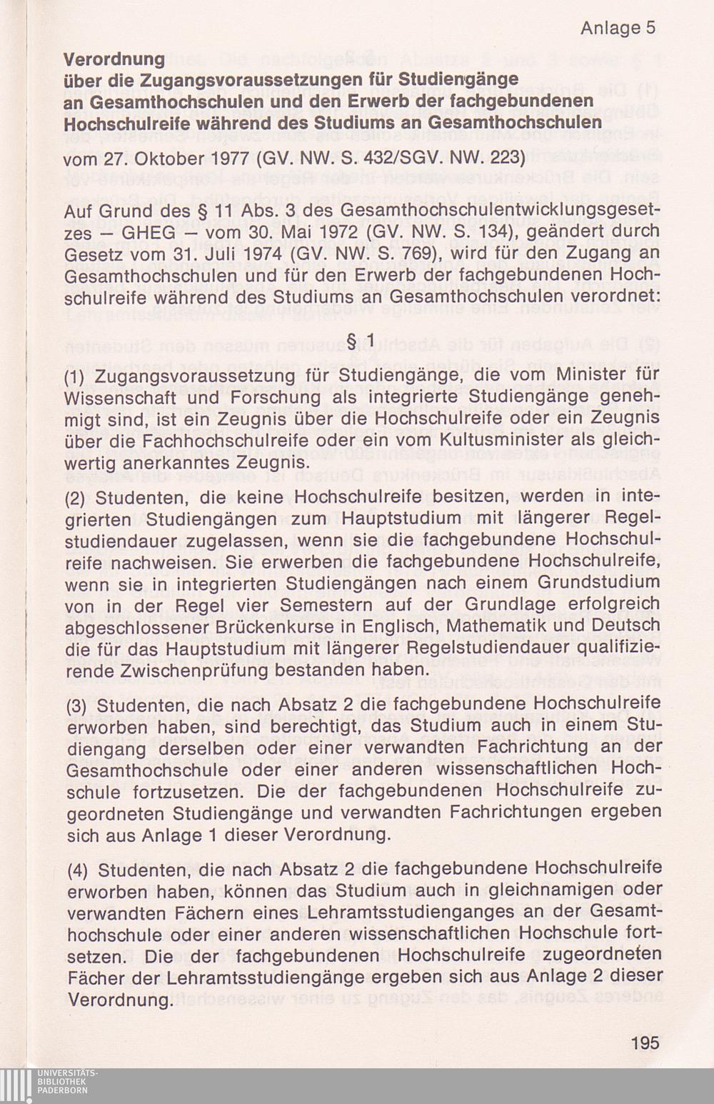 Anlage 5: Verordnung über die Zugangsvoraussetzungen für Studiengänge an Gesamthochschulen[...]