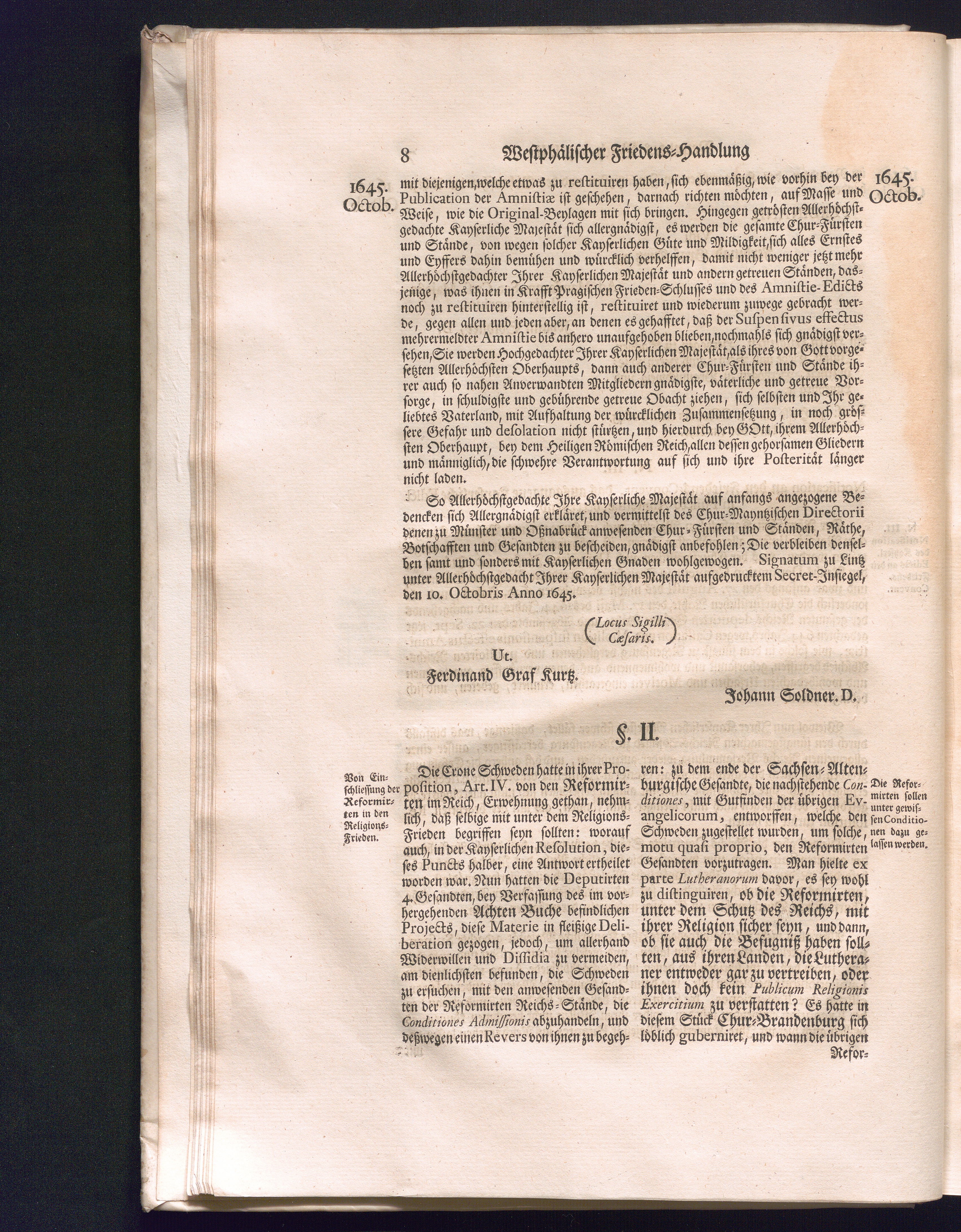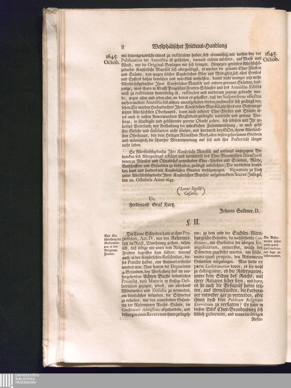 Zweyter Theil (1734) Worinnen enthalten, was vom Monath October Anno 1645. biß in den Monath Martium Ann. 1646. zwischen Jhro Römisch-Kayserlichen Majestät, dann den Beyden Cronen Franckreich und Schweden, ingleichen des Heiligen Römischen Reichs Chur-Fürsten, Fürsten und Ständen, zu Oßnabrück und Münster gehandelt worden