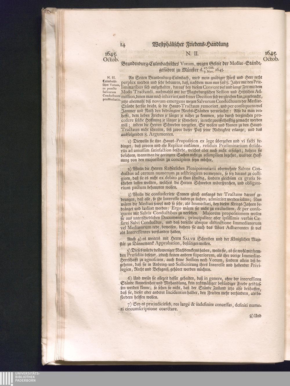 Zweyter Theil (1734) Worinnen enthalten, was vom Monath October Anno 1645. biß in den Monath Martium Ann. 1646. zwischen Jhro Römisch-Kayserlichen Majestät, dann den Beyden Cronen Franckreich und Schweden, ingleichen des Heiligen Römischen Reichs Chur-Fürsten, Fürsten und Ständen, zu Oßnabrück und Münster gehandelt worden