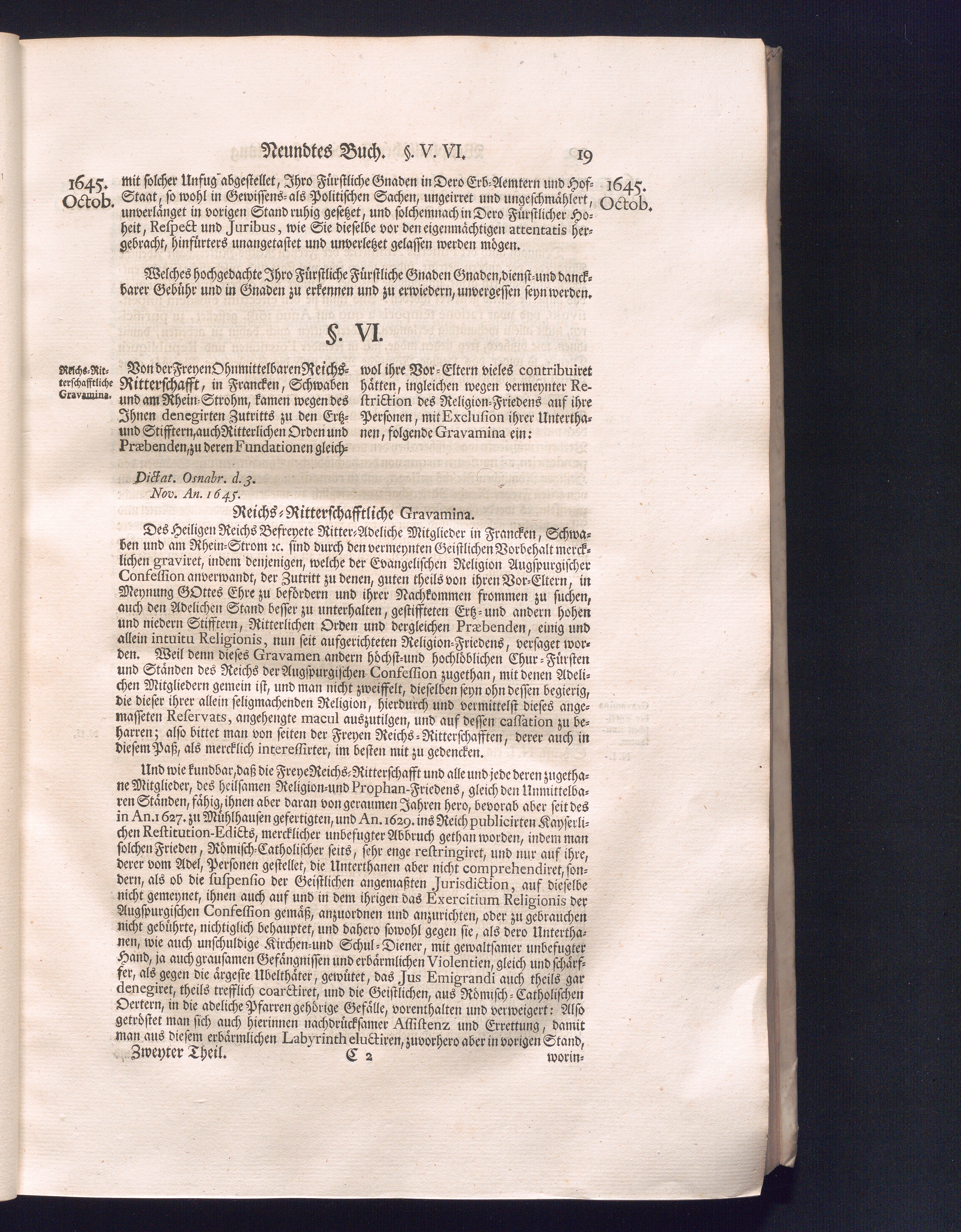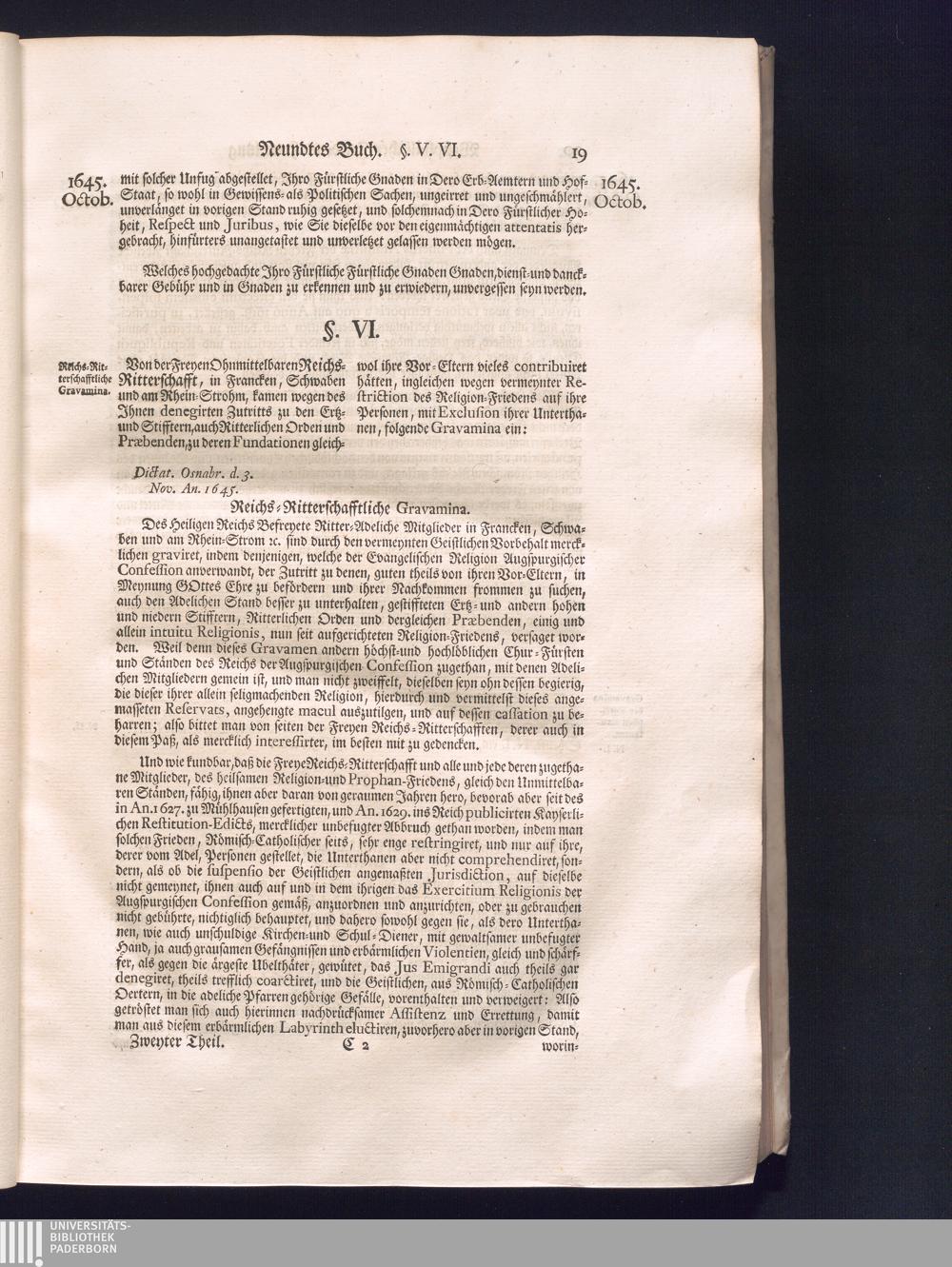 Zweyter Theil (1734) Worinnen enthalten, was vom Monath October Anno 1645. biß in den Monath Martium Ann. 1646. zwischen Jhro Römisch-Kayserlichen Majestät, dann den Beyden Cronen Franckreich und Schweden, ingleichen des Heiligen Römischen Reichs Chur-Fürsten, Fürsten und Ständen, zu Oßnabrück und Münster gehandelt worden