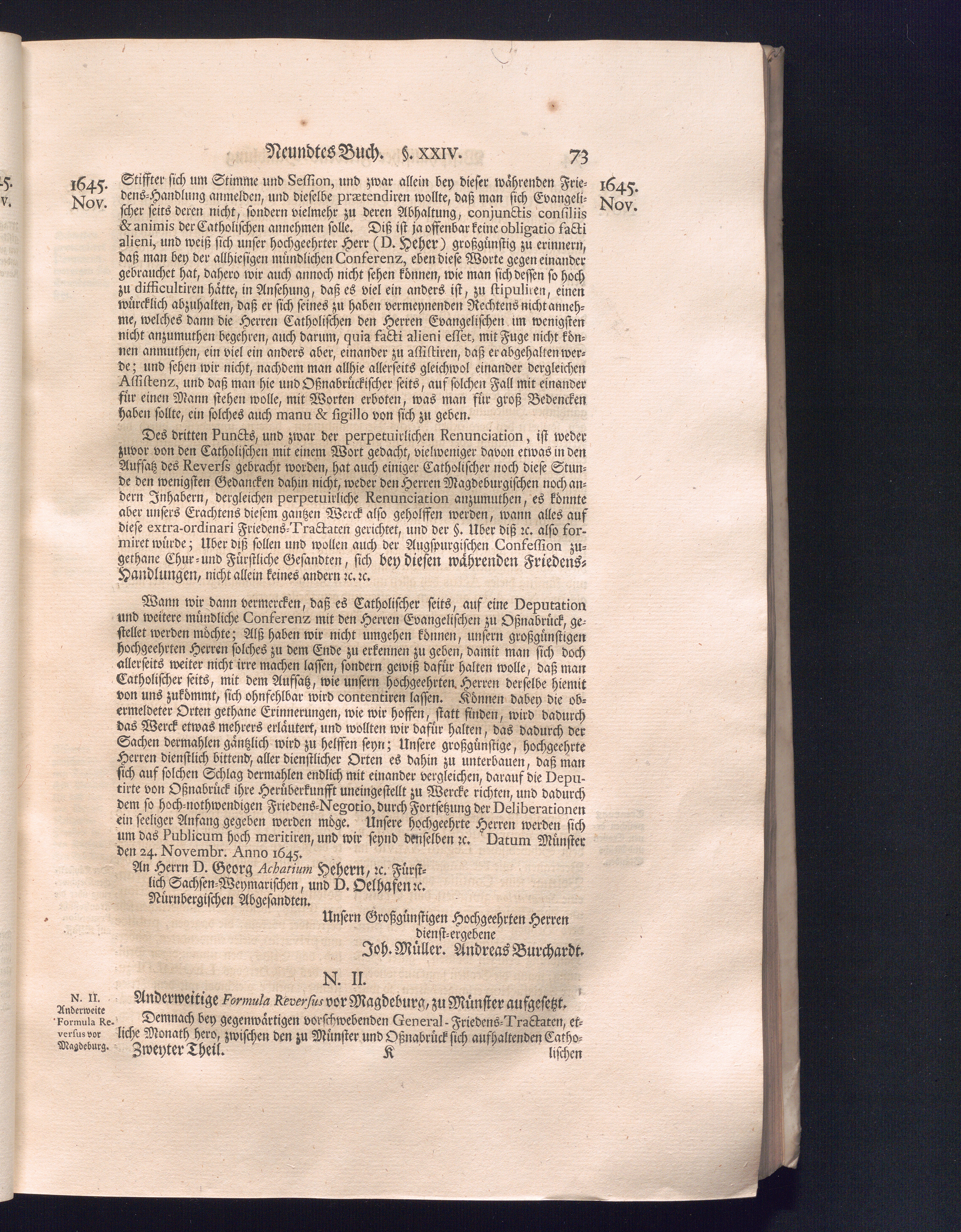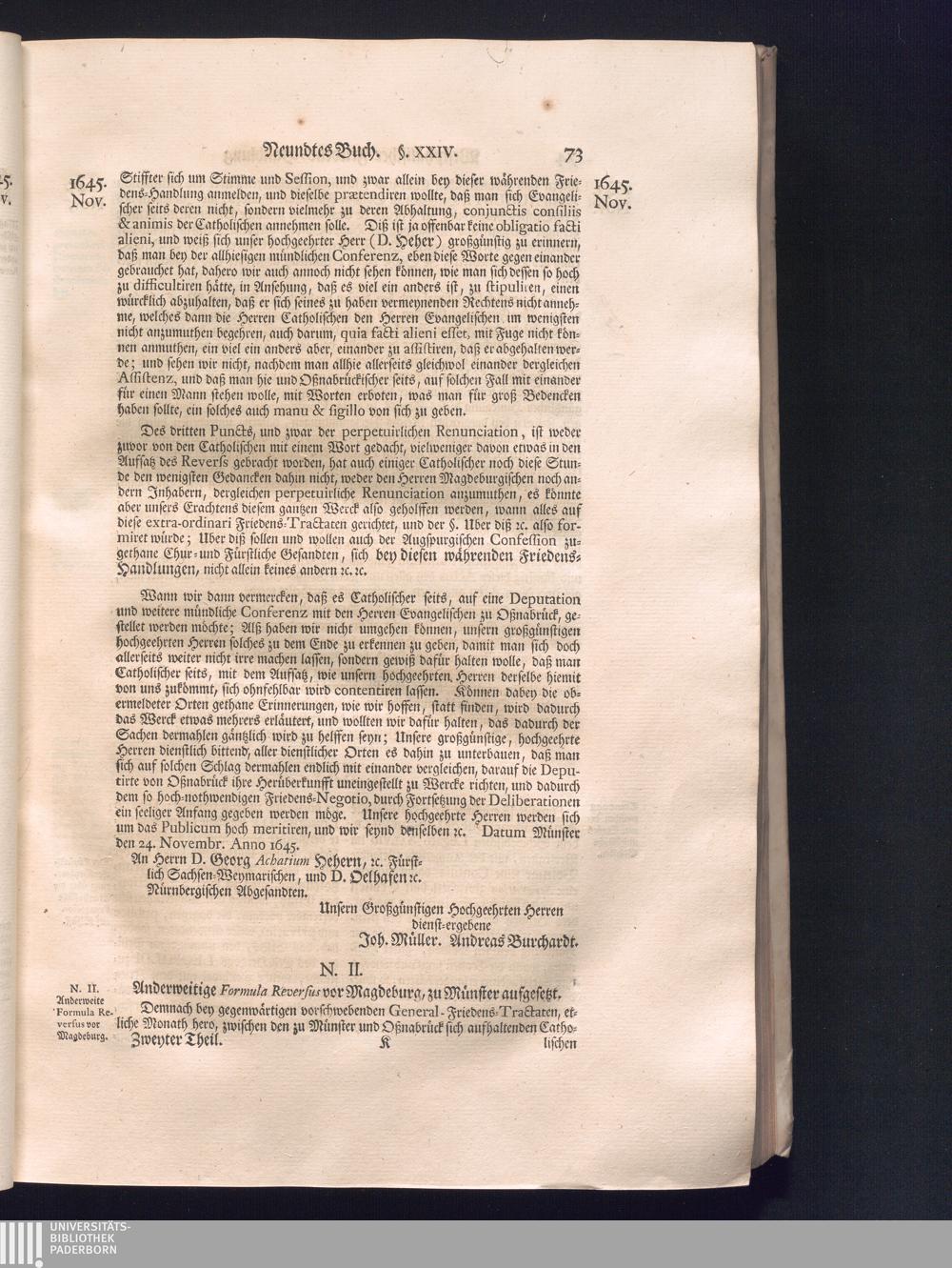 Zweyter Theil (1734) Worinnen enthalten, was vom Monath October Anno 1645. biß in den Monath Martium Ann. 1646. zwischen Jhro Römisch-Kayserlichen Majestät, dann den Beyden Cronen Franckreich und Schweden, ingleichen des Heiligen Römischen Reichs Chur-Fürsten, Fürsten und Ständen, zu Oßnabrück und Münster gehandelt worden