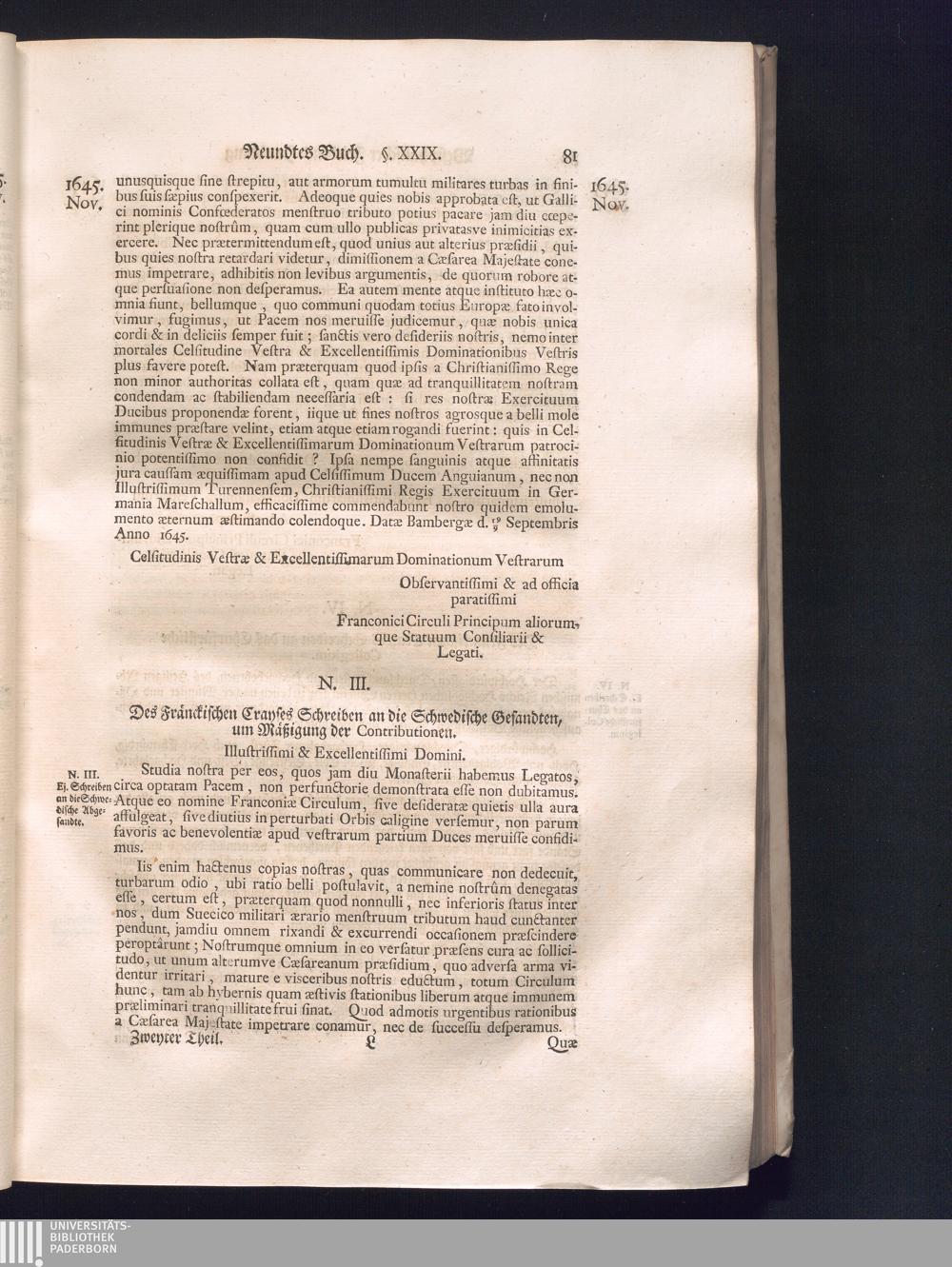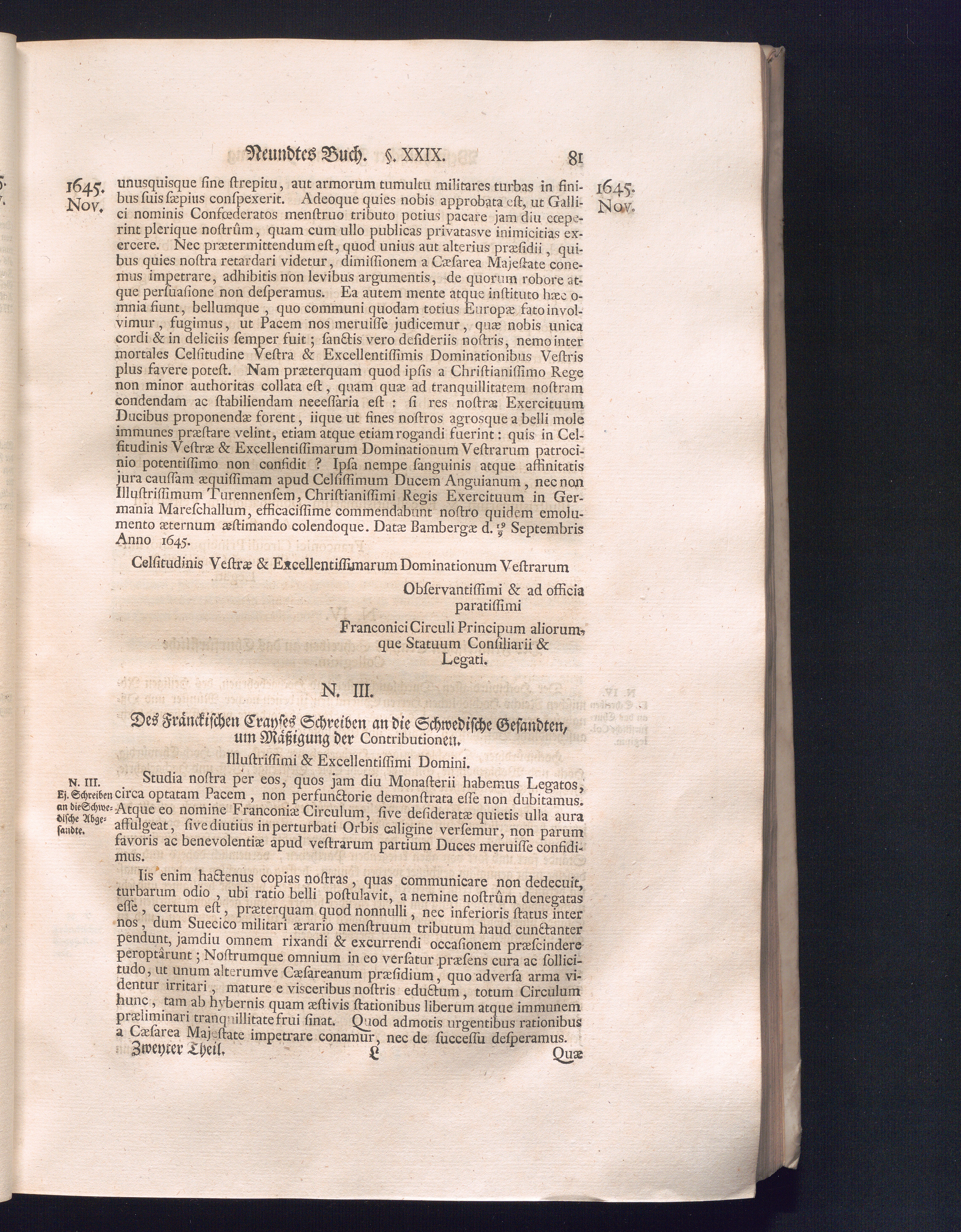 Zweyter Theil (1734) Worinnen enthalten, was vom Monath October Anno 1645. biß in den Monath Martium Ann. 1646. zwischen Jhro Römisch-Kayserlichen Majestät, dann den Beyden Cronen Franckreich und Schweden, ingleichen des Heiligen Römischen Reichs Chur-Fürsten, Fürsten und Ständen, zu Oßnabrück und Münster gehandelt worden
