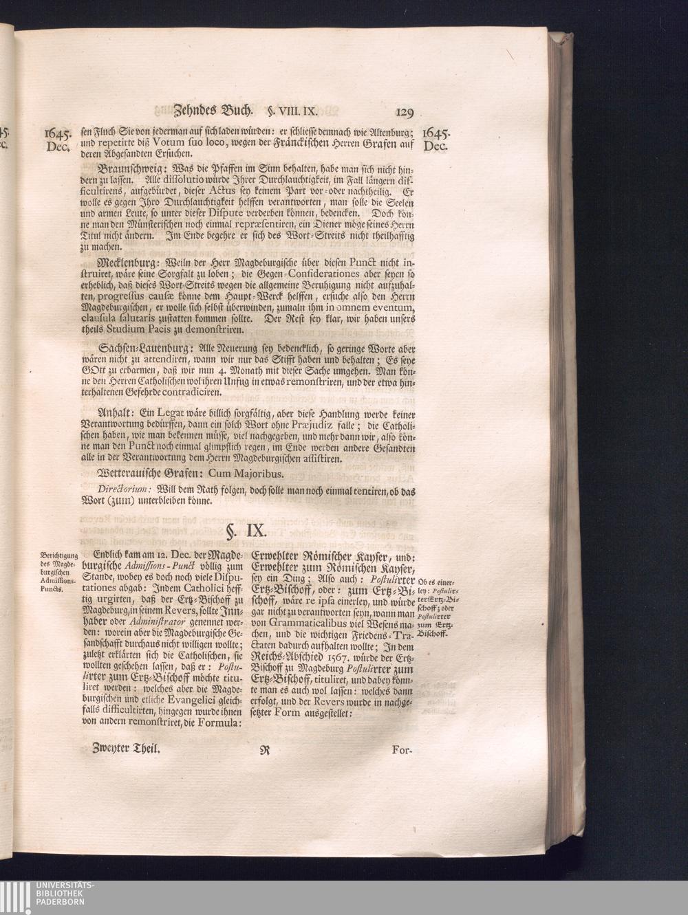 Zweyter Theil (1734) Worinnen enthalten, was vom Monath October Anno 1645. biß in den Monath Martium Ann. 1646. zwischen Jhro Römisch-Kayserlichen Majestät, dann den Beyden Cronen Franckreich und Schweden, ingleichen des Heiligen Römischen Reichs Chur-Fürsten, Fürsten und Ständen, zu Oßnabrück und Münster gehandelt worden