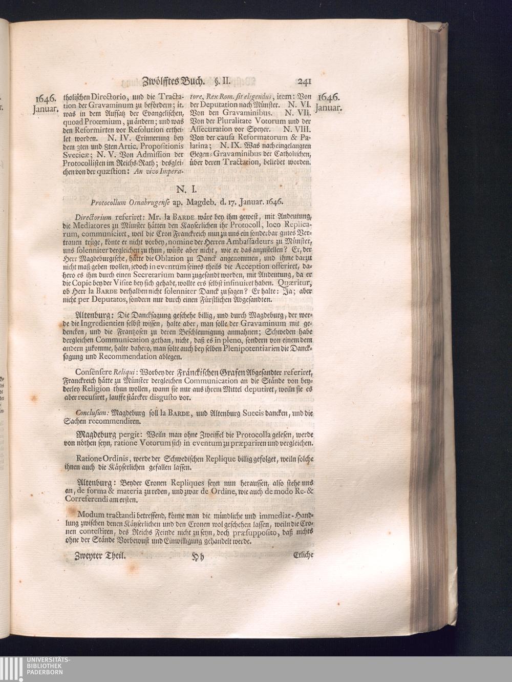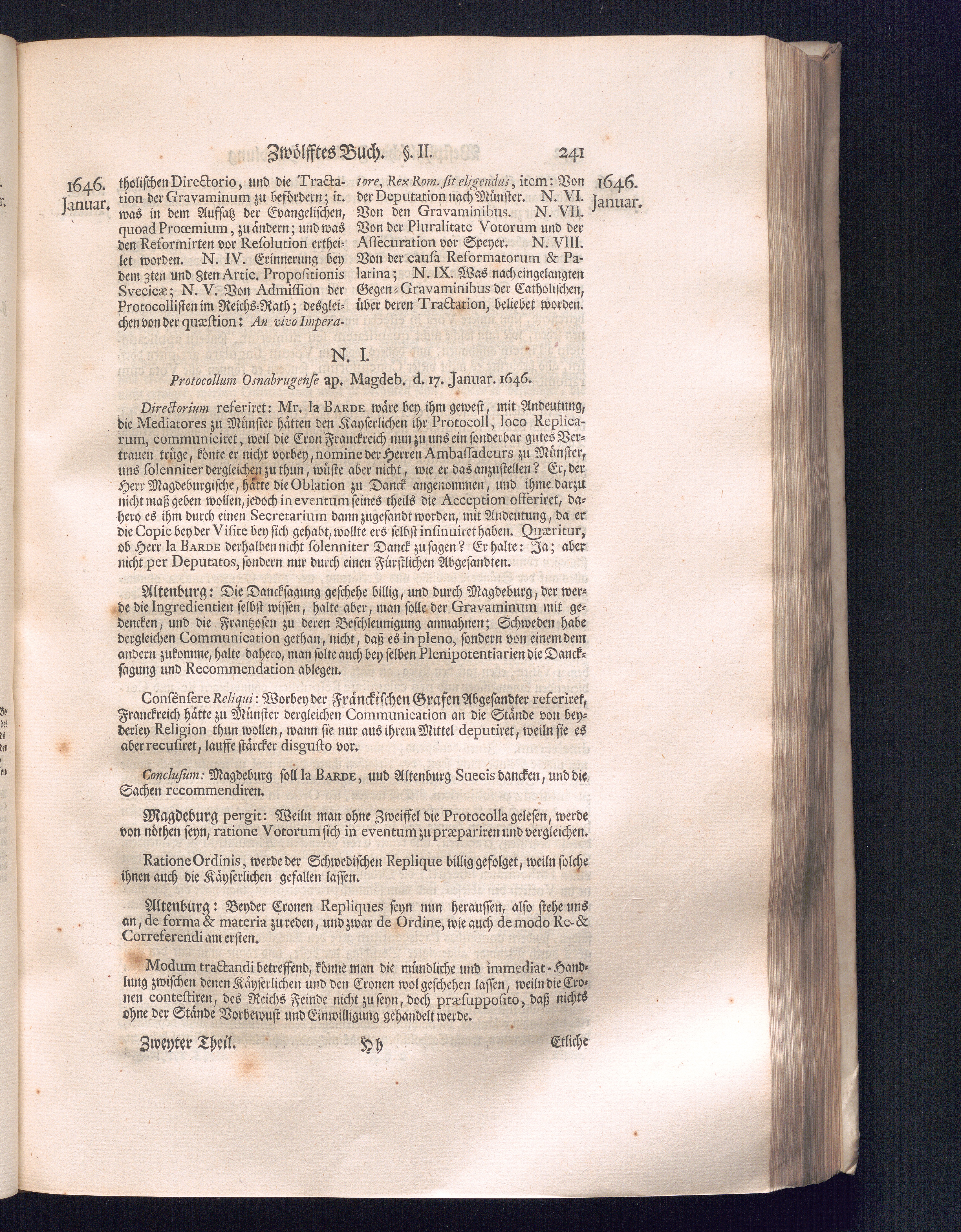 Zweyter Theil (1734) Worinnen enthalten, was vom Monath October Anno 1645. biß in den Monath Martium Ann. 1646. zwischen Jhro Römisch-Kayserlichen Majestät, dann den Beyden Cronen Franckreich und Schweden, ingleichen des Heiligen Römischen Reichs Chur-Fürsten, Fürsten und Ständen, zu Oßnabrück und Münster gehandelt worden