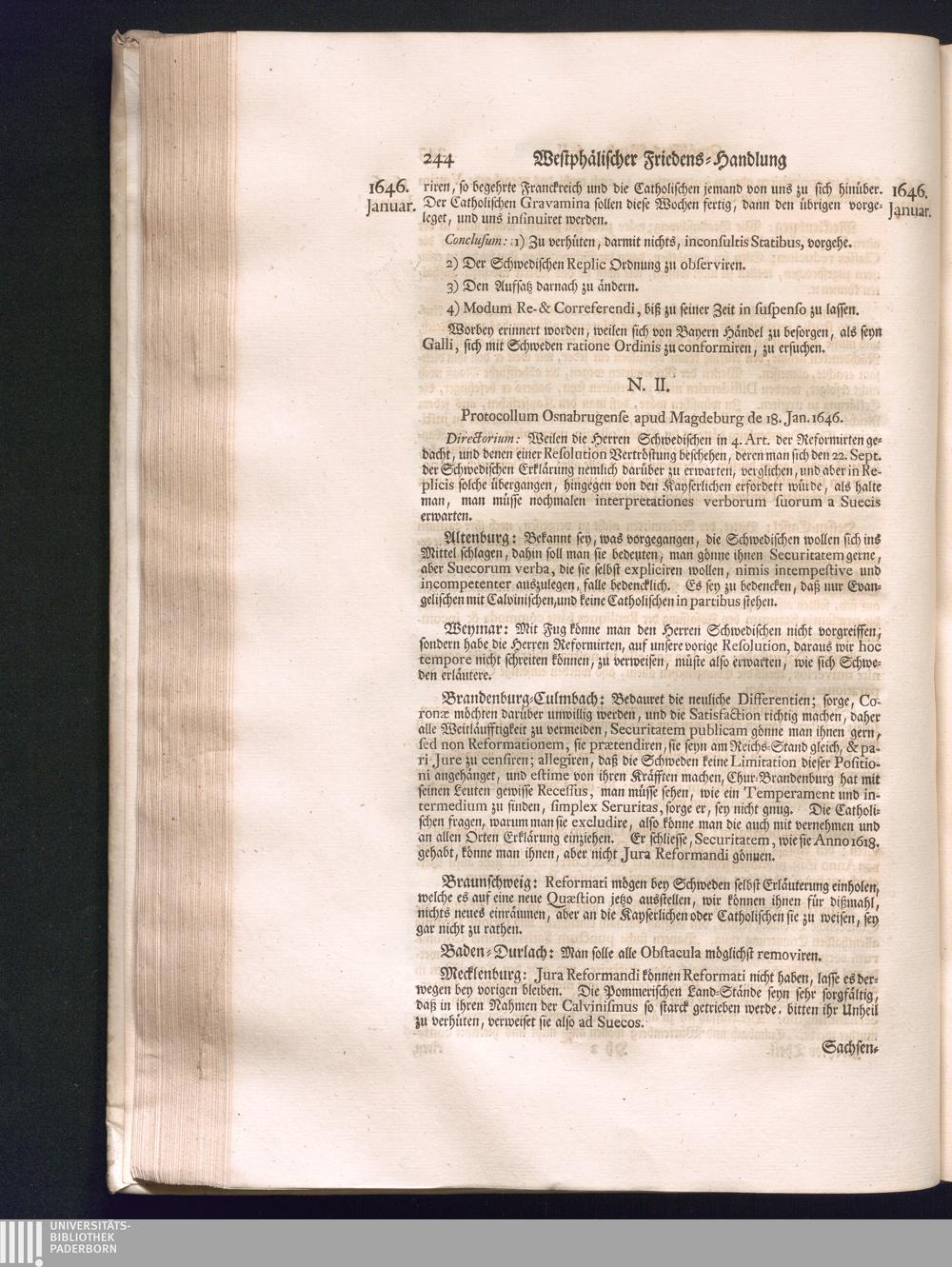 Zweyter Theil (1734) Worinnen enthalten, was vom Monath October Anno 1645. biß in den Monath Martium Ann. 1646. zwischen Jhro Römisch-Kayserlichen Majestät, dann den Beyden Cronen Franckreich und Schweden, ingleichen des Heiligen Römischen Reichs Chur-Fürsten, Fürsten und Ständen, zu Oßnabrück und Münster gehandelt worden