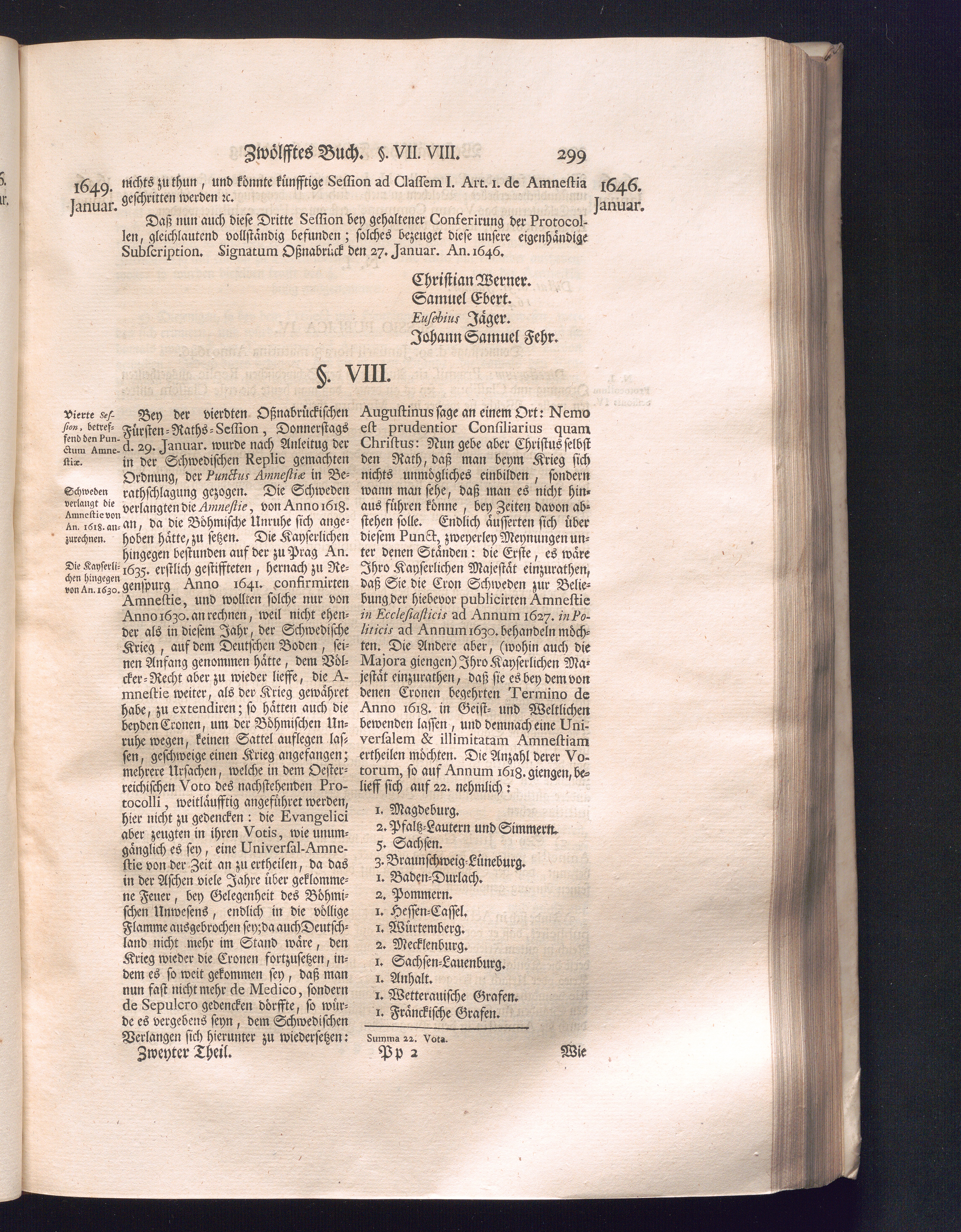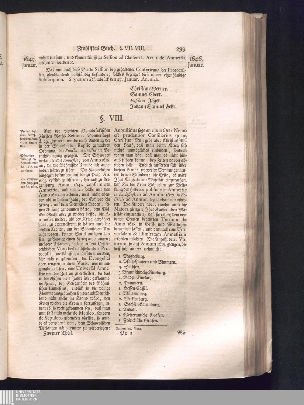 Zweyter Theil (1734) Worinnen enthalten, was vom Monath October Anno 1645. biß in den Monath Martium Ann. 1646. zwischen Jhro Römisch-Kayserlichen Majestät, dann den Beyden Cronen Franckreich und Schweden, ingleichen des Heiligen Römischen Reichs Chur-Fürsten, Fürsten und Ständen, zu Oßnabrück und Münster gehandelt worden