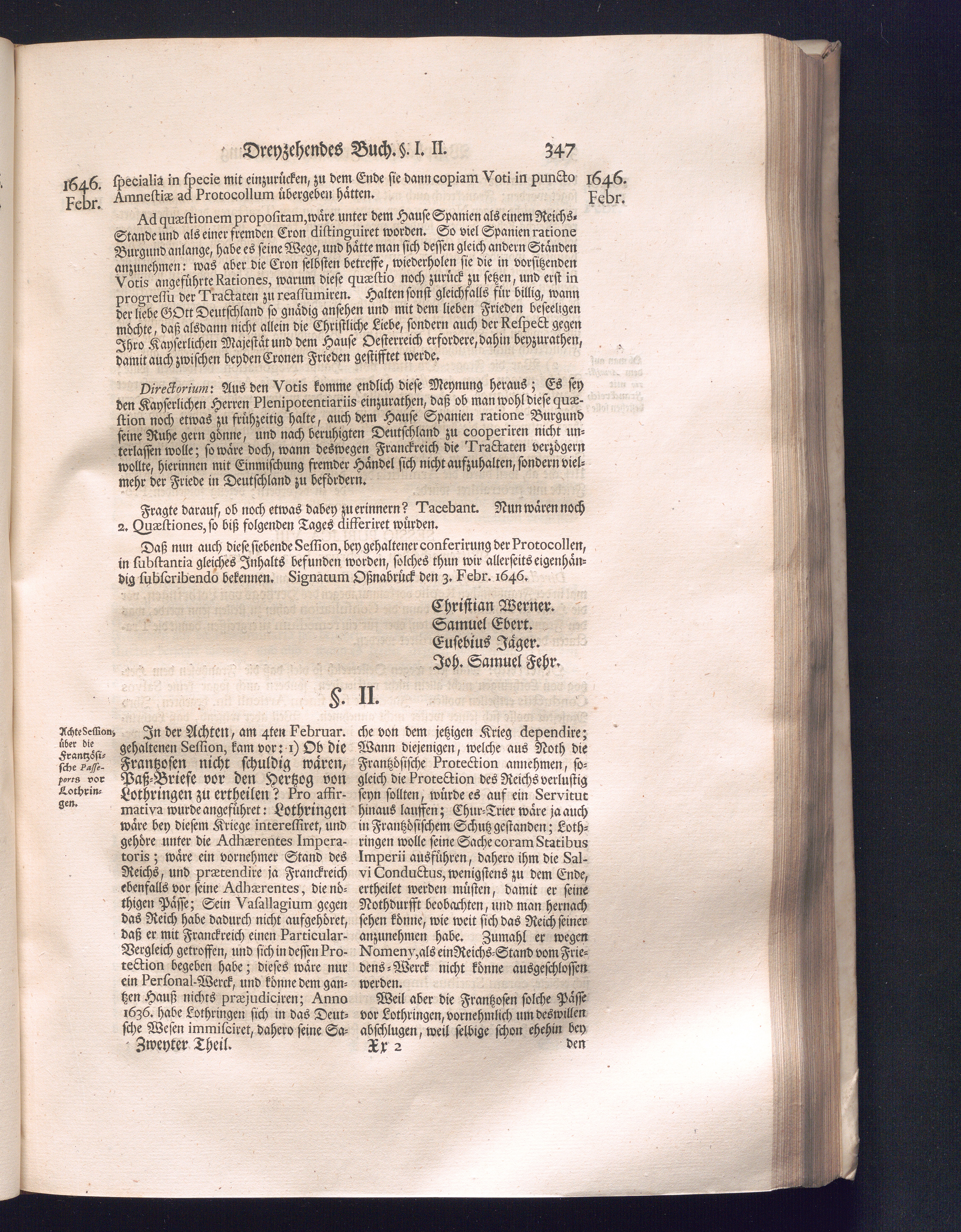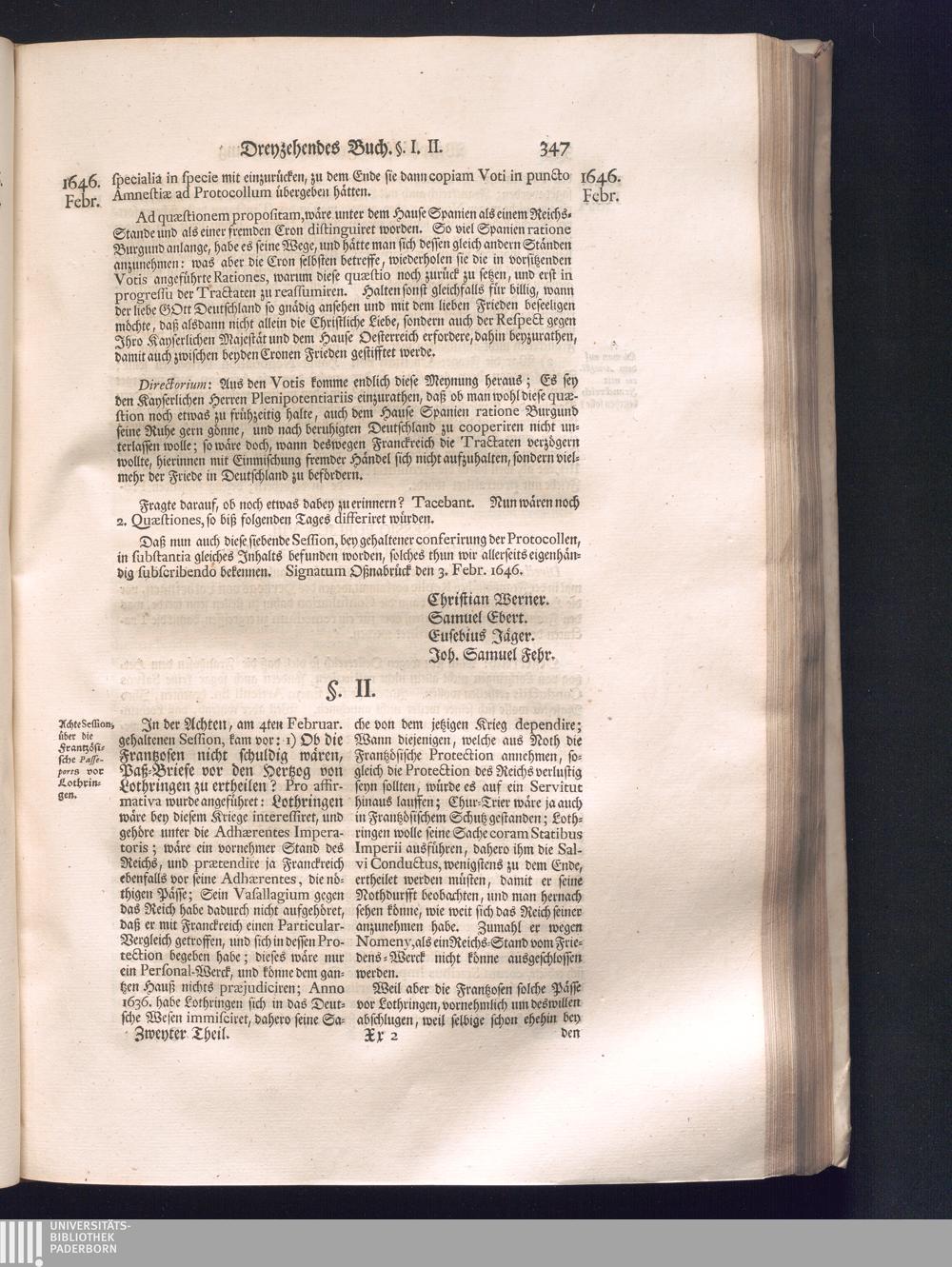 Zweyter Theil (1734) Worinnen enthalten, was vom Monath October Anno 1645. biß in den Monath Martium Ann. 1646. zwischen Jhro Römisch-Kayserlichen Majestät, dann den Beyden Cronen Franckreich und Schweden, ingleichen des Heiligen Römischen Reichs Chur-Fürsten, Fürsten und Ständen, zu Oßnabrück und Münster gehandelt worden
