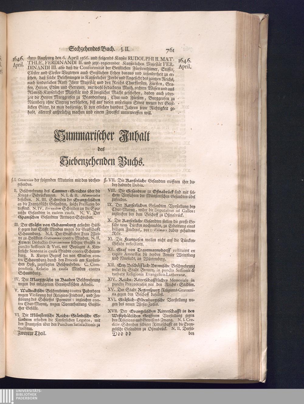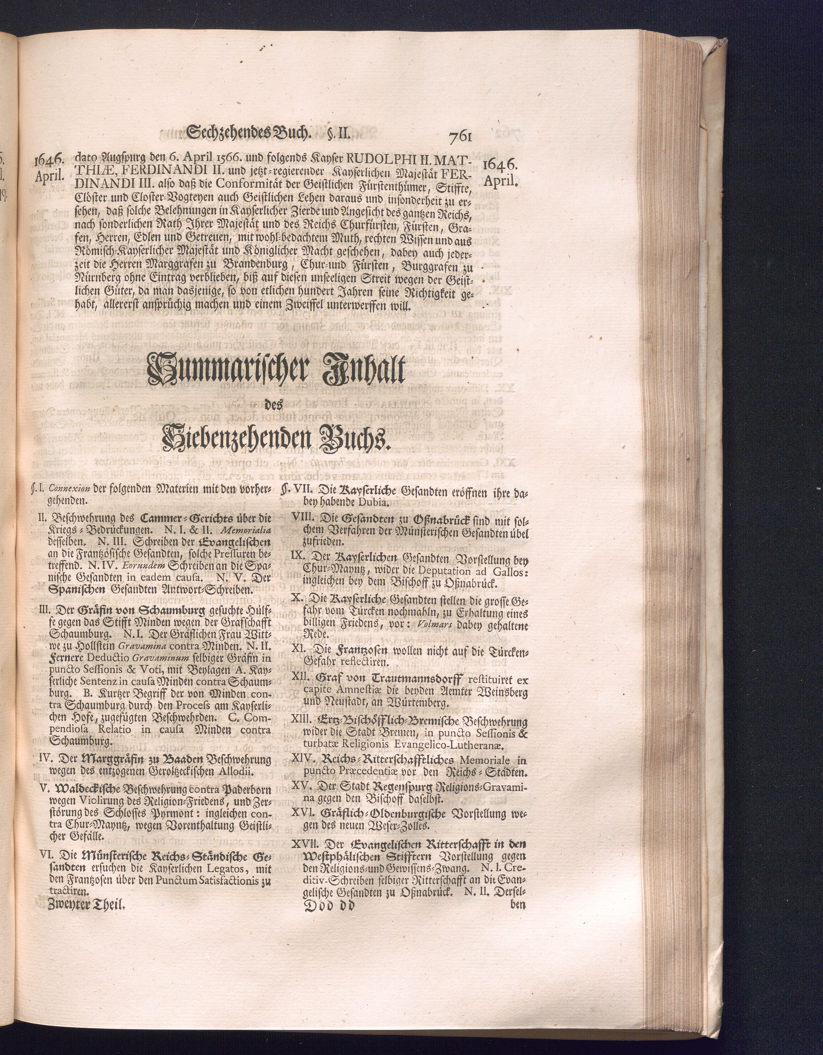 Zweyter Theil (1734) Worinnen enthalten, was vom Monath October Anno 1645. biß in den Monath Martium Ann. 1646. zwischen Jhro Römisch-Kayserlichen Majestät, dann den Beyden Cronen Franckreich und Schweden, ingleichen des Heiligen Römischen Reichs Chur-Fürsten, Fürsten und Ständen, zu Oßnabrück und Münster gehandelt worden