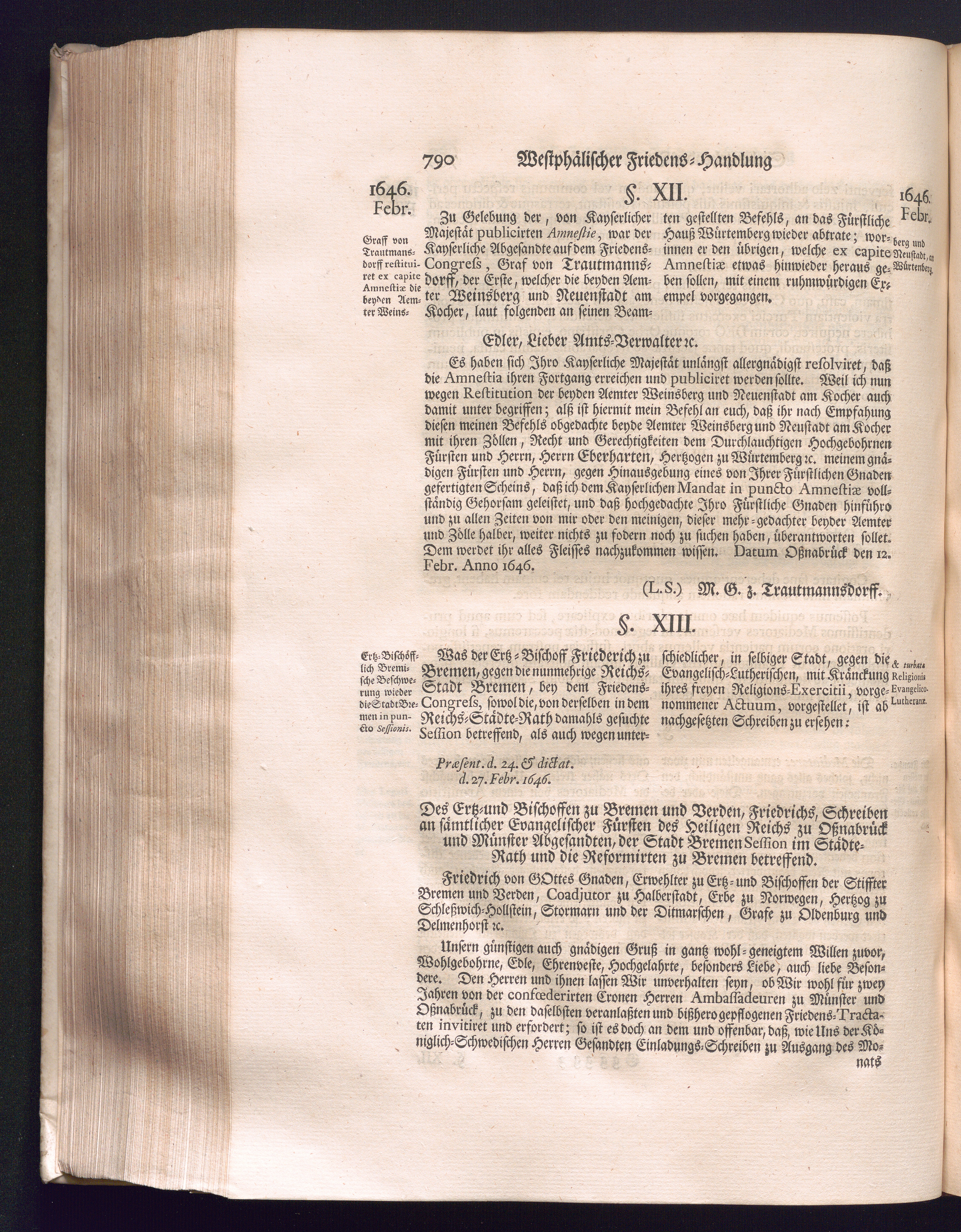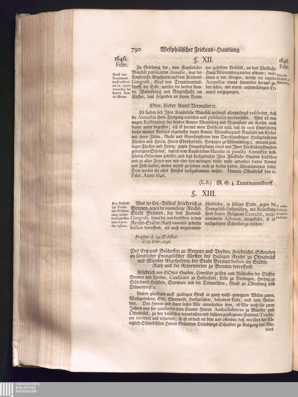 Zweyter Theil (1734) Worinnen enthalten, was vom Monath October Anno 1645. biß in den Monath Martium Ann. 1646. zwischen Jhro Römisch-Kayserlichen Majestät, dann den Beyden Cronen Franckreich und Schweden, ingleichen des Heiligen Römischen Reichs Chur-Fürsten, Fürsten und Ständen, zu Oßnabrück und Münster gehandelt worden