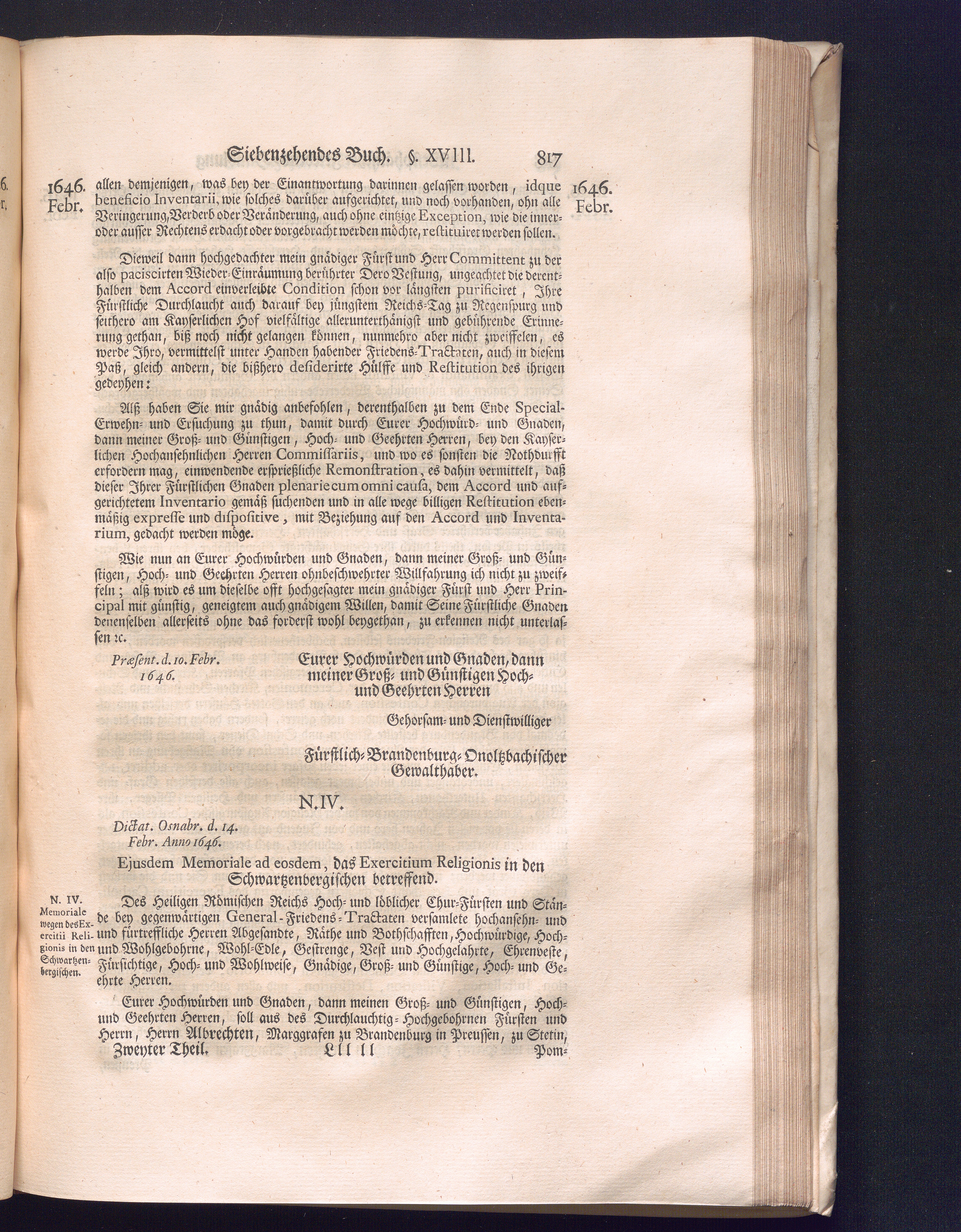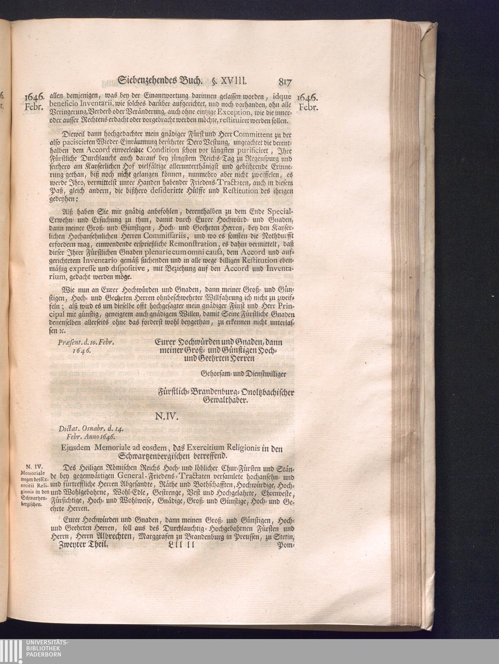 Zweyter Theil (1734) Worinnen enthalten, was vom Monath October Anno 1645. biß in den Monath Martium Ann. 1646. zwischen Jhro Römisch-Kayserlichen Majestät, dann den Beyden Cronen Franckreich und Schweden, ingleichen des Heiligen Römischen Reichs Chur-Fürsten, Fürsten und Ständen, zu Oßnabrück und Münster gehandelt worden