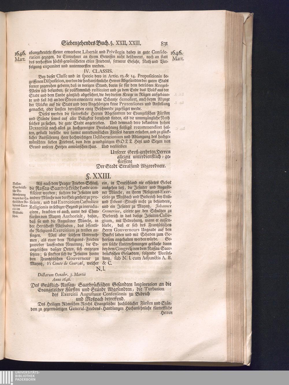 Zweyter Theil (1734) Worinnen enthalten, was vom Monath October Anno 1645. biß in den Monath Martium Ann. 1646. zwischen Jhro Römisch-Kayserlichen Majestät, dann den Beyden Cronen Franckreich und Schweden, ingleichen des Heiligen Römischen Reichs Chur-Fürsten, Fürsten und Ständen, zu Oßnabrück und Münster gehandelt worden
